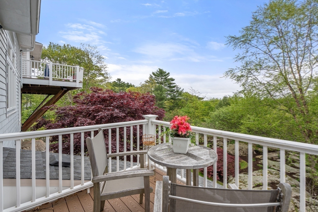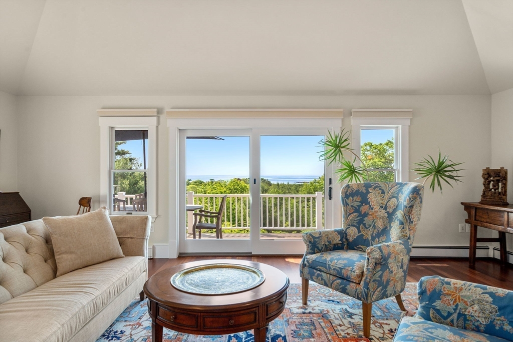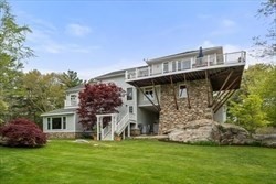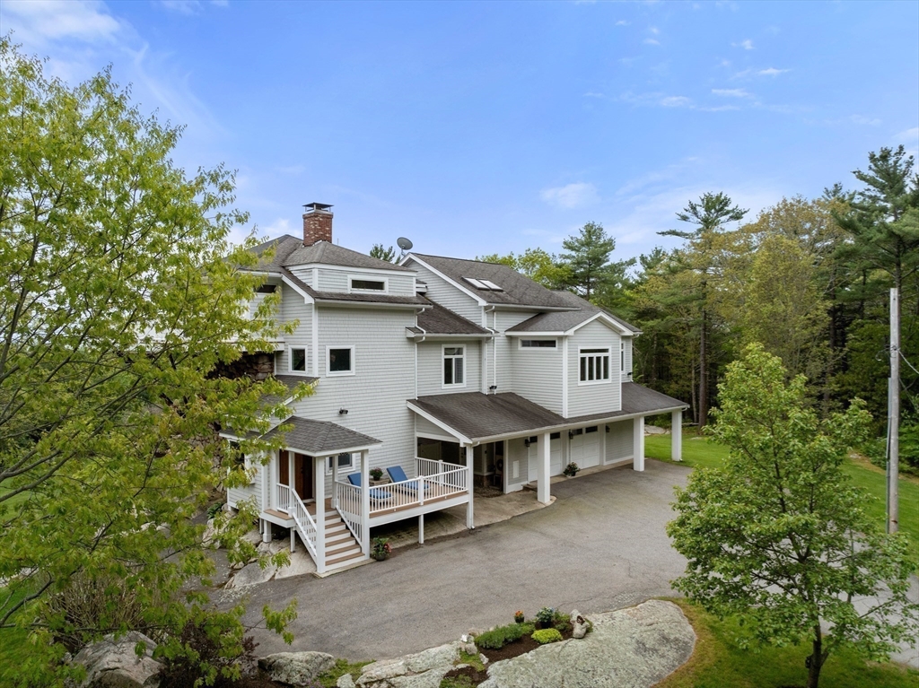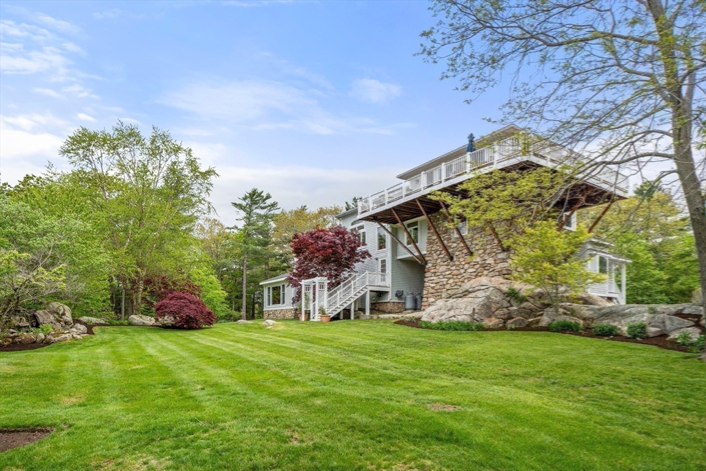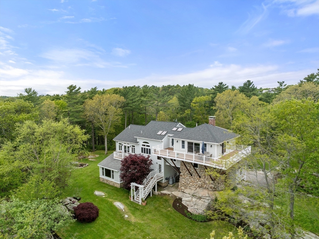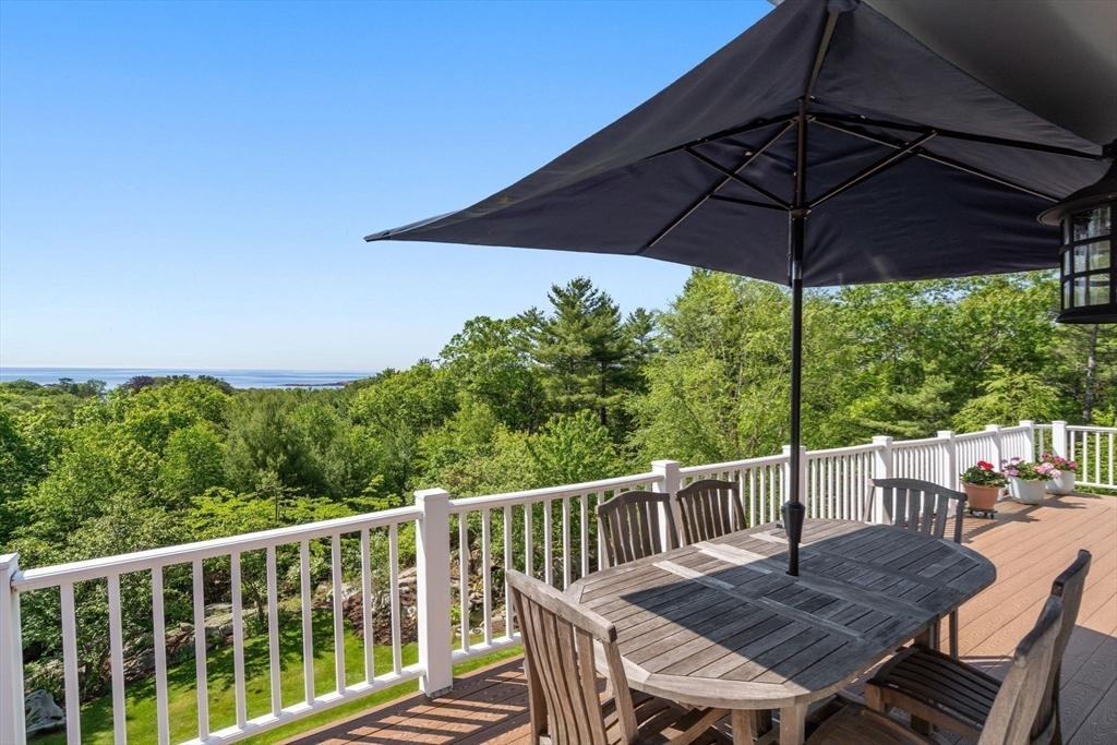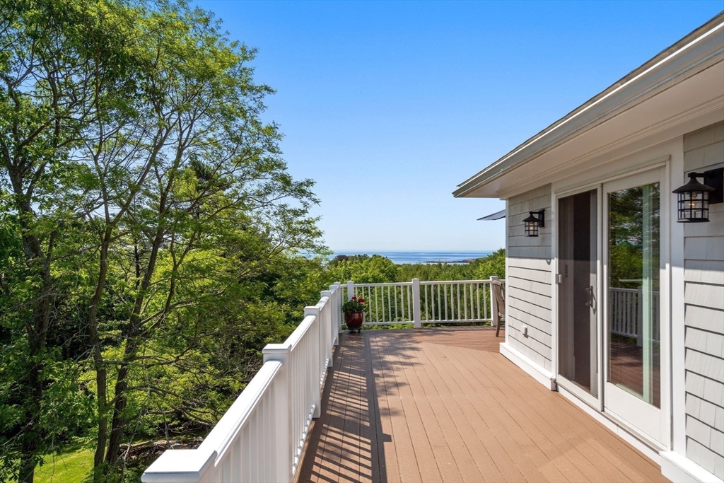 Privacy abounds in this one-of-a-kind breath-taking hilltop contemporary sited on 16+ acres that boasts captivating ocean views and lush rolling lawns. An open floor plan integrates the spacious eat-in kitchen, formal dining area, and cozy family room. Expansive windows and ceilings flood the home with natural light. A living room with a bucolic fieldstone fireplace offers elegant entertaining space and a wraparound deck to enjoy outdoor living with sea breezes and panoramas of the treetops.This 4-bedroom 3-bath home features a generous primary suite with a private ocean view balcony and 3 remodeled bedrooms. Added highlights include a tasteful home office built into the historical stone tower and an attached two-car garage. With walking trails and beaches nearby and easy access to Rte. 128, this charming home nestled in the natural beauty of a private enclave presents a unique opportunity that’s not to be missed.