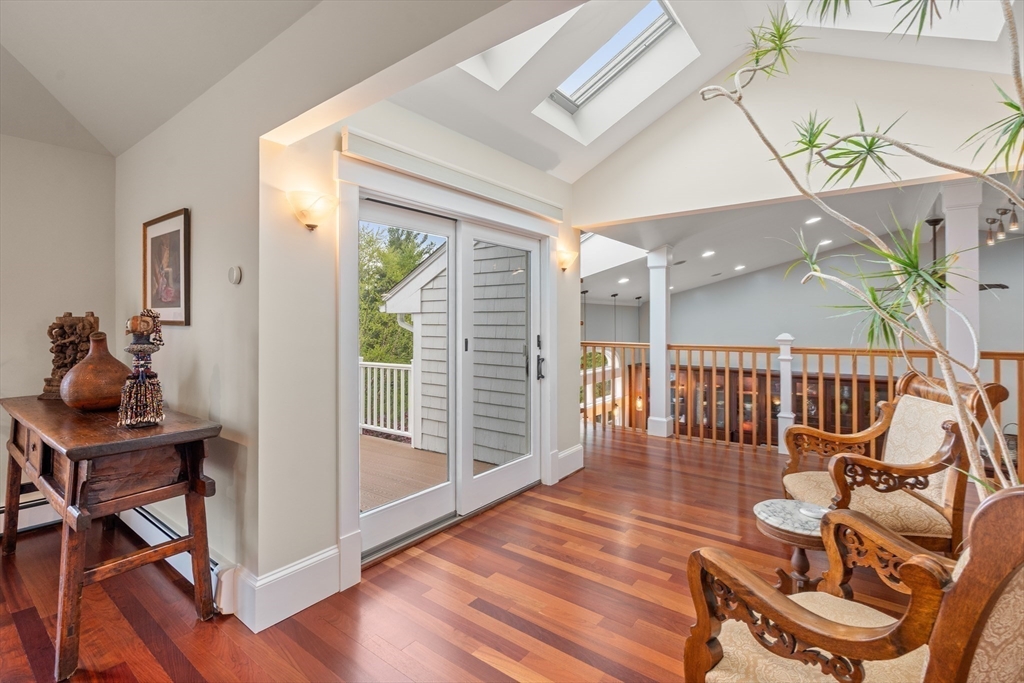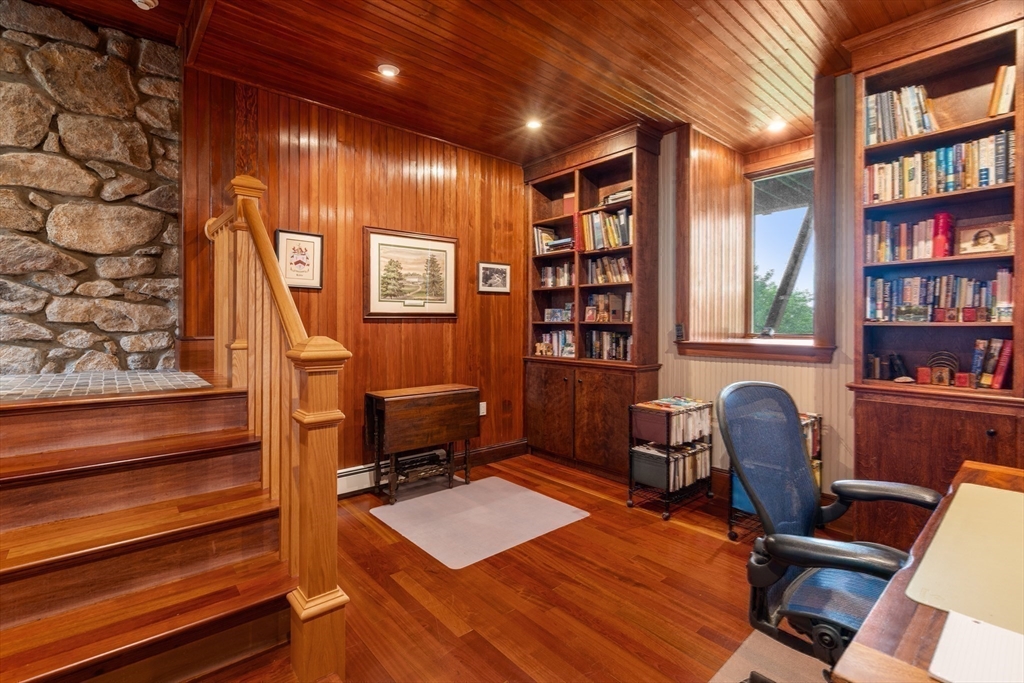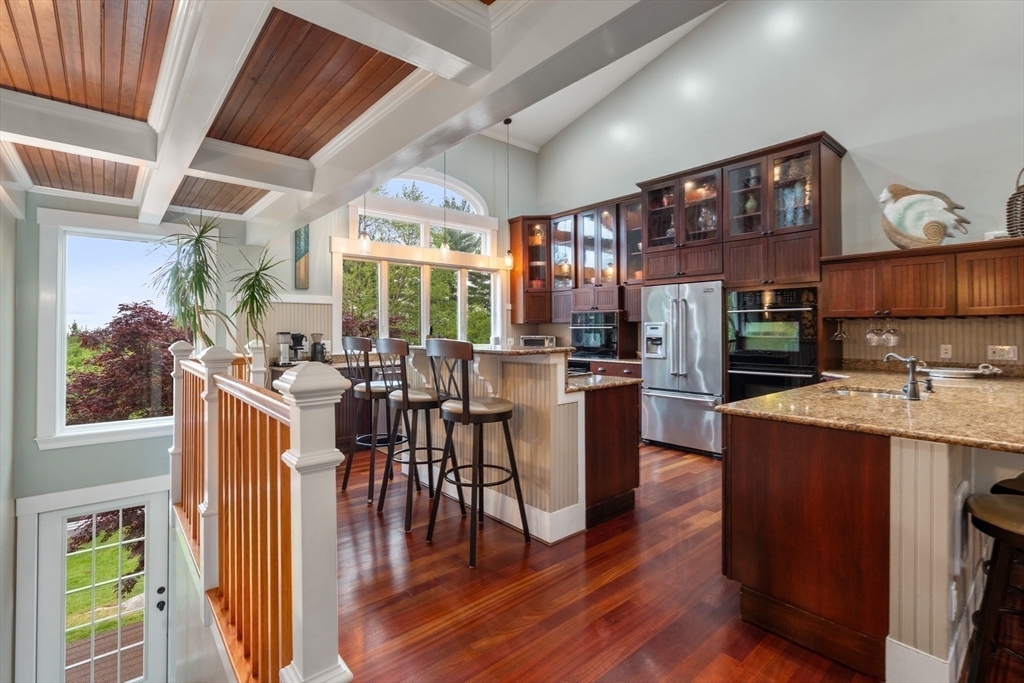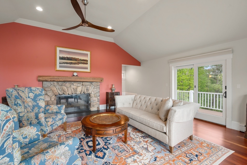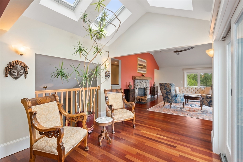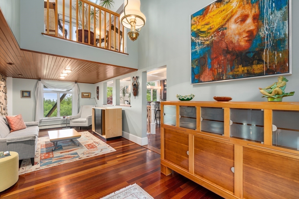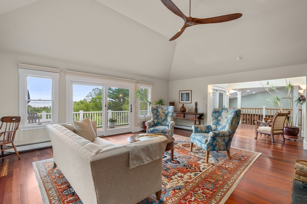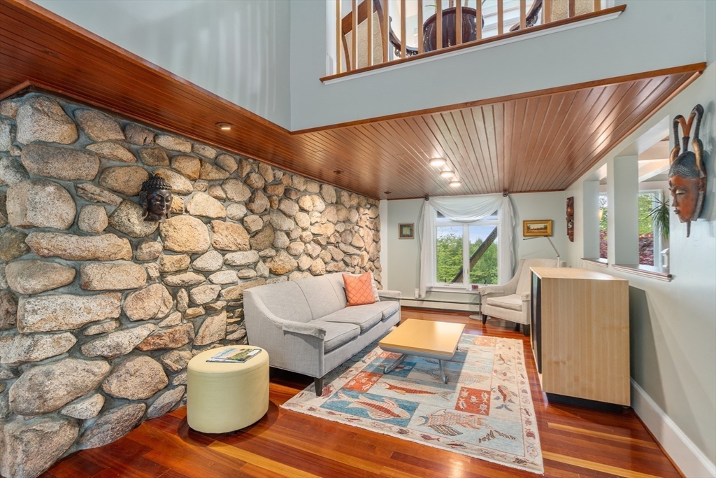 Privacy abounds in this one-of-a-kind breath-taking hilltop contemporary sited on 16+ acres that boasts captivating ocean views and lush rolling lawns. An open floor plan integrates the spacious eat-in kitchen, formal dining area, and cozy family room. Expansive windows and ceilings flood the home with natural light. A living room with a bucolic fieldstone fireplace offers elegant entertaining space and a wraparound deck to enjoy outdoor living with sea breezes and panoramas of the treetops.This 4-bedroom 3-bath home features a generous primary suite with a private ocean view balcony and 3 remodeled bedrooms. Added highlights include a tasteful home office built into the historical stone tower and an attached two-car garage. With walking trails and beaches nearby and easy access to Rte. 128, this charming home nestled in the natural beauty of a private enclave presents a unique opportunity that’s not to be missed.