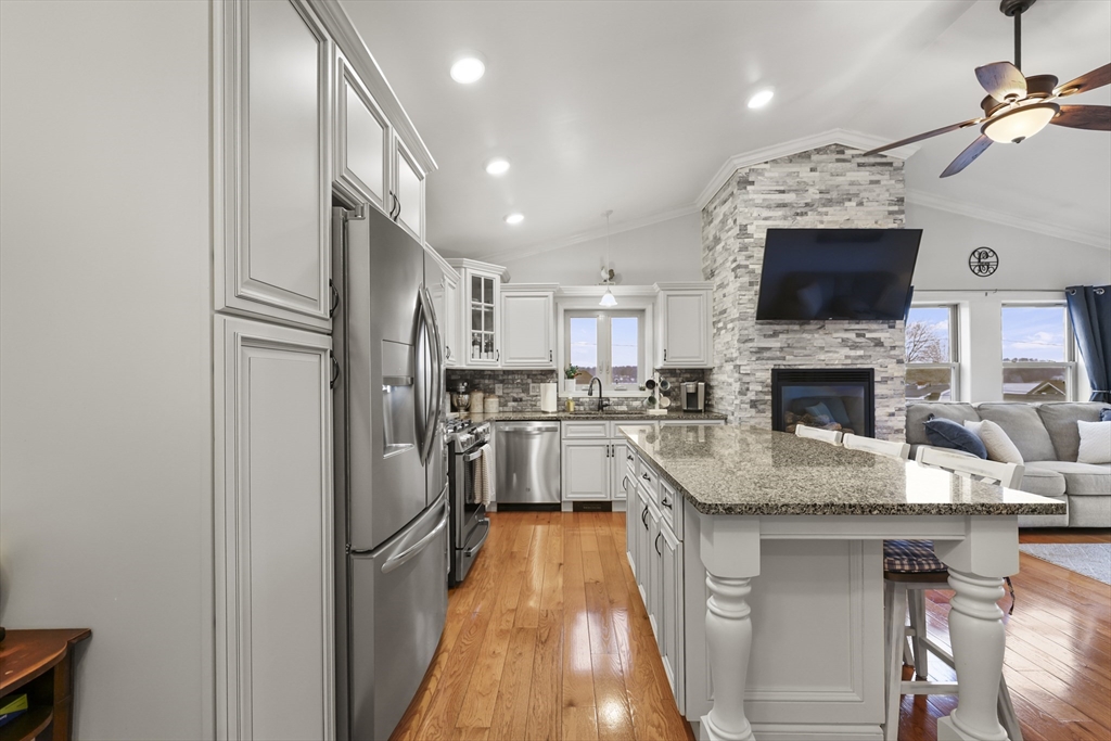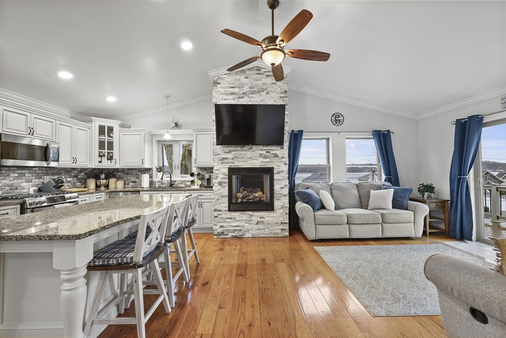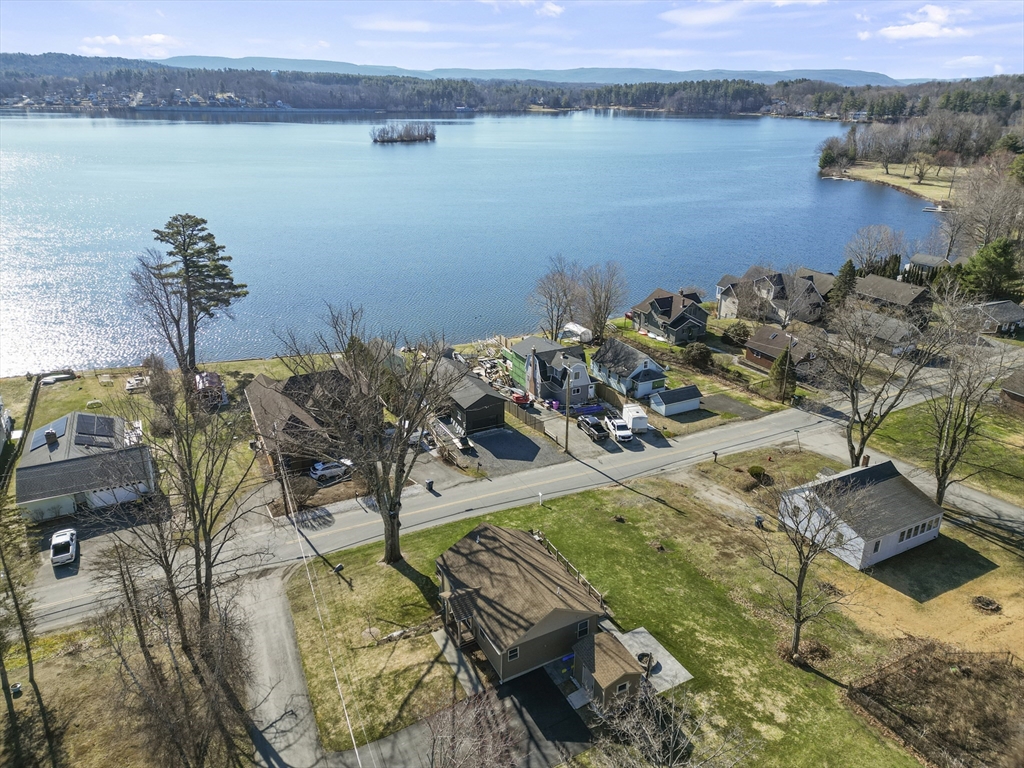 Lake Community Living! Perched to capture beautiful views of Pontoosuc Lake, this six-year-old home blends modern design with comfort and lifestyle. Filled with natural light, the open-concept layout features a custom kitchen and living area leading to a wraparound deck with sweeping lake views. Highlights include wood floors, stone countertops, custom cabinetry, crown molding, and a floor-to-ceiling gas stone fireplace. The primary suite offers an en-suite bath, walk-in closet, first-floor laundry, and an additional half bath for easy single-level living. The walkout lower level includes two spacious bedrooms, a full bath, and family room perfect for guests. Outside enjoy a manicured yard, custom hardscape, extra-wide driveway, and storage shed. Just steps to right-of-way water access for kayaking, paddleboarding, and more!
