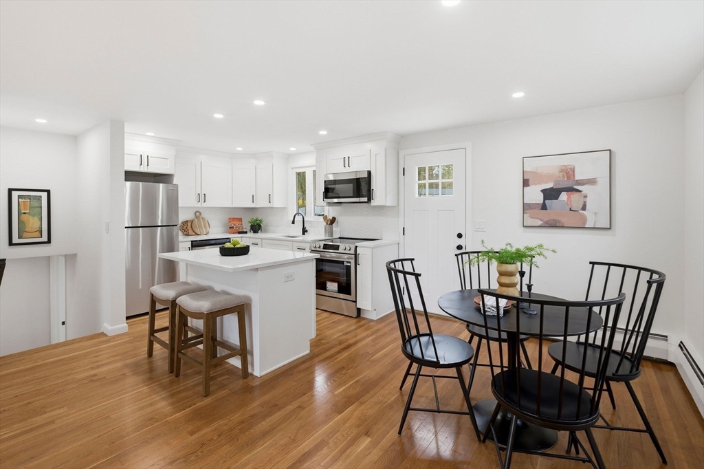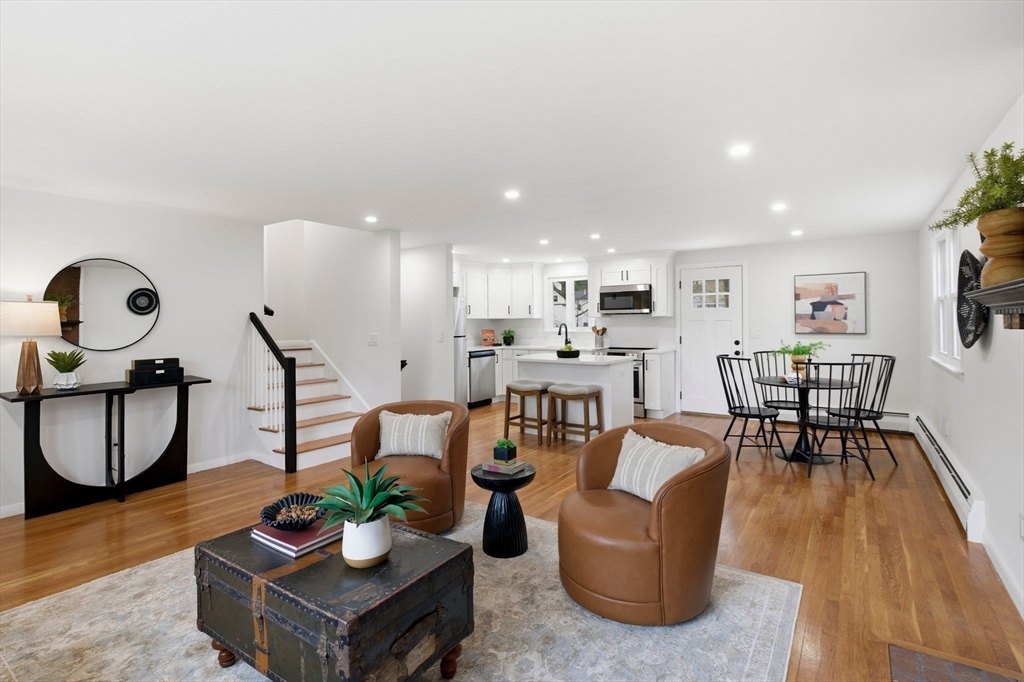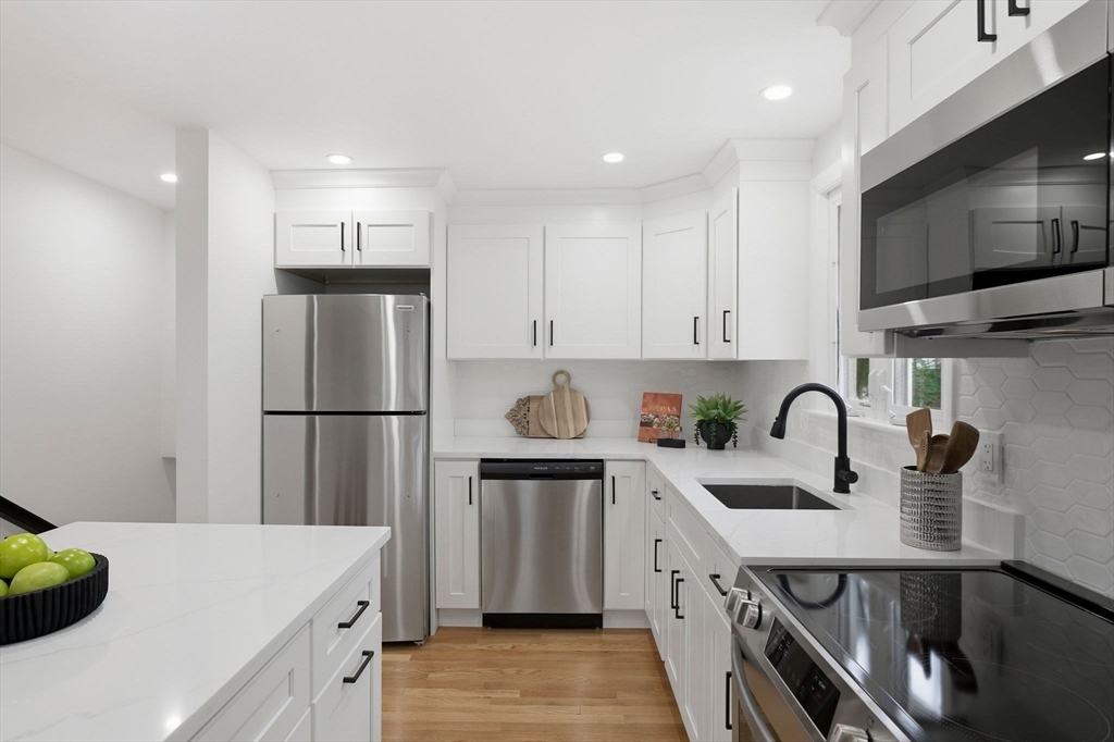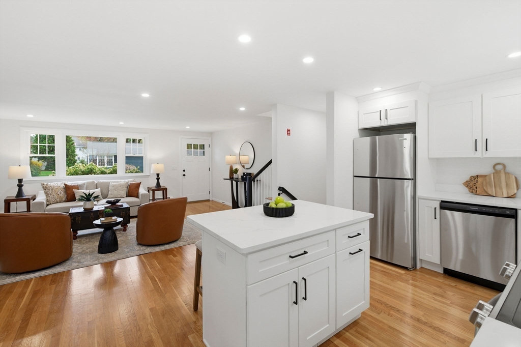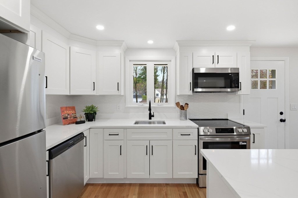 Welcome home to 14 Sycamore Rd in desirable Wakefield! Turnkey 4-bed, 2-full-bath home on .3 acres in a prime location near Rt 95, Rt 1, schools, downtown, and Lake Quannapowitt. The main level features an open-concept layout with a new kitchen boasting white shaker cabinets, quartz countertops, stainless steel appliances, and tile backsplash, flowing into the dining area and family room with a fireplace. The second level offers 3 bedrooms, a full bath, and a primary suite with a tiled shower. The lower level includes a 4th bedroom, laundry, mudroom, and garage access. A finished basement provides flexible space for a living room, office, gym, or playroom. Enjoy a large deck overlooking a level yard. 1-car garage.