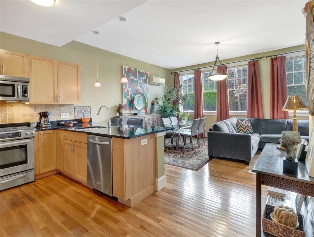 Rarely available at Union Place! Bright and inviting 1BR/1BA offering 691 sqft of open-concept living with high ceilings, hardwood floors, and six oversized windows for exceptional natural light. Well-designed kitchen features granite countertops, stainless steel appliances, gas cooking, and ample cabinetry. Spacious bedroom with walk-in closet and mini-split A/C. Condo fee includes heat, gas, hot water, insurance, and landscaping. Enjoy premium amenities: rooftop deck, landscaped courtyard with grill, laundry on the floor, deeded storage, and bike room. Pet-friendly, professionally constructed in 2009 with strong reserves. car garage offered at $275.00 per month. Prime location just minutes to Union Square Green Line with easy access to Kendall, MIT, Harvard, and the Red Line. Close to top restaurants, cafés, and parks. Low taxes with exemption and limited inventory make this a standout opportunity.