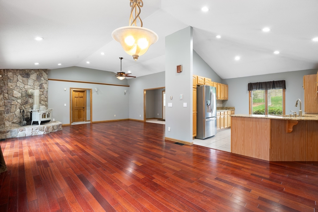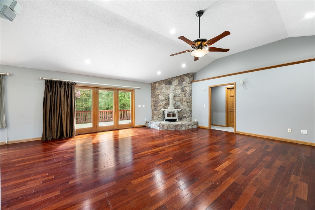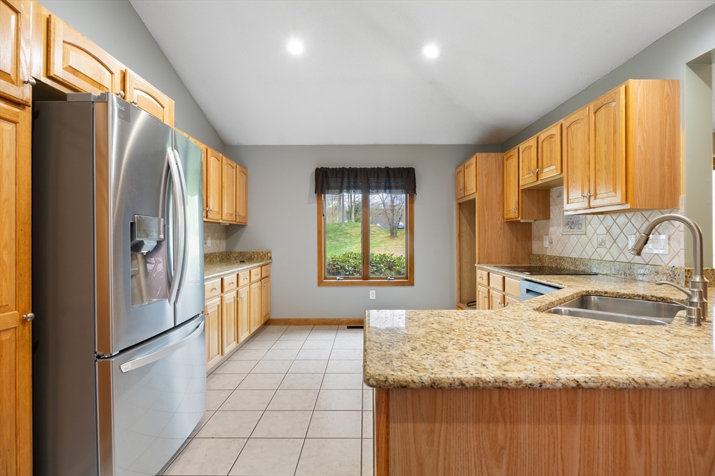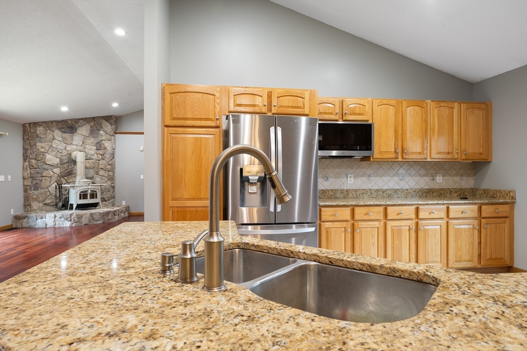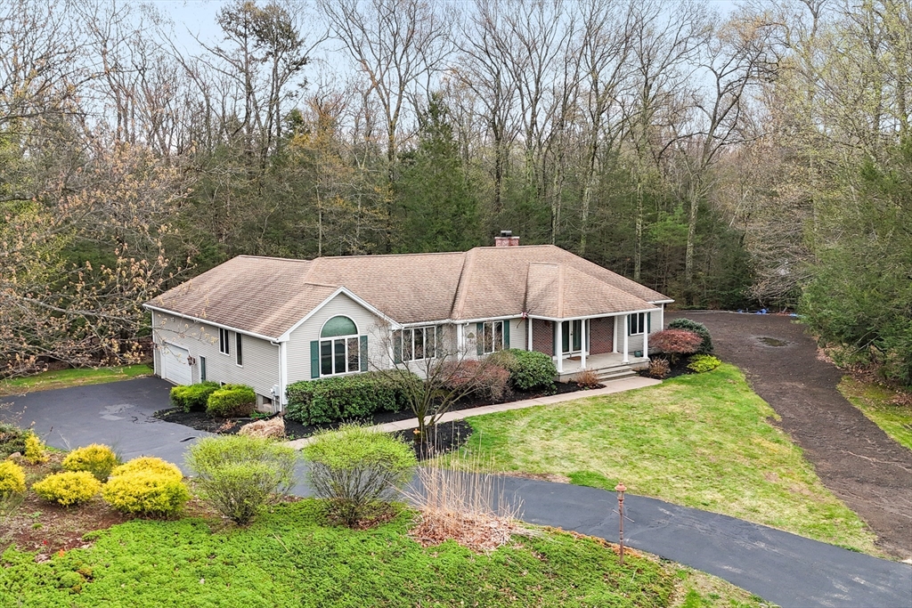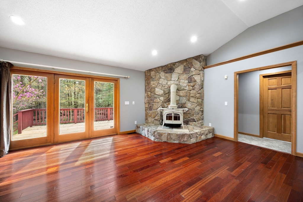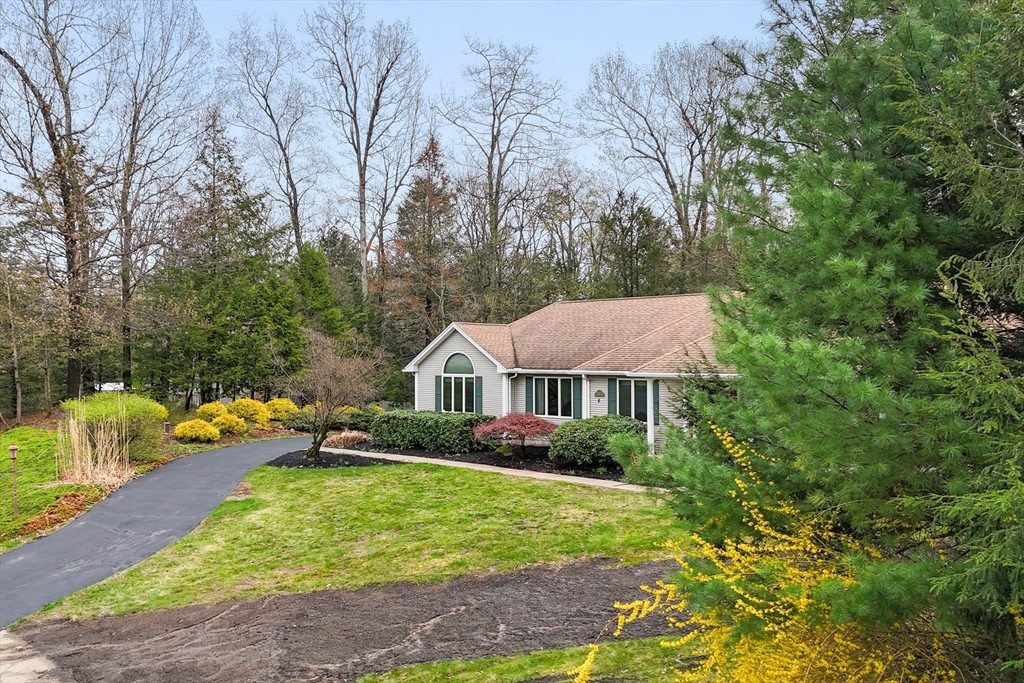 Experience the epitome of modern living in this stunning 3-bedroom oasis, where high-end designs meet functionality. The heart of the home is an impressive sun-soaked open-concept great room with cathedral ceilings, beautiful hardwood floors, a stone fireplace, and a warming woodstove. The sleek chef-inspired kitchen with its wall ovens makes entertaining a breeze, while the split-bedroom design offers maximum privacy for the peaceful primary suite. Enjoy family time or quiet moments in this well-maintained home set back in a private wooded lot, but located close to shopping centers and the Connecticut border.