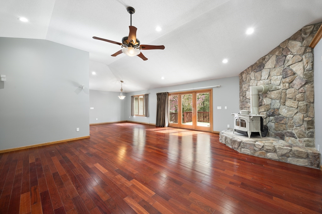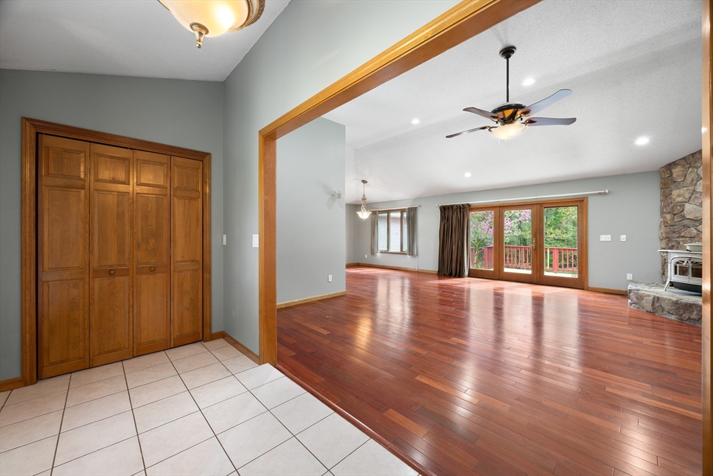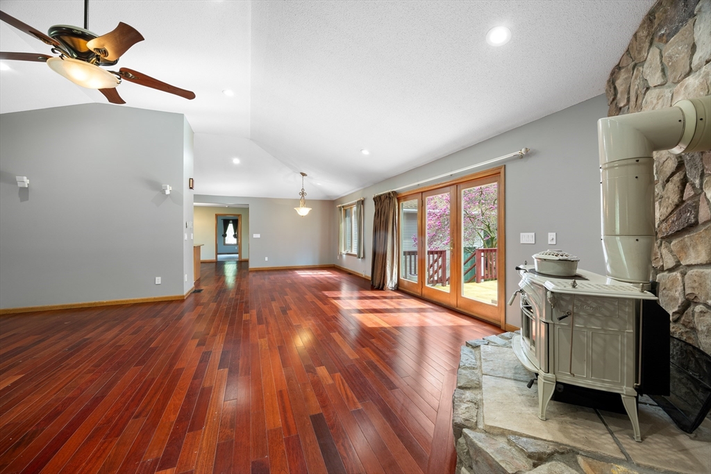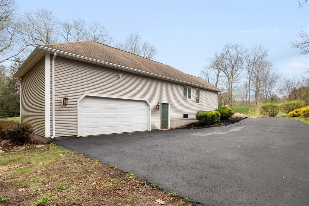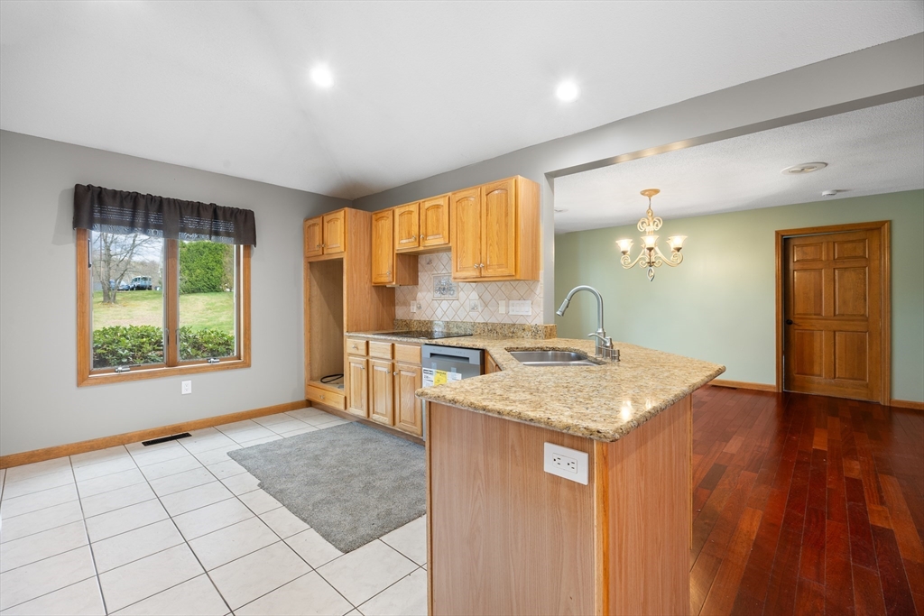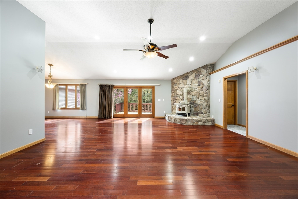Experience the epitome of modern living in this stunning 3-bedroom oasis, where high-end designs meet functionality. The heart of the home is an impressive sun-soaked open-concept great room with cathedral ceilings, beautiful hardwood floors, a stone fireplace, and a warming woodstove. The sleek chef-inspired kitchen with its wall ovens makes entertaining a breeze, while the split-bedroom design offers maximum privacy for the peaceful primary suite. Enjoy family time or quiet moments in this well-maintained home set back in a private wooded lot, but located close to shopping centers and the Connecticut border.