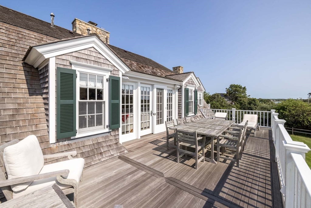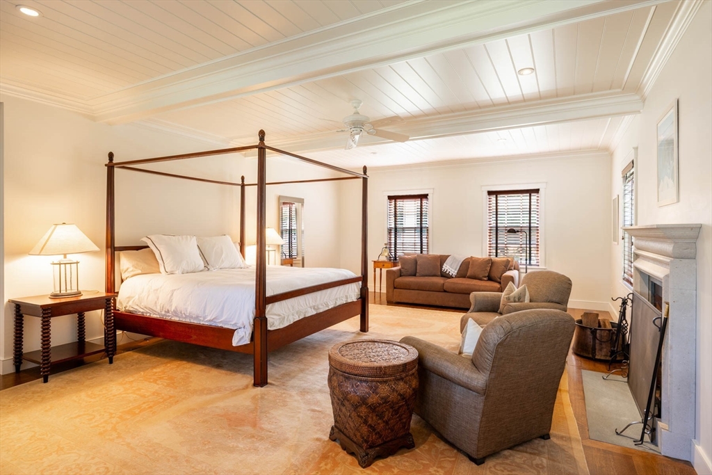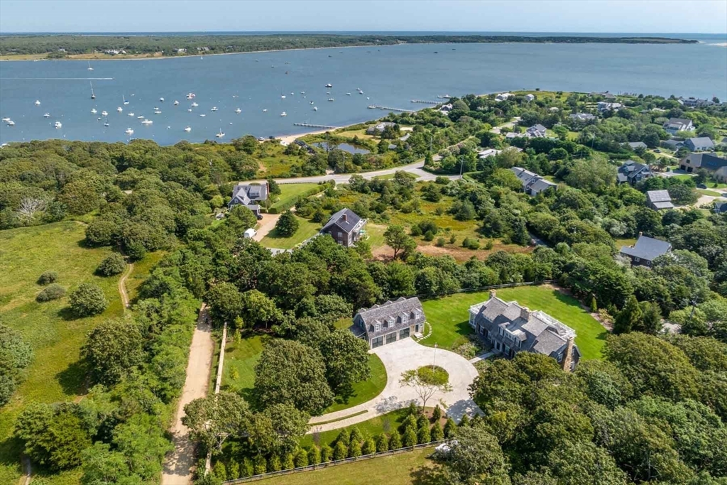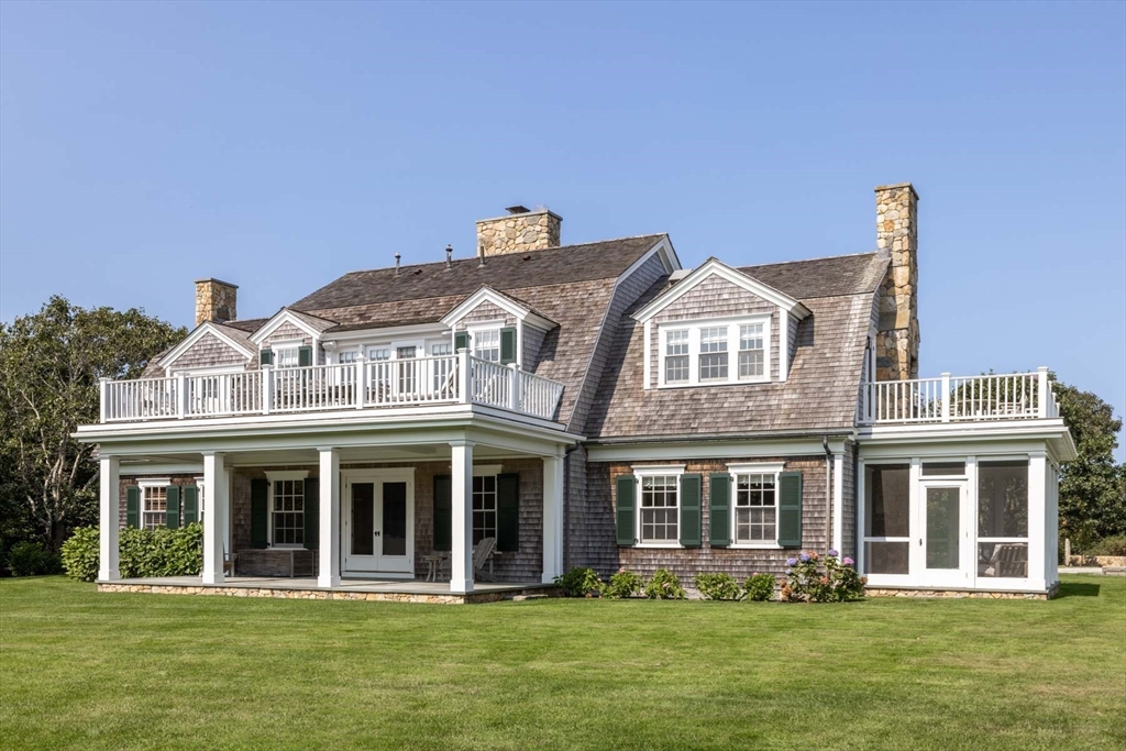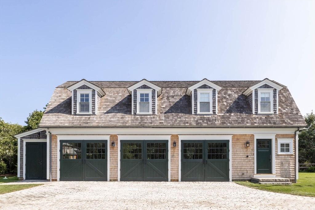 This classic New England home in Katama offers a refined blend of timeless architecture and modern comfort, set on a spacious, beautifully landscaped lot. The main house features three well-appointed bedrooms, including a light-filled primary suite and inviting guest rooms designed for comfort and privacy. The open-concept living area is ideal for entertaining, highlighted by a cozy fireplace and large windows overlooking the manicured grounds. French doors lead to a deck perfect for outdoor dining and relaxation. A state-of-the-art media room with plush seating and a large screen provides the ultimate space for movie nights or game days, with a wine cellar just steps away. The carriage house includes a three-car garage with a spacious one-bedroom apartment above. Located beside Sheriff’s Meadow Conservation land with public access to Katama Bay, and just minutes to South Beach and downtown Edgartown.