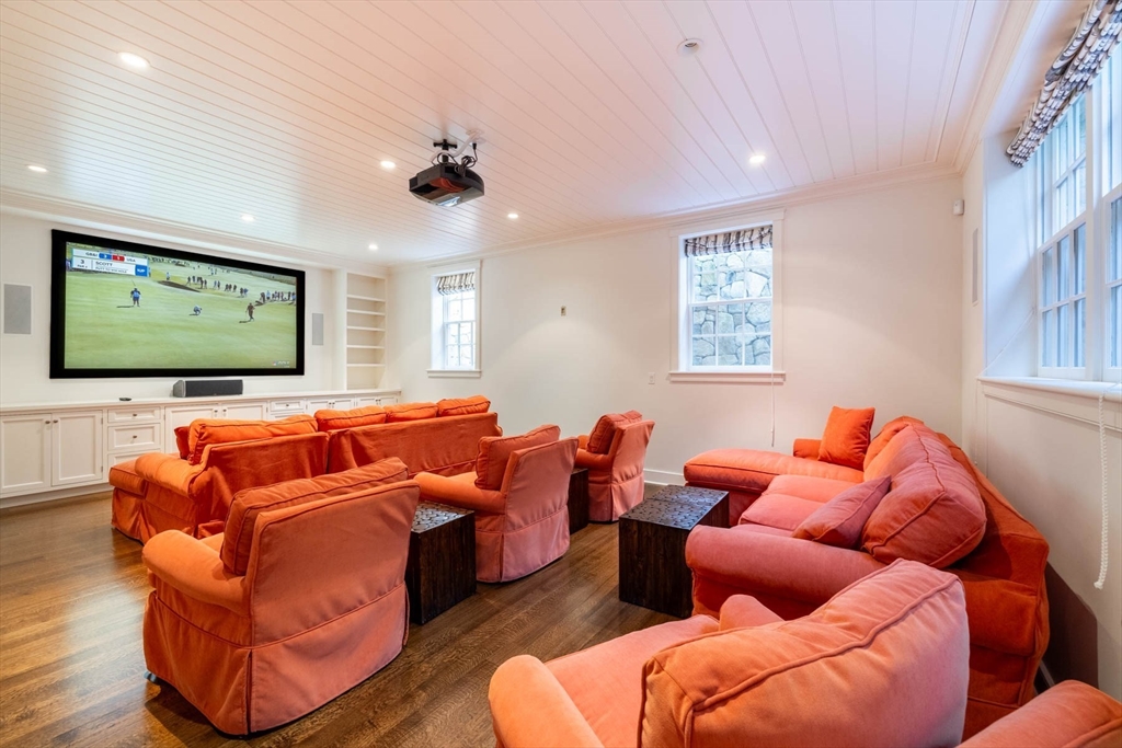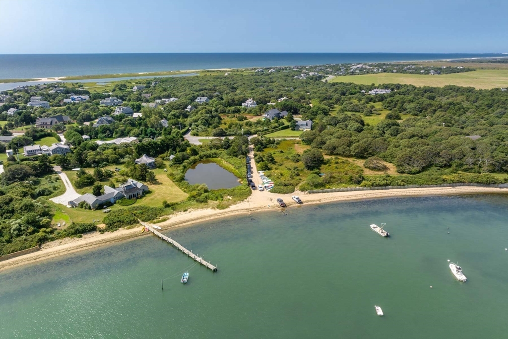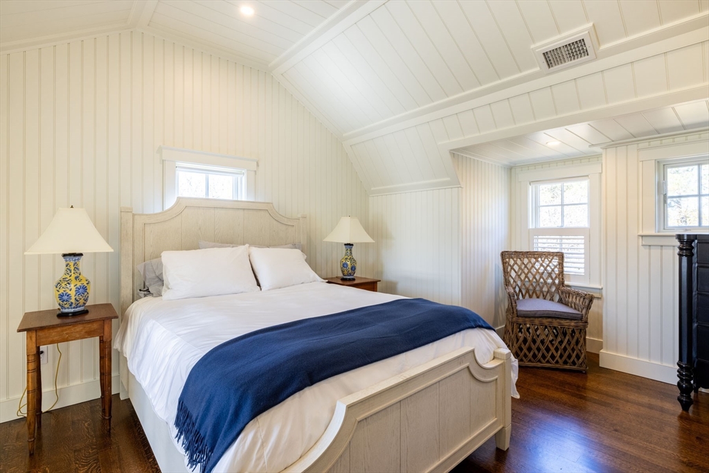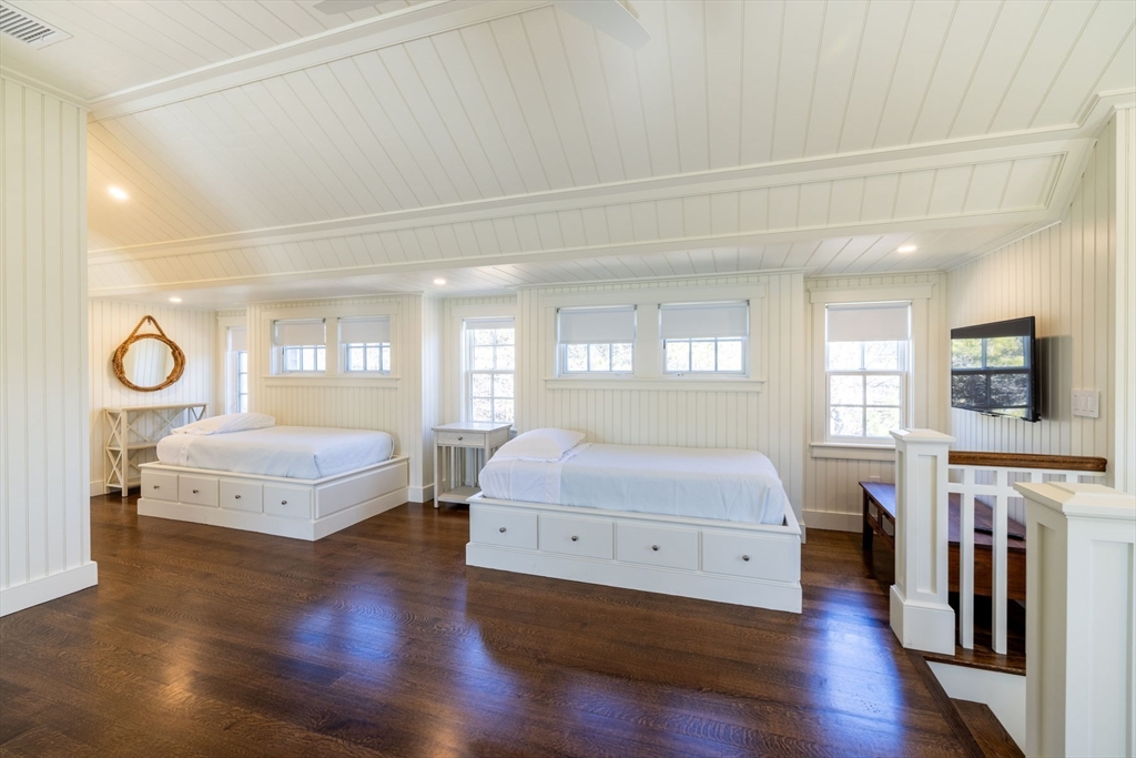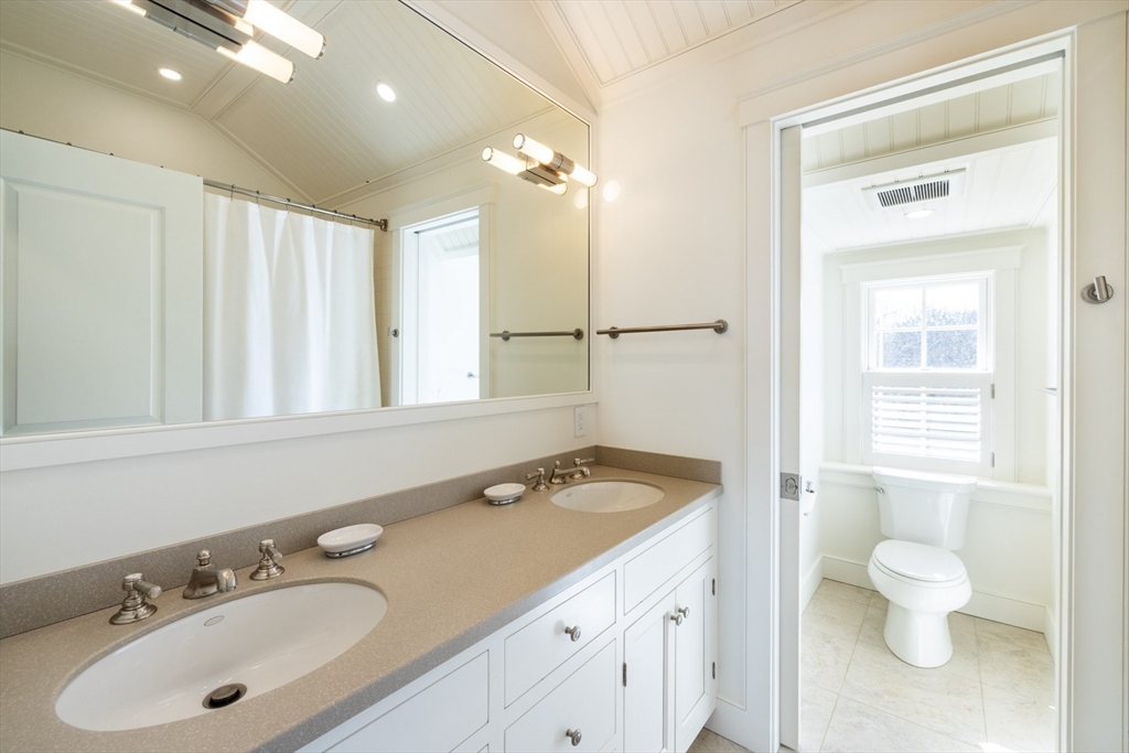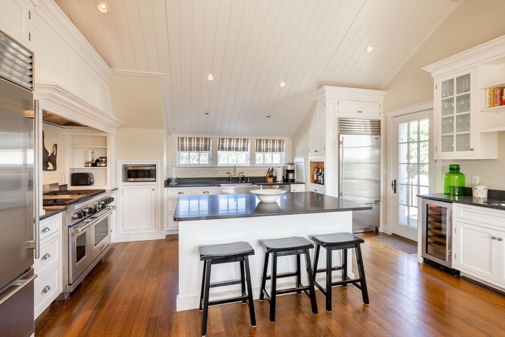 This classic New England home in Katama offers a refined blend of timeless architecture and modern comfort, set on a spacious, beautifully landscaped lot. The main house features three well-appointed bedrooms, including a light-filled primary suite and inviting guest rooms designed for comfort and privacy. The open-concept living area is ideal for entertaining, highlighted by a cozy fireplace and large windows overlooking the manicured grounds. French doors lead to a deck perfect for outdoor dining and relaxation. A state-of-the-art media room with plush seating and a large screen provides the ultimate space for movie nights or game days, with a wine cellar just steps away. The carriage house includes a three-car garage with a spacious one-bedroom apartment above. Located beside Sheriff’s Meadow Conservation land with public access to Katama Bay, and just minutes to South Beach and downtown Edgartown.