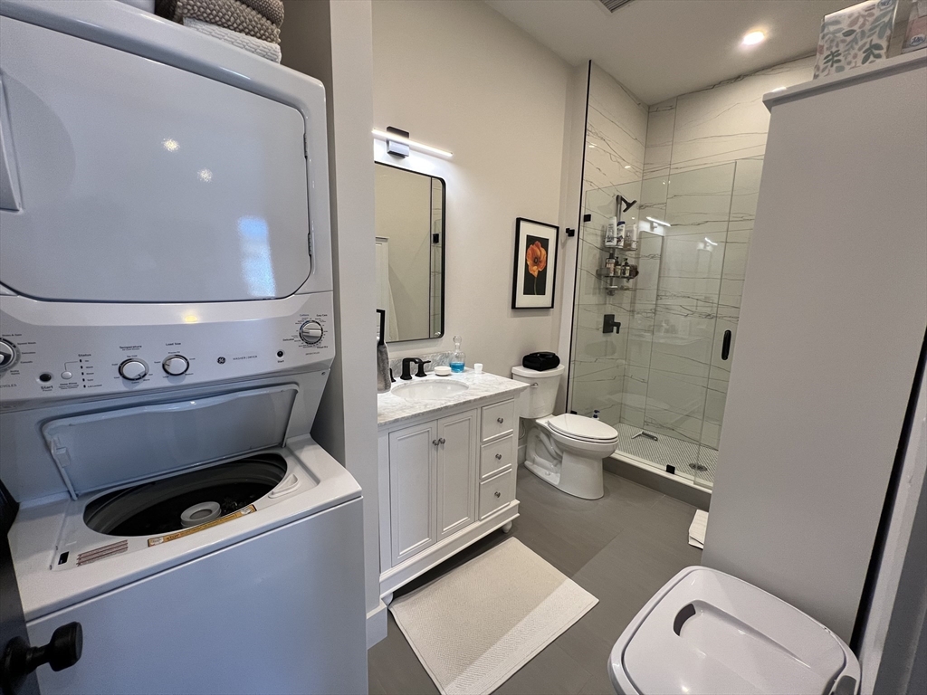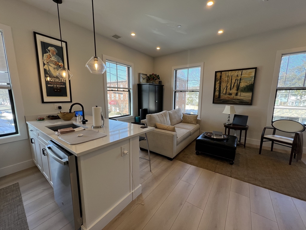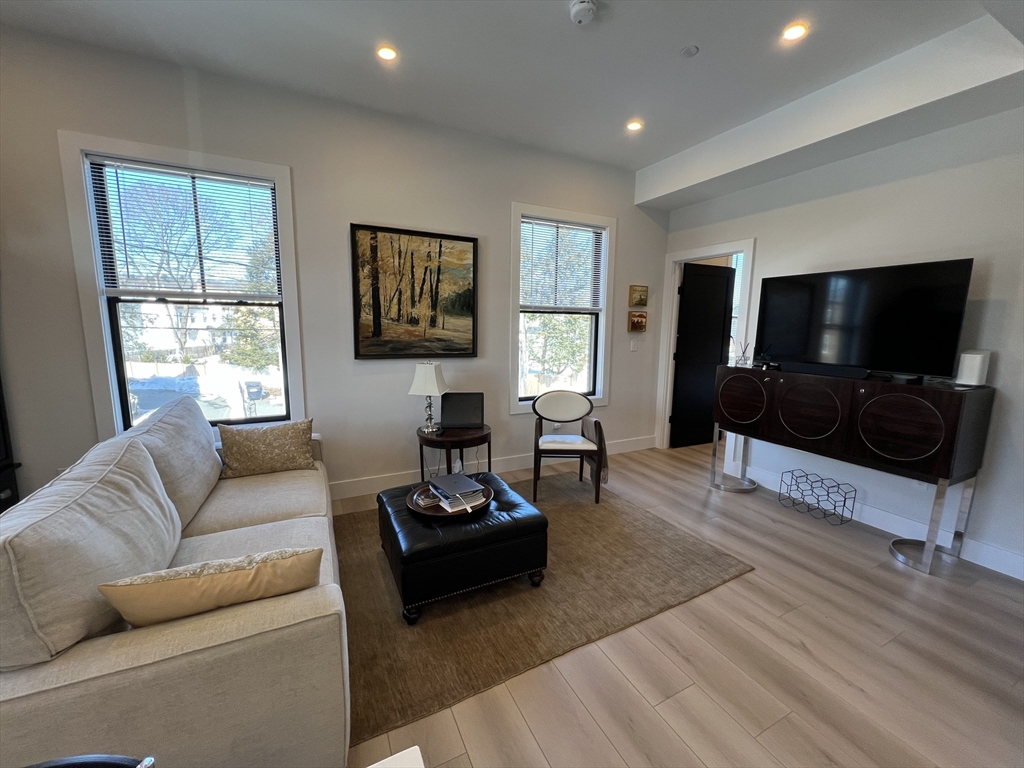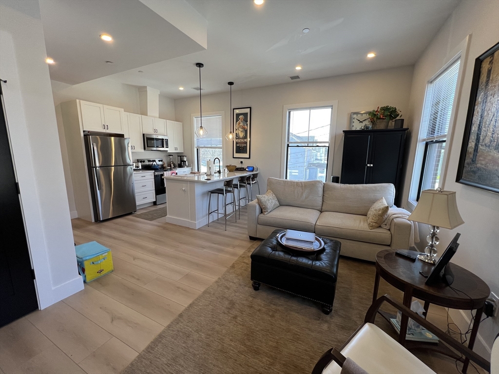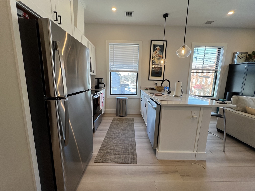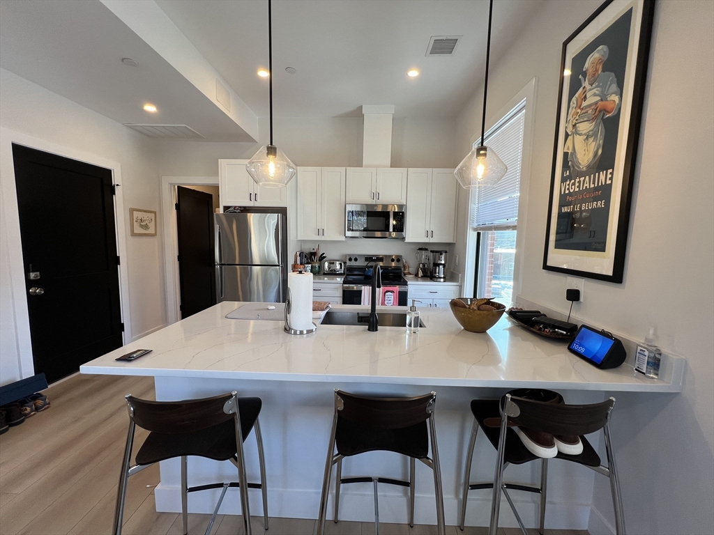 Welcome to 198 Albion Flats! This professionally managed building showcases high-end design and meticulous attention to detail. Enjoy roughly 10-foot ceilings, neutral paint, and LVT flooring with sound insulation for quiet, modern living. Kitchens boast white shaker cabinets, quartz countertops, black hardware, and vented microwaves, while bathrooms include glass shower enclosures, porcelain tiles, and comfortable penny tile floors. Designed for efficiency, each unit has a high-efficiency heat pump, individual electric hot water tank, LED recessed lighting, and an ERV air circulation system. Included 1 parking space in a well-lit, landscaped lot. Residents benefit from smartphone-controlled Butterfly MX entry, a dedicated package room, individual storage units, and rooftop deck access. Located steps from the commuter rail and downtown amenities, 198 Albion Flats offers unparalleled luxury and convenience in a beautifully crafted space.