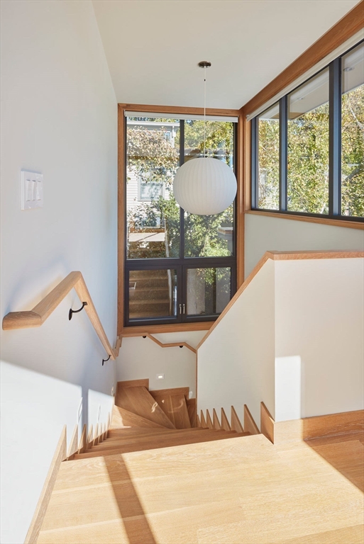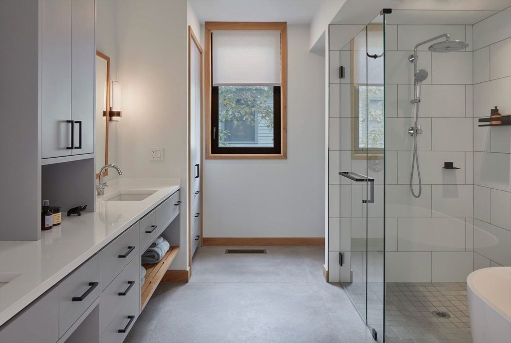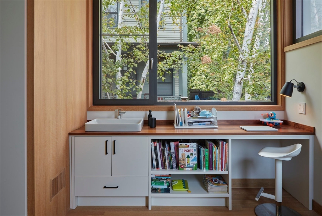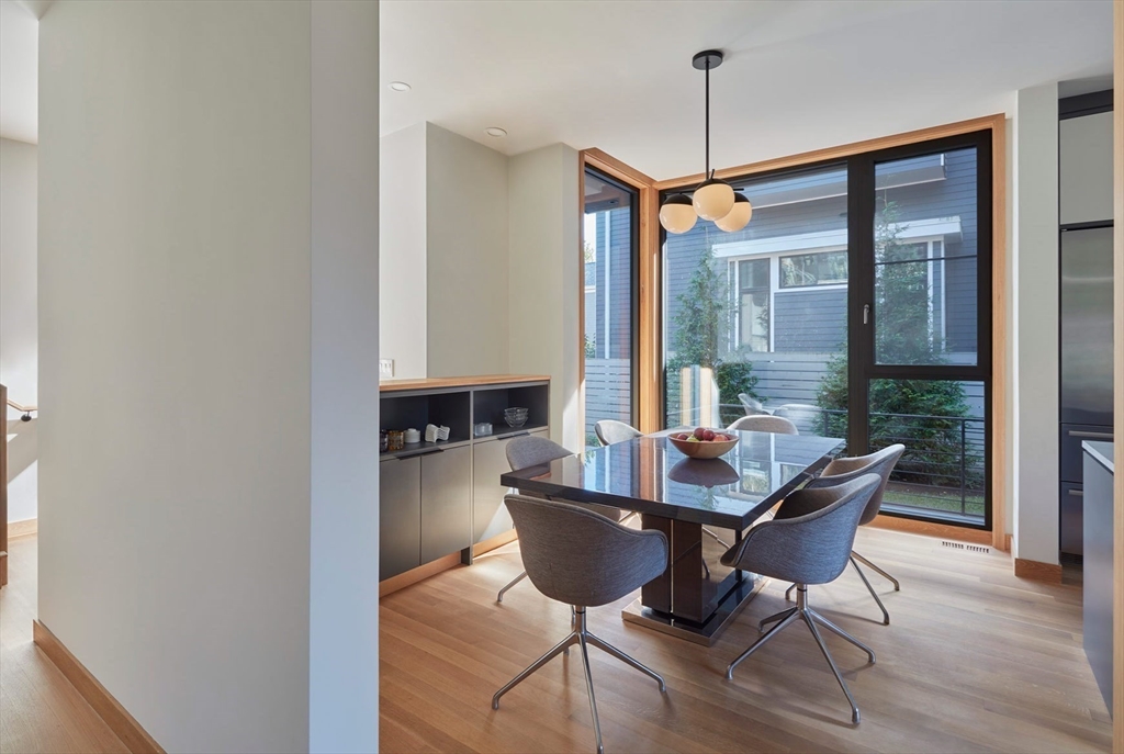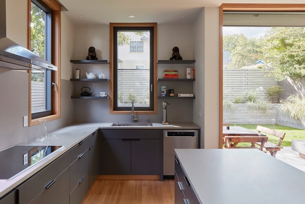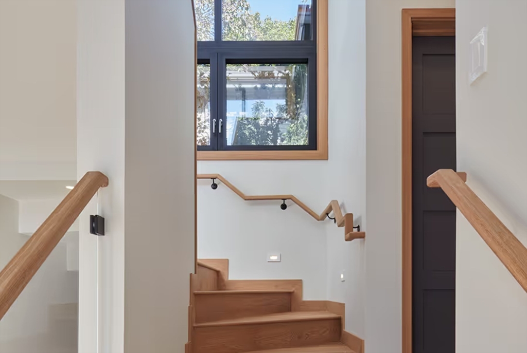 This modern home, built in 2021, offers a rare blend of architectural design, privacy, and modern efficiency in Cambridge’s highly desirable Strawberry Hill neighborhood. A corten steel–lined entry path leads to a private alcove and opens into a sun-filled open floor plan framed by oversized windows, with custom cabinetry and integrated storage throughout. The private backyard creates the perfect setting for afternoon relaxation and easy indoor-outdoor living. The upper level is dedicated to a serene primary suite with a treehouse feel, complete with a spa-like bath featuring a soaking tub, walk-in shower, and oversized double vanity. With 3 additional bedrooms, 2.5 more baths, and a flexible bonus room ideal for a media room, office, or gym, the layout is both functional and luxurious. Ideally located just a short distance to Fresh Pond, bike lanes, neighborhood shops, and beloved Sofra Bakery. The home also features PV solar to help offset electric costs and an EV charging port.