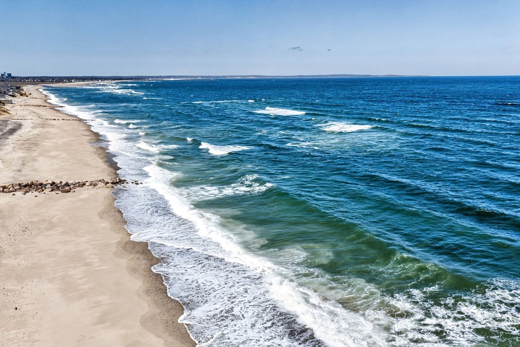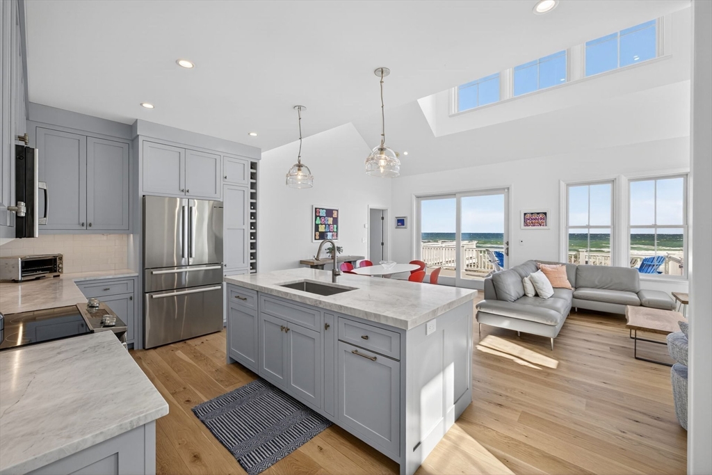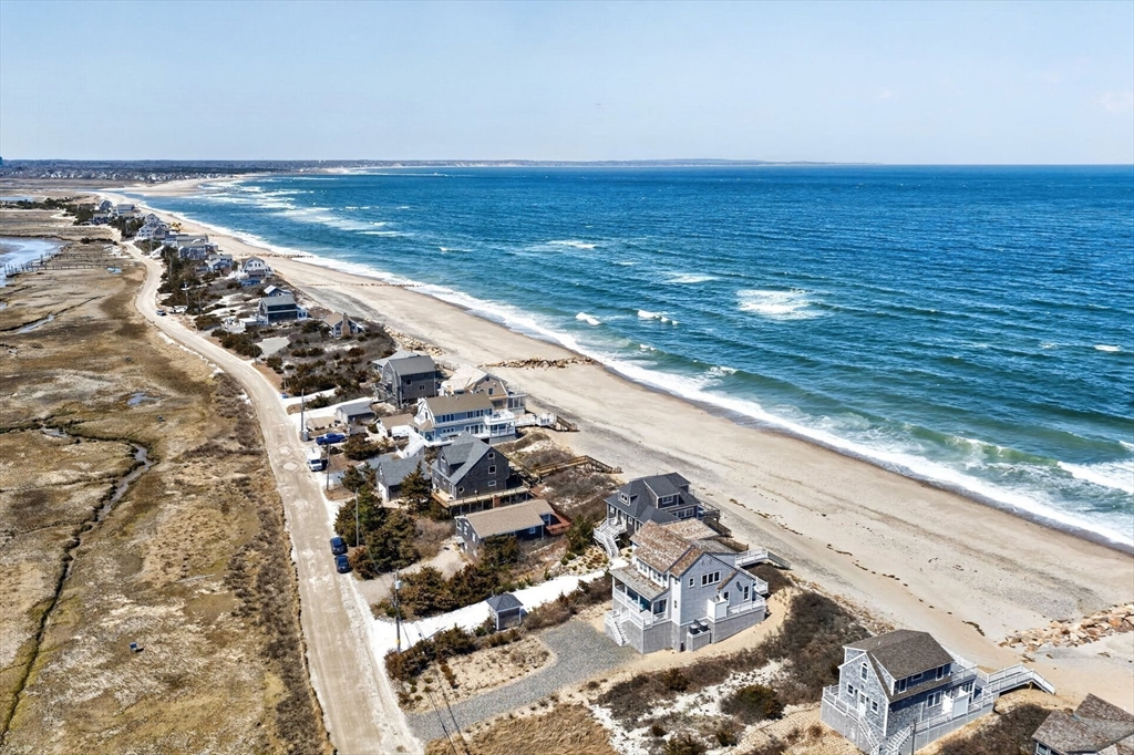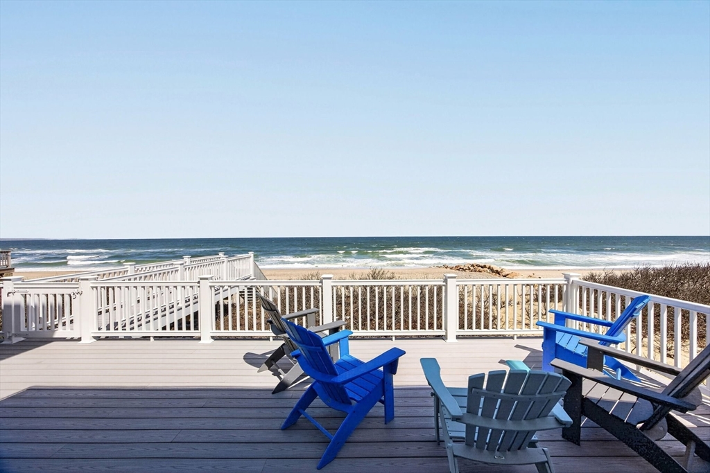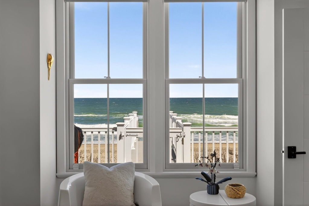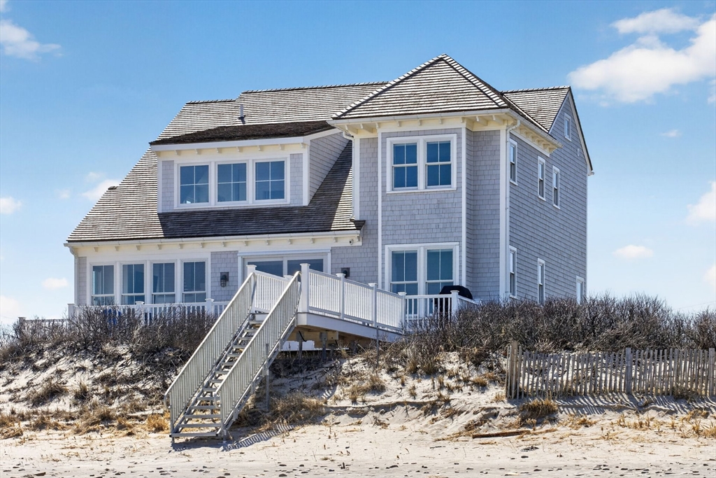 Perched directly on the dunes of East Sandwich, this striking residence enjoys a sandy beach on Cape Cod Bay as its backyard. Offered fully furnished, the architectural heart of the home is a double-height great room with a wall of glass framing panoramic water views, wide plank oak floors, and a Town & Country gas fireplace. The open-concept layout flows into a gourmet kitchen featuring custom black walnut cabinetry, natural quartz countertops, and professional-grade appliances. The first-floor primary suite provides a spa-like retreat with a hammered nickel soaking tub and Carrara marble, while three additional upstairs bedrooms also feature en suite marble baths. High-end details abound, from the mezzanine’s stainless steel cable railings and California Closets to the natural cedar roof with copper flashing. Outside, a sprawling deck with private stairs leads through the dunes to the sand, providing the perfect vantage point to watch the tide cross the iconic Sandwich flats.
