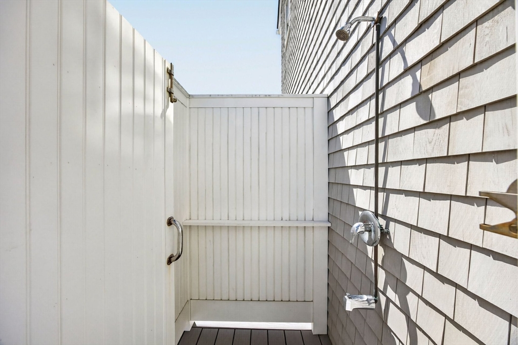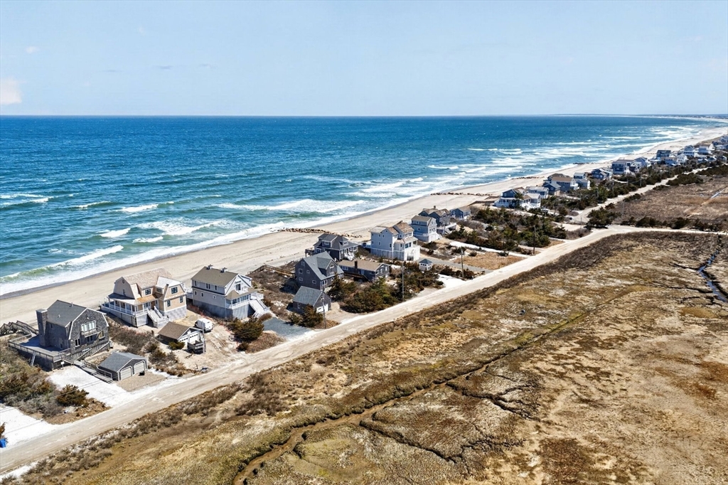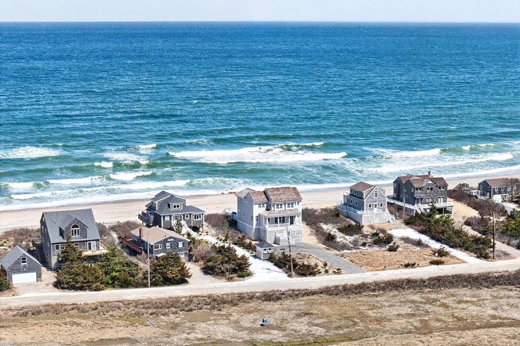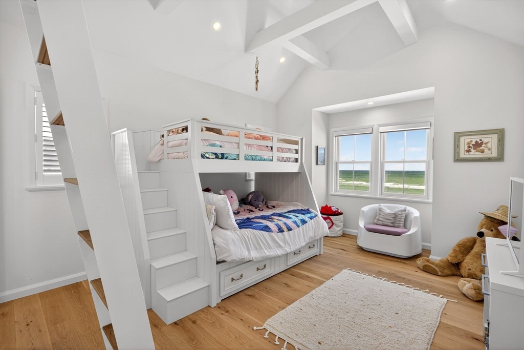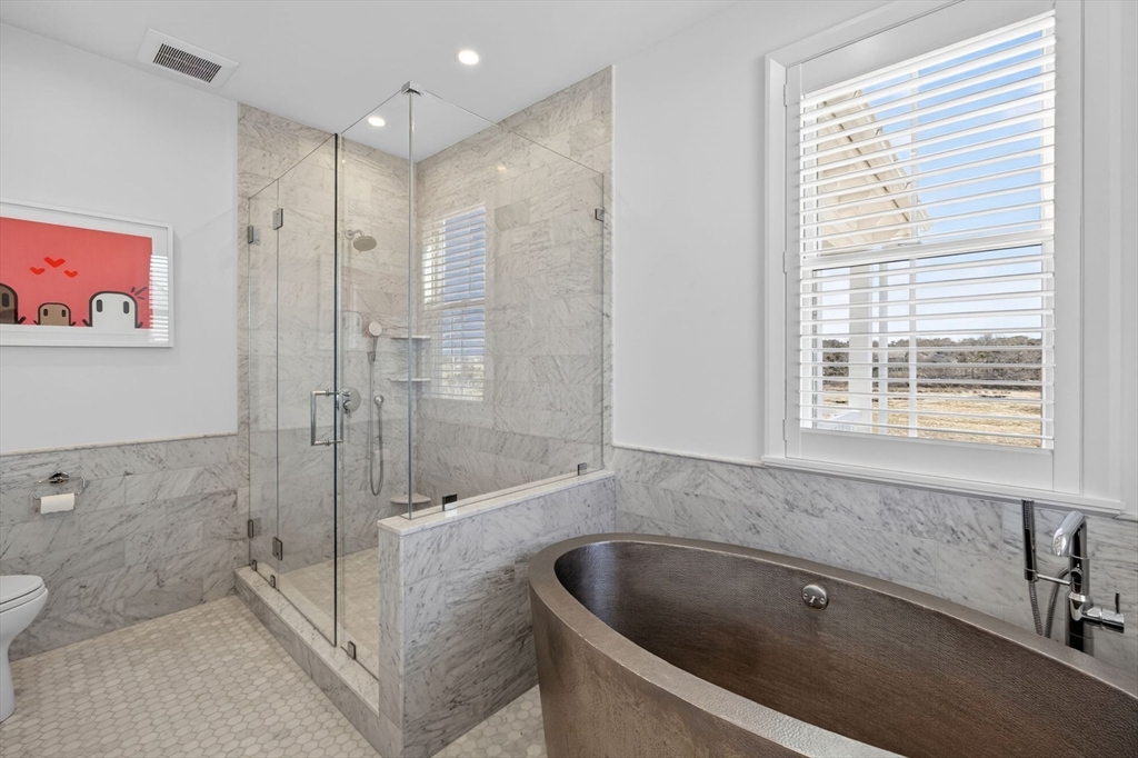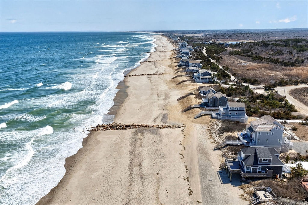 Perched directly on the dunes of East Sandwich, this striking residence enjoys a sandy beach on Cape Cod Bay as its backyard. Offered fully furnished, the architectural heart of the home is a double-height great room with a wall of glass framing panoramic water views, wide plank oak floors, and a Town & Country gas fireplace. The open-concept layout flows into a gourmet kitchen featuring custom black walnut cabinetry, natural quartz countertops, and professional-grade appliances. The first-floor primary suite provides a spa-like retreat with a hammered nickel soaking tub and Carrara marble, while three additional upstairs bedrooms also feature en suite marble baths. High-end details abound, from the mezzanine’s stainless steel cable railings and California Closets to the natural cedar roof with copper flashing. Outside, a sprawling deck with private stairs leads through the dunes to the sand, providing the perfect vantage point to watch the tide cross the iconic Sandwich flats.