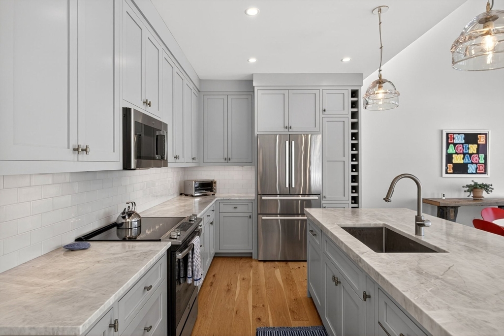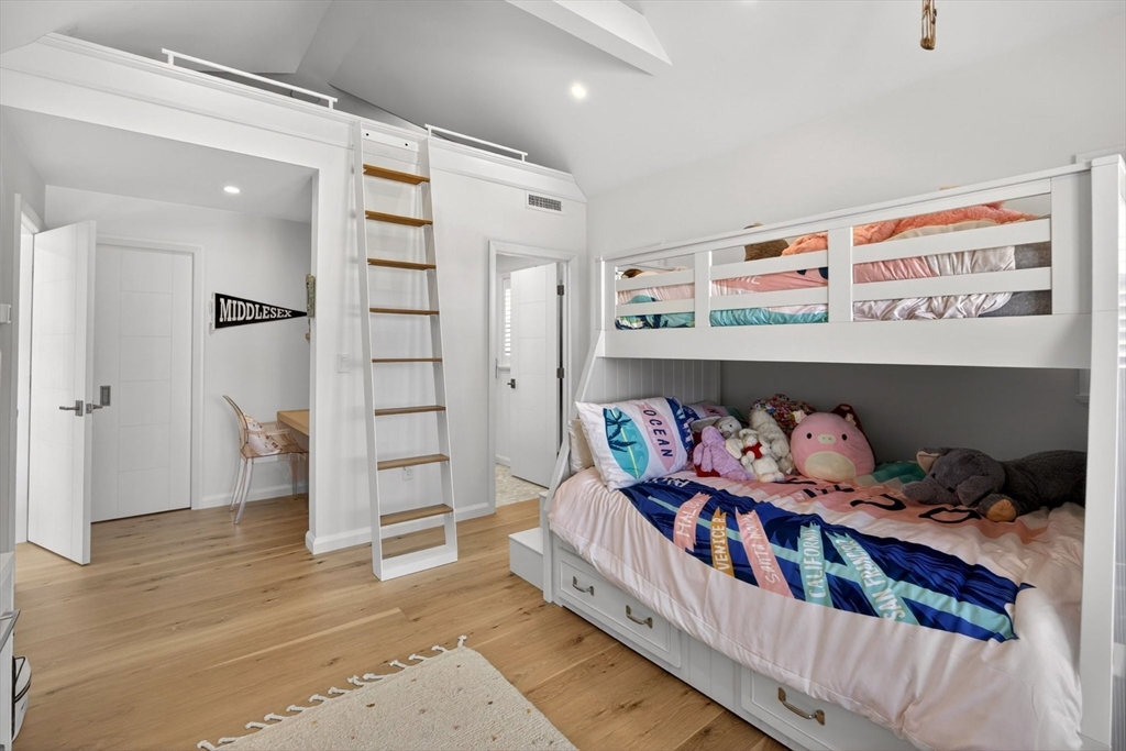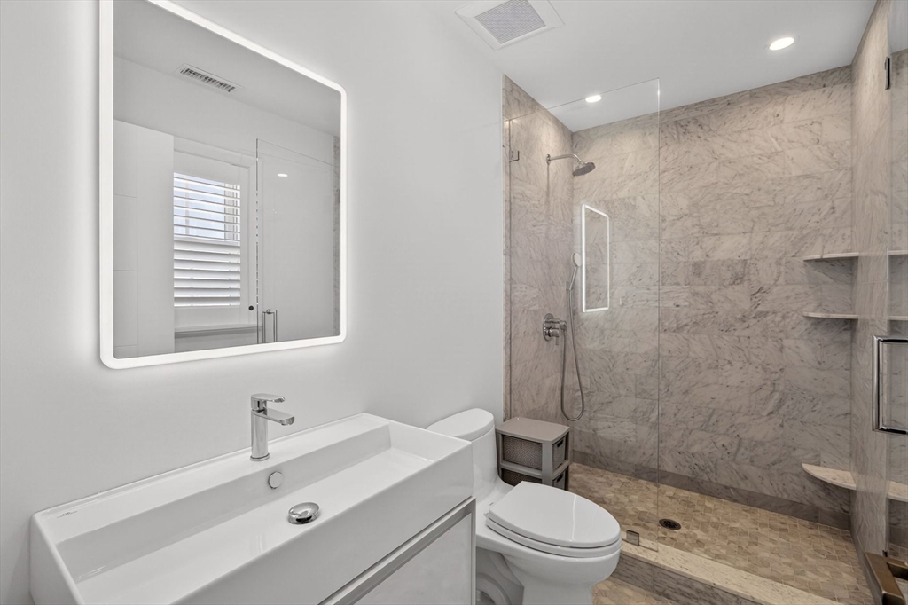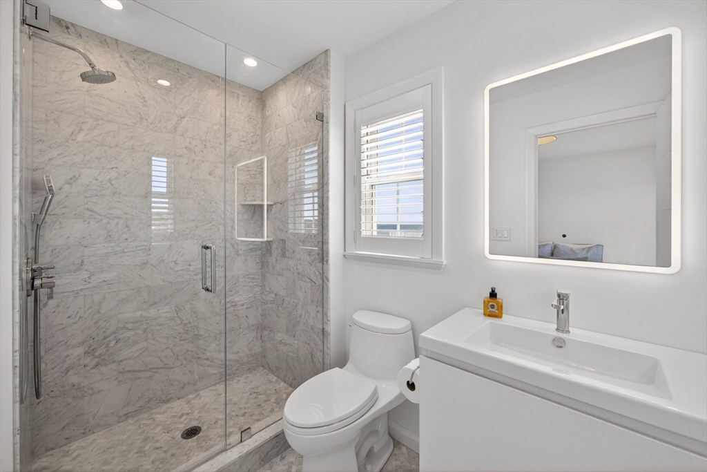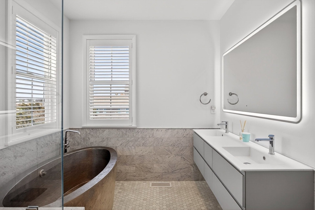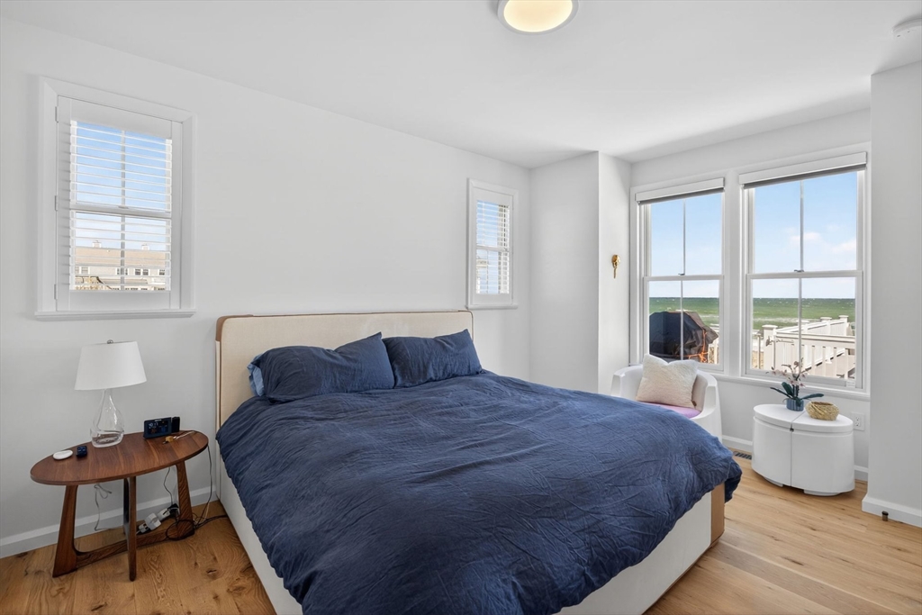 Perched directly on the dunes of East Sandwich, this striking residence enjoys a sandy beach on Cape Cod Bay as its backyard. Offered fully furnished, the architectural heart of the home is a double-height great room with a wall of glass framing panoramic water views, wide plank oak floors, and a Town & Country gas fireplace. The open-concept layout flows into a gourmet kitchen featuring custom black walnut cabinetry, natural quartz countertops, and professional-grade appliances. The first-floor primary suite provides a spa-like retreat with a hammered nickel soaking tub and Carrara marble, while three additional upstairs bedrooms also feature en suite marble baths. High-end details abound, from the mezzanine’s stainless steel cable railings and California Closets to the natural cedar roof with copper flashing. Outside, a sprawling deck with private stairs leads through the dunes to the sand, providing the perfect vantage point to watch the tide cross the iconic Sandwich flats.