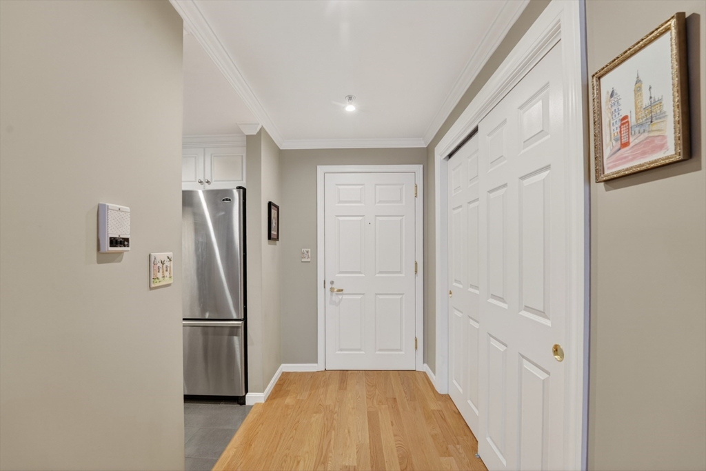 For sale by owner, a beautiful 2-bed, 2-bath, 1200+ sq ft condo featuring hardwood floors, crown moldings, a spacious open floor plan, large closets, in-unit laundry, and 1 deeded garage parking space. The open floor plan is spacious and bright. The primary bedroom has a California closet and an ensuite bathroom. Sizable second bedroom has a walk-in California closet. Both bathrooms include linen closets and marble flooring. The Monarch Condominium is a mid-rise, elevator accessible condo building set on beautiful grounds in the heart of bustling Brighton, conveniently located within walking distance of Whole Foods, a pharmacy, many restaurants, three MBTA lines (C, B, and D Green Line), and the 65 bus route. The Monarch is professionally managed and has an on-site superintendent M-F. HOA fee of $767/month includes management company, onsite superintendent, and your heat, chilled water for AC, water, sewer, trash removal, landscaping, and snow removal. BOS Tax Res Exempt granted.