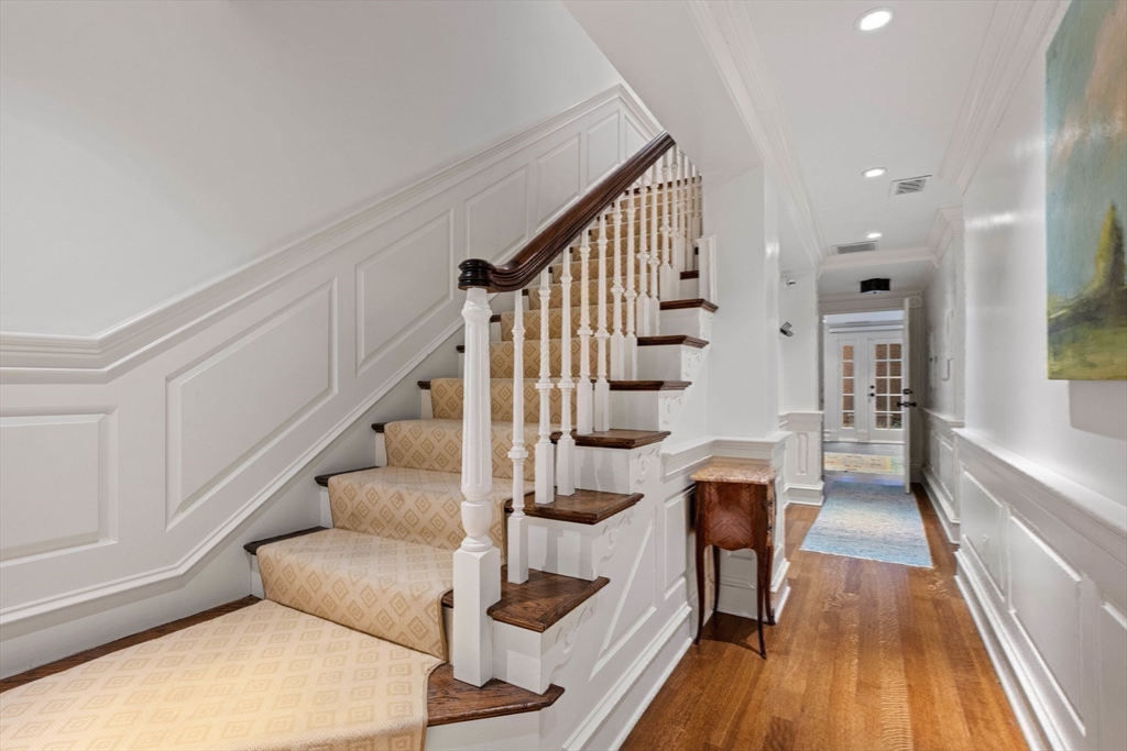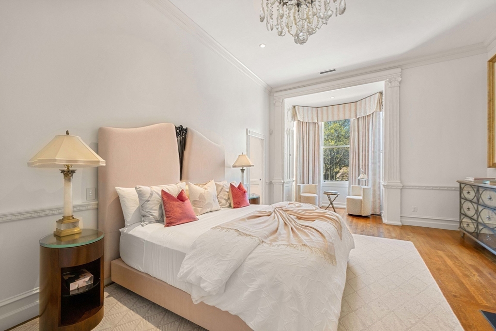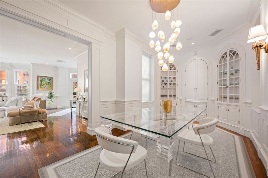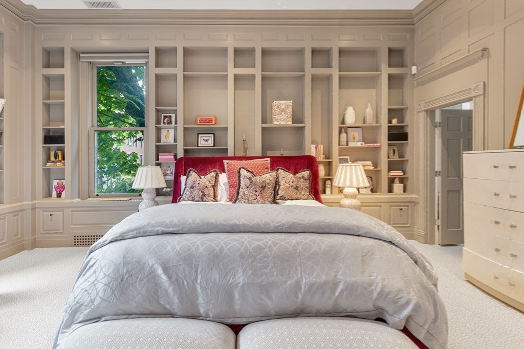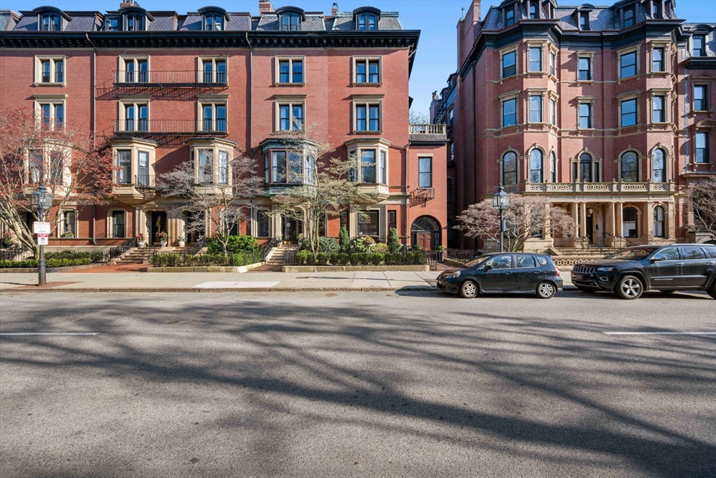 Only half a block from the Public Garden on Commonwealth Avenue’s magnificent leafy boulevard, this elegant triplex is on an impressive stretch of historic homes in one of Back Bay’s finest locations. Featuring 2 direct-access garage spaces, a private deck, garden terrace and elevator access on all levels, this thoughtfully designed 4-bedroom home suits today’s way of living while reflecting its beautiful Back Bay character in a fresh, clean timeless style. There are high ceilings and gracious embellishments. A columned fireplace highlights the sunny bay-windowed living room flowing openly into the dining room with exquisite cabinetry. The airy dine-in chef’s kitchen overlooks the avenue’s trees. The alluring primary suite admires leafy avenue views from the light-infused sitting bay and also features an elaborate decorative fireplace, dressing room and luxe marble bath. Custom-fitted, the bedroom/library has a vaulted marble bath. Versatile bedroom/gym and family room/bedroom.