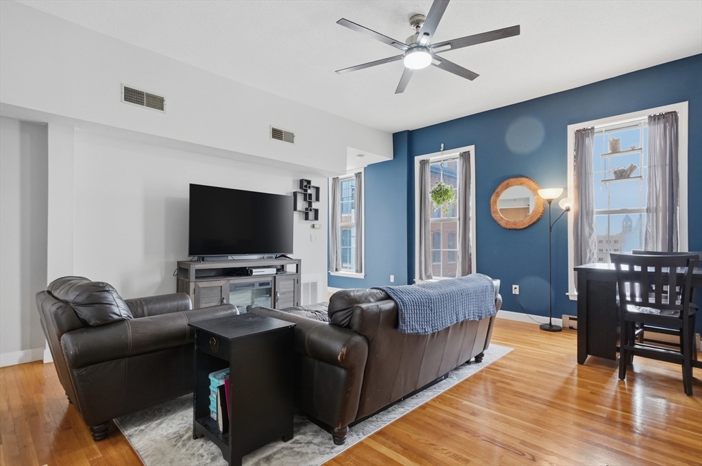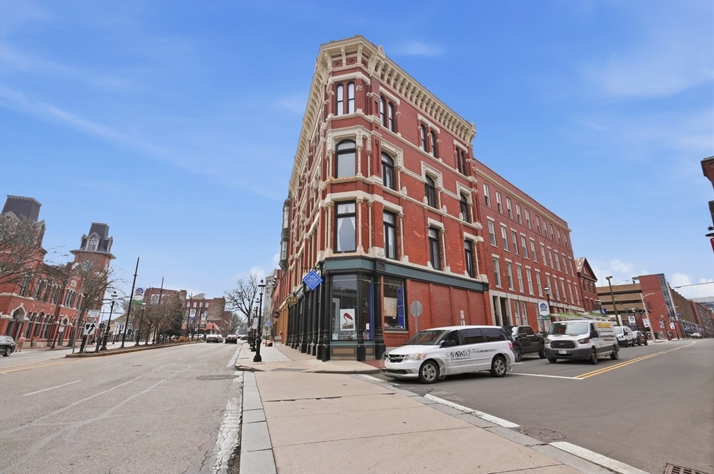 Welcome home to this charming 1-bedroom, 1-bath condo located in the historic Fiske Building, where timeless character meets modern convenience. Soaring high ceilings create an immediate sense of openness and light.The inviting primary bedroom features beautiful bamboo flooring, adding warmth and style to the space. The spacious living room showcases hardwood floors and large windows, creating a bright and welcoming atmosphere. The kitchen offers granite countertops and durable tile flooring, blending function and style for everyday living. Enjoy the ease of in-unit laundry and the added value of hot water included in the condo fee. Ideally situated just moments from the MBTA stop, this location offers effortless commuting and access to nearby shops, dining, and amenities. Whether you're a first-time buyer, downsizing, or seeking a great investment opportunity, this well-maintained unit delivers comfort, convenience, and classic appeal in a sought-after setting.