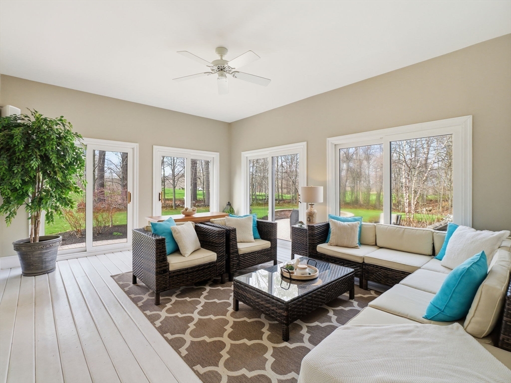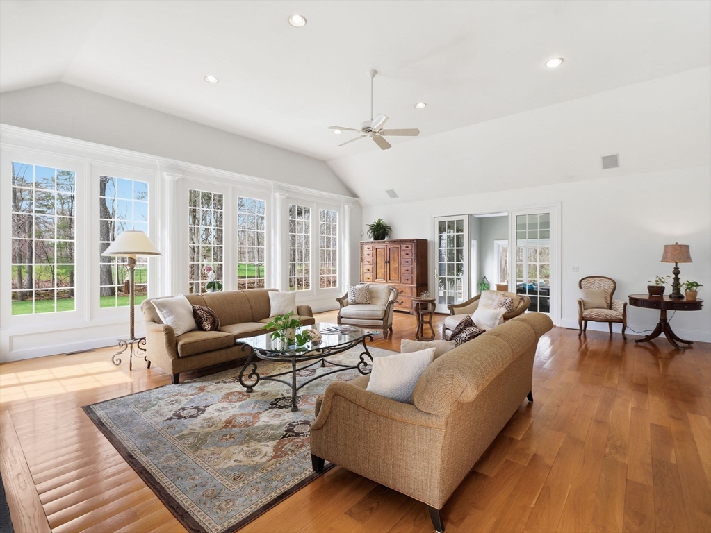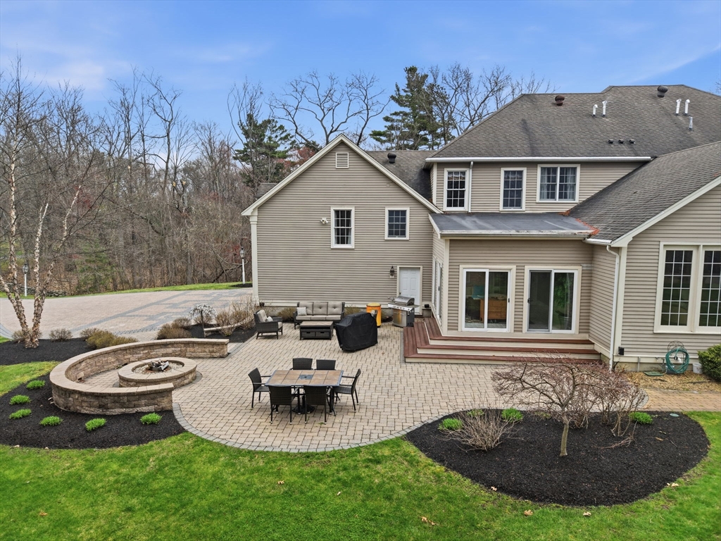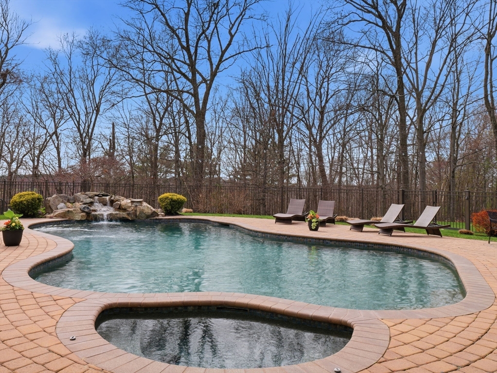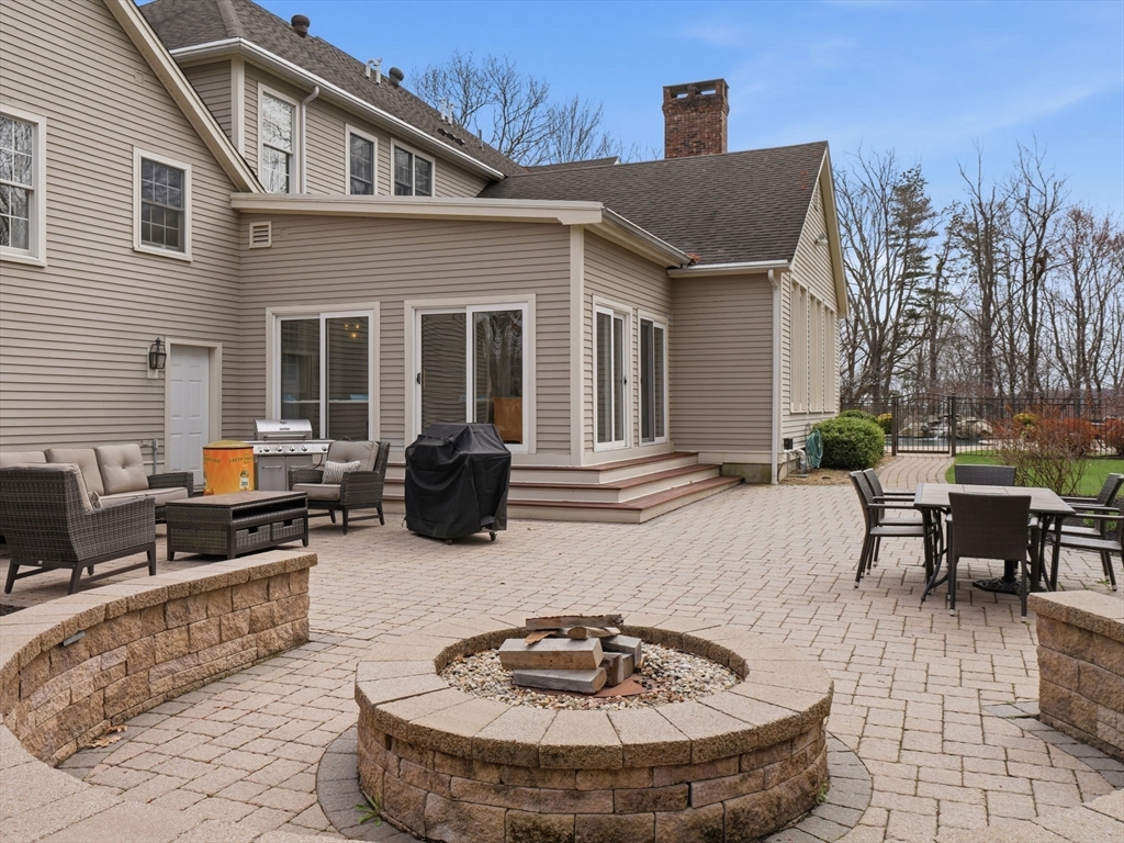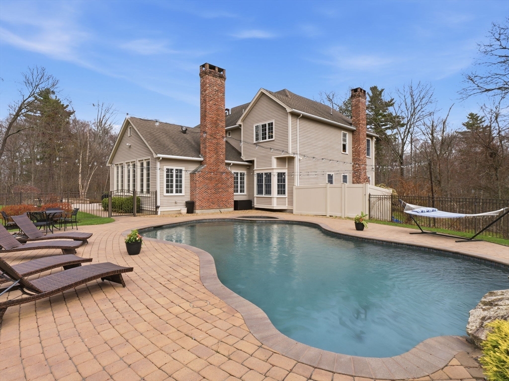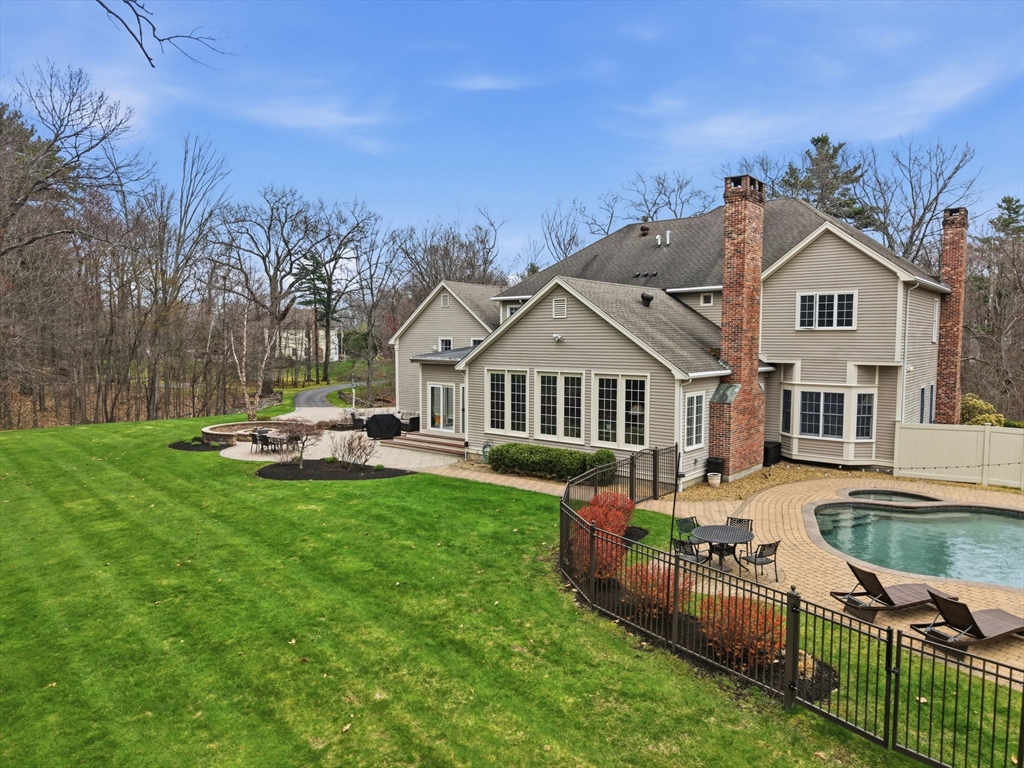 Welcome home to this LUXURY Boxford Colonial home, set on over 6 acres abutting Far Corners Golf Course. This 5 bedroom, 4.5 bathroom estate offers vacation style living at its finest, anchored by a stunning heated Gunite in-ground pool with waterfall. Inside, a sunlit gourmet kitchen, formal living with fireplace (with fresh interior paint) spacious family rooms, and a soaring 2nd floor Great Room with cathedral ceilings set an elegant tone. Four bedrooms enjoys there own private bath, while the primary suite (with fresh interior paint) features a walk-in closet and spa-inspired bath. The walk-out lower level offers a custom dance studio, media room, and dedicated entertainment space. Outside, the pool, spa, firepits, multiple patios, and professionally landscaped gardens create a truly private outdoor sanctuary. 3 car garage and plenty of guest parking. Convenient Route 95 access, and a coveted cul-de-sac setting make this a rare opportunity not to be missed.