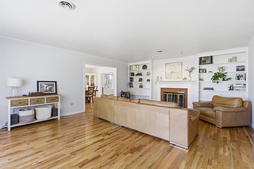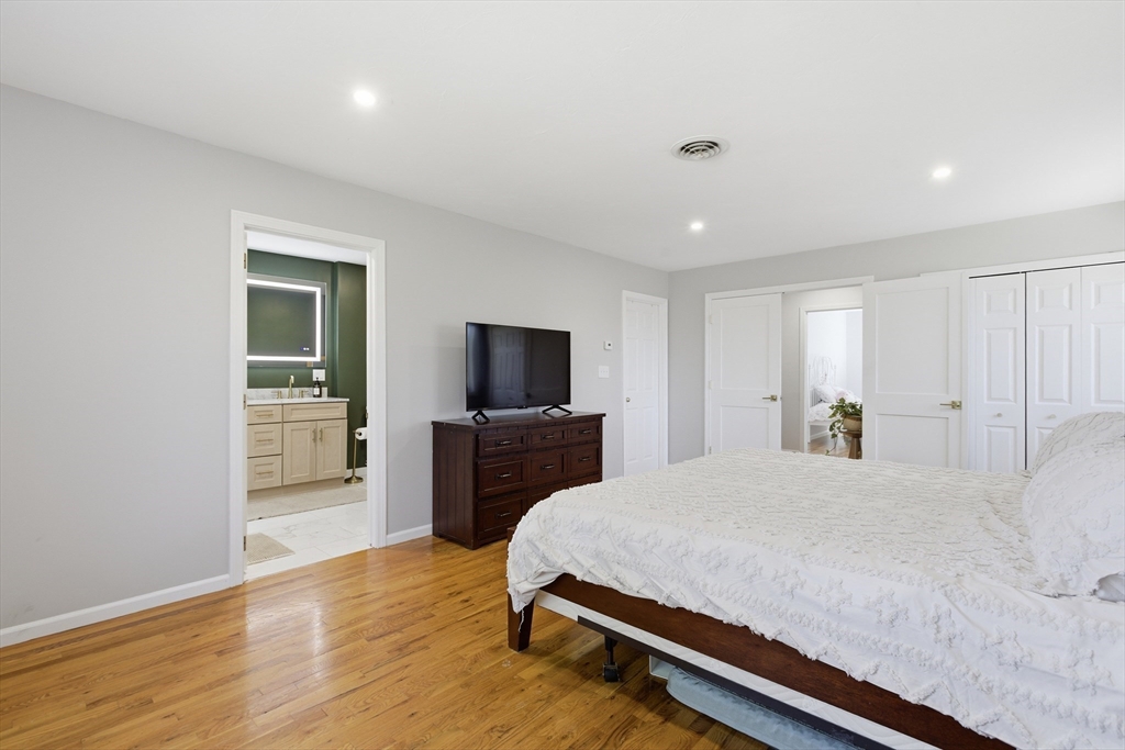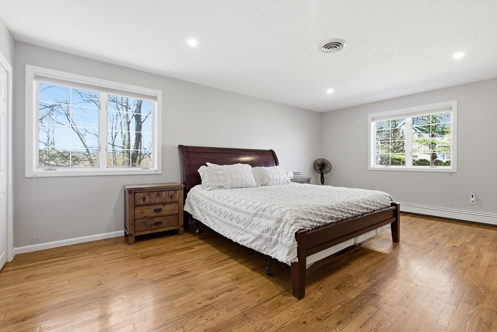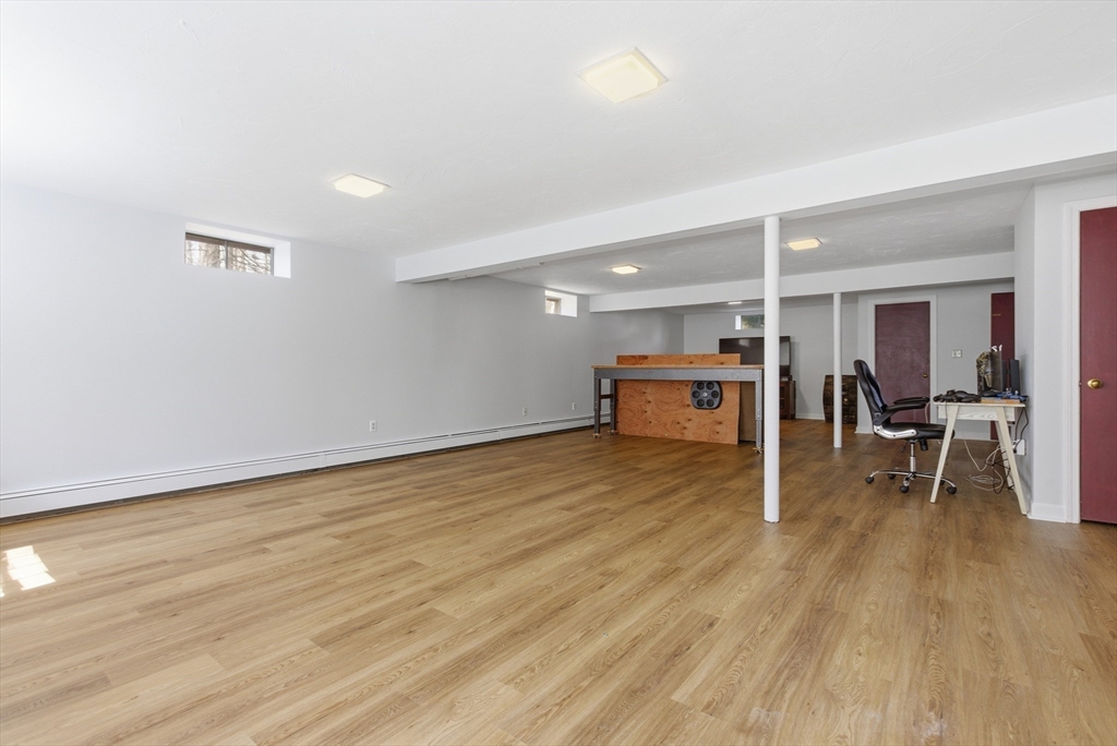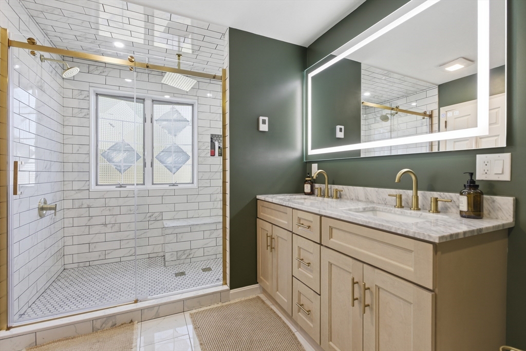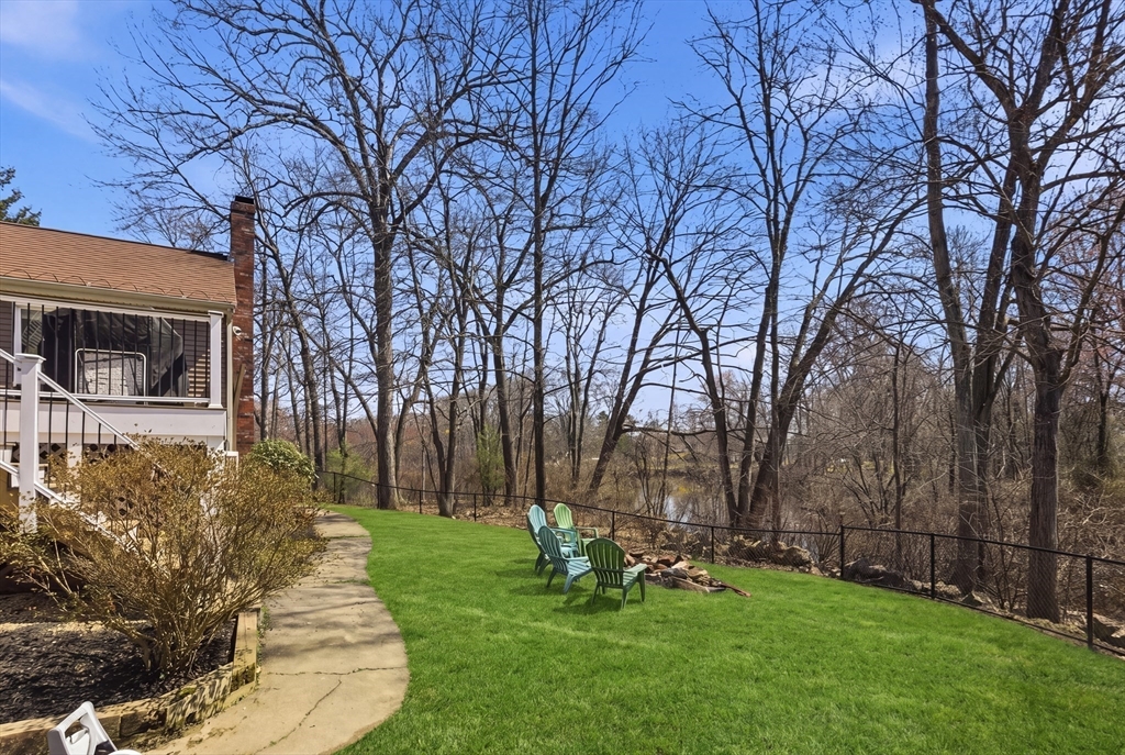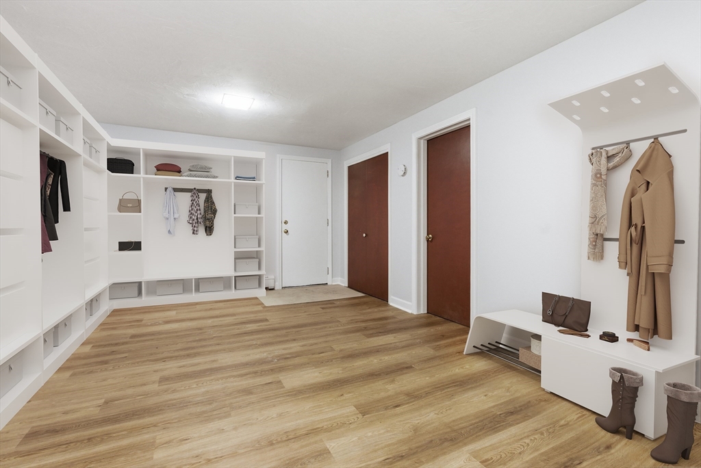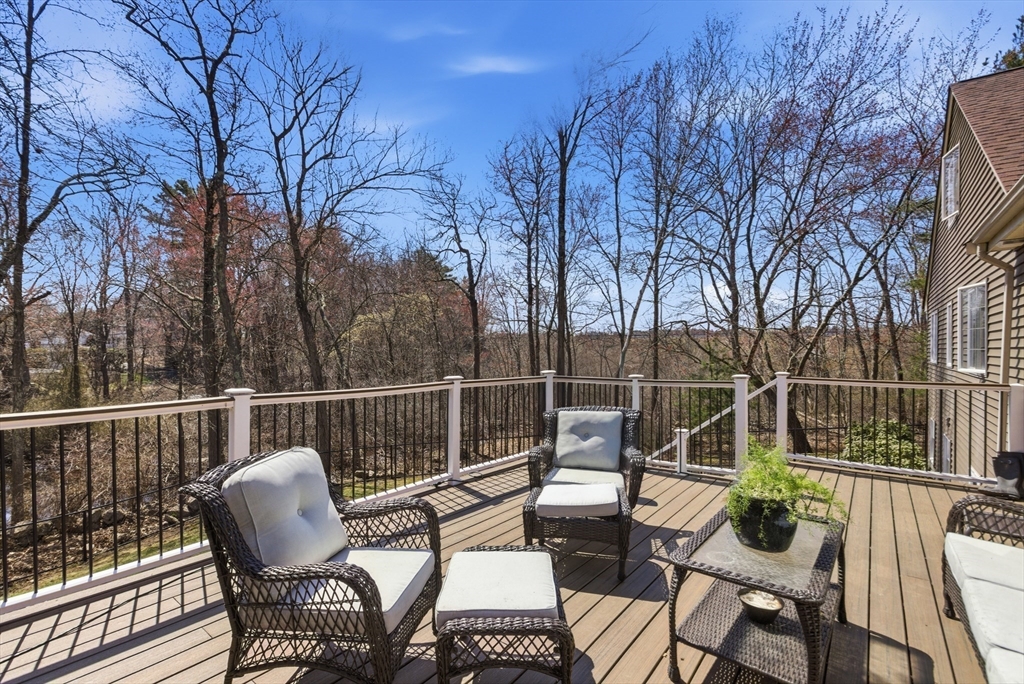 Welcome to 28 Lancelot Court, an exceptional, sun-drenched residence on Guild Pond (adjacent Willet Pond), set on a cul-de-sac. This expanded ranch/cape offers elegant single or two-floor living with generous scale for family needs. The main level features two living rooms, a formal dining room, an office, two large bedrooms, a half bath and full bathroom, plus a newly remodeled primary suite with en suite bath. The suite boasts an oversized walk-in closet with custom built ins and a luxurious primary bathroom. The massive primary bathroom shower features heated flooring, an L-shaped bench, 8 foot floor to ceiling tile, and 8 spa-like shower heads. The second floor provides two oversized bedrooms and an additional full bath. The fully finished walk out lower level — with mudroom, gym, full bath, game room and expansive family room — presents turnkey potential for an in law suite or ADU with no interior stairs required. Enjoy serene, panoramic views of Guild Pond from the rear deck.