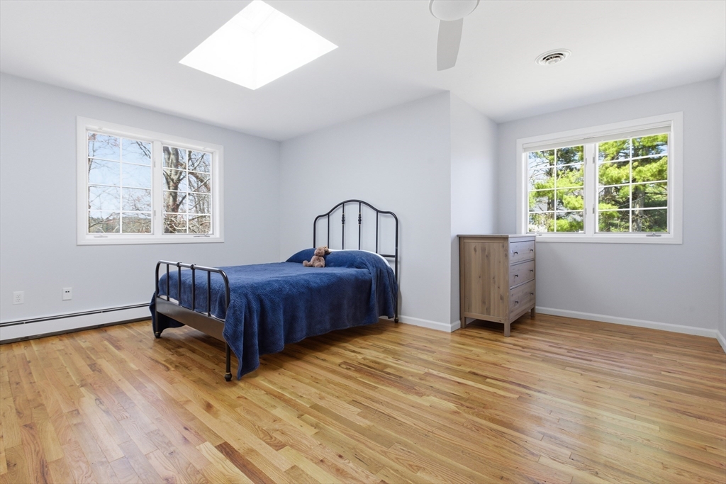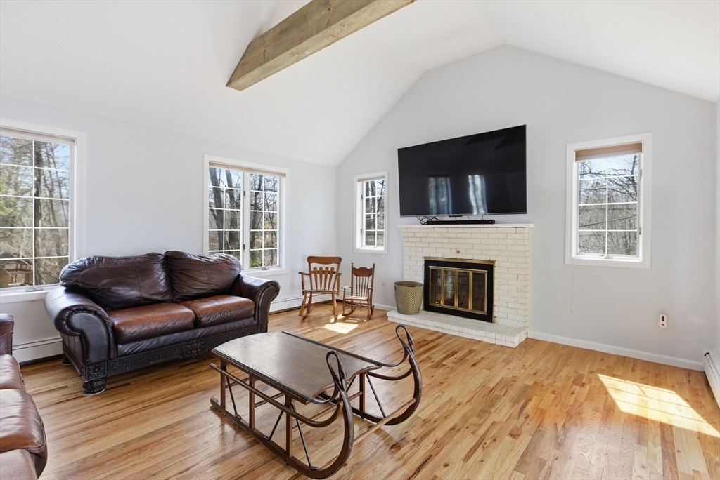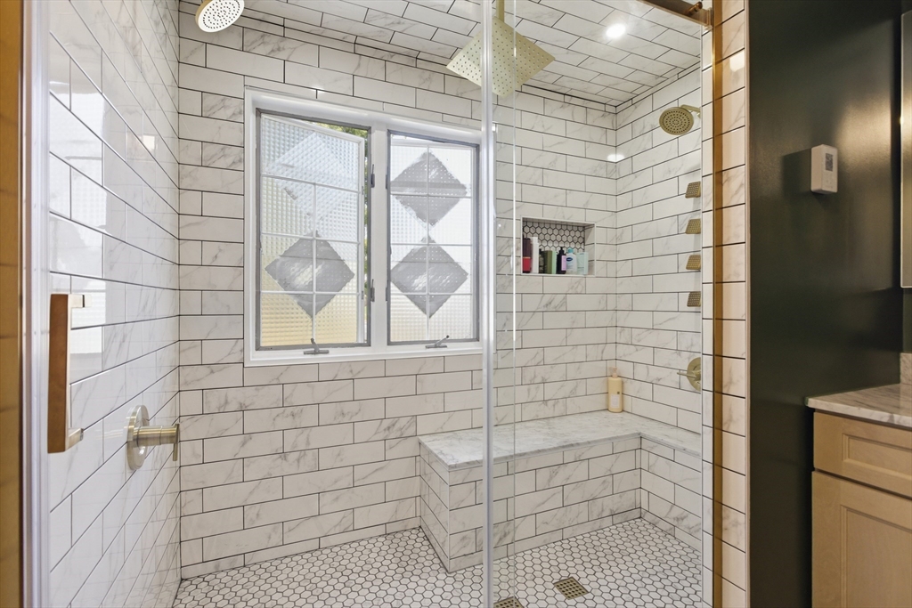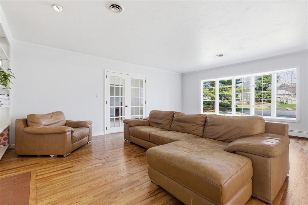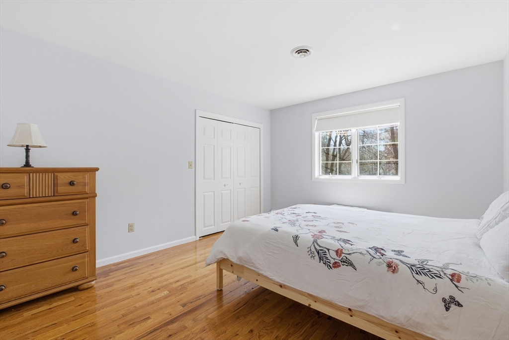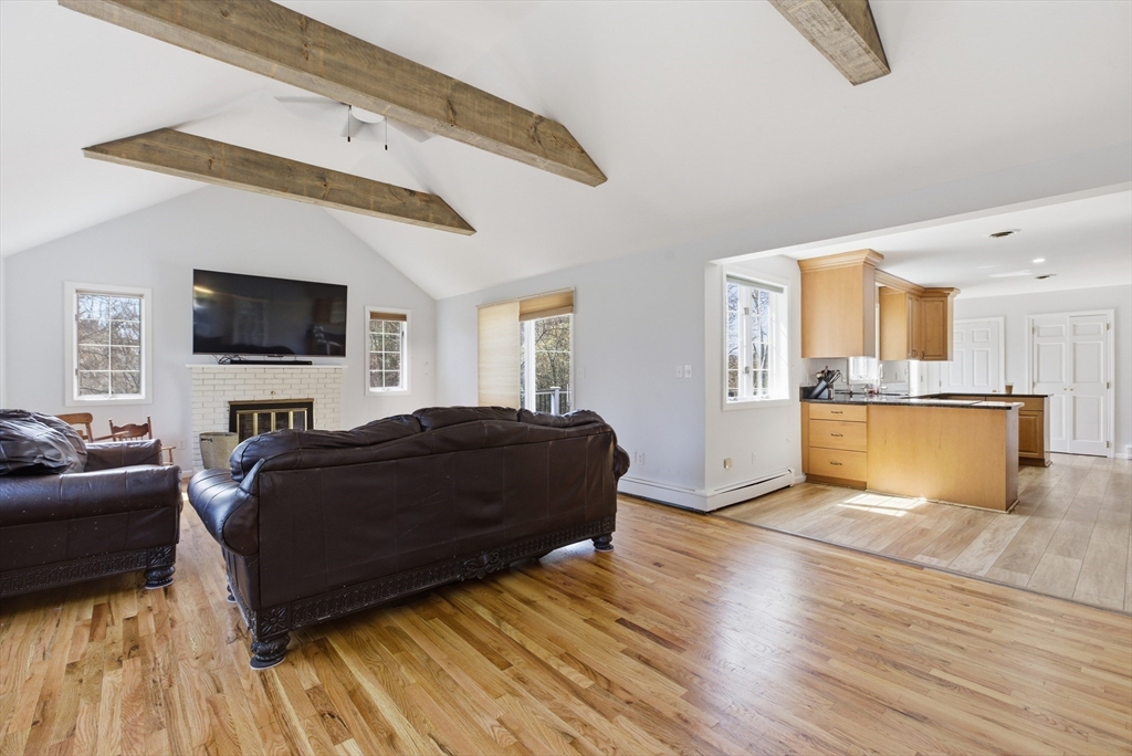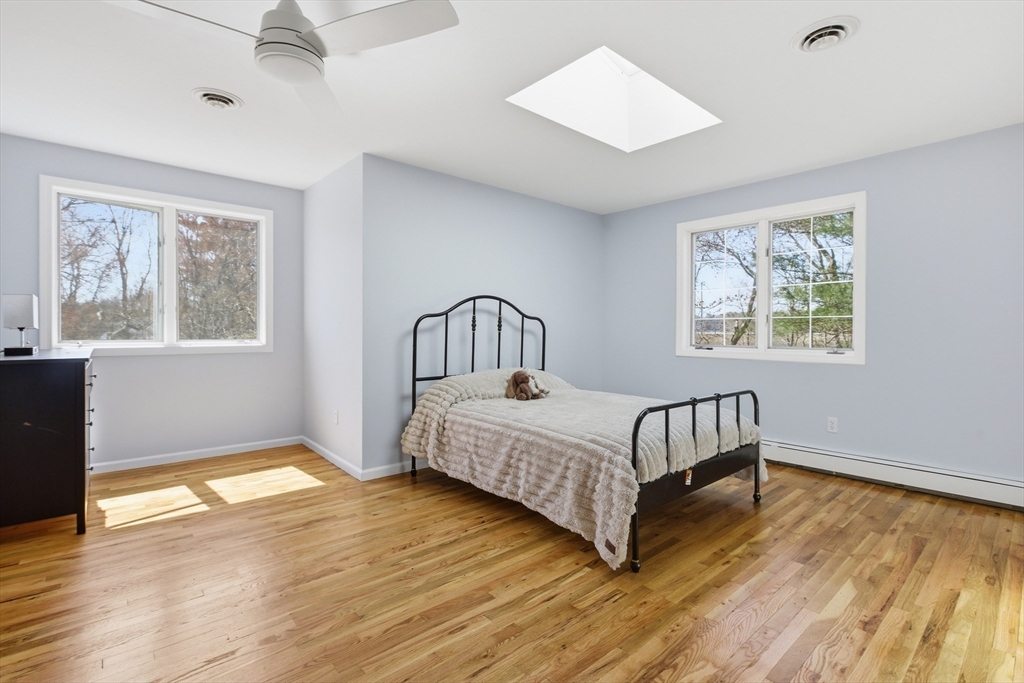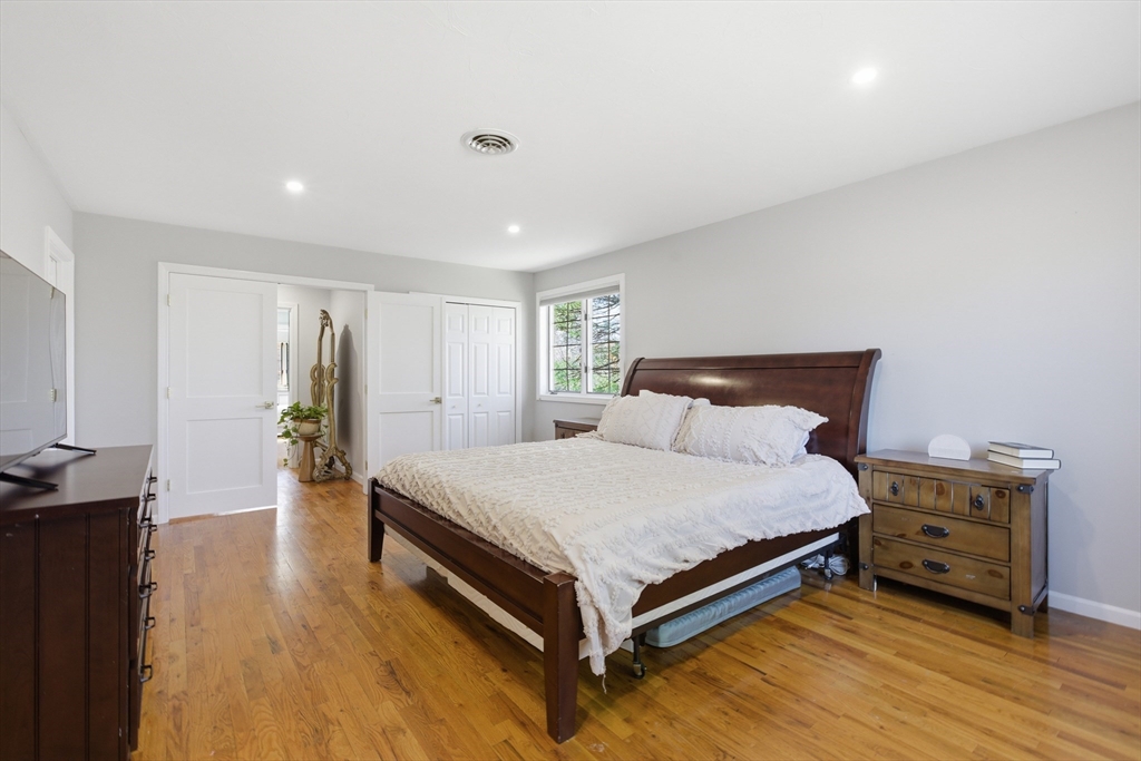 Welcome to 28 Lancelot Court, an exceptional, sun-drenched residence on Guild Pond (adjacent Willet Pond), set on a cul-de-sac. This expanded ranch/cape offers elegant single or two-floor living with generous scale for family needs. The main level features two living rooms, a formal dining room, an office, two large bedrooms, a half bath and full bathroom, plus a newly remodeled primary suite with en suite bath. The suite boasts an oversized walk-in closet with custom built ins and a luxurious primary bathroom. The massive primary bathroom shower features heated flooring, an L-shaped bench, 8 foot floor to ceiling tile, and 8 spa-like shower heads. The second floor provides two oversized bedrooms and an additional full bath. The fully finished walk out lower level — with mudroom, gym, full bath, game room and expansive family room — presents turnkey potential for an in law suite or ADU with no interior stairs required. Enjoy serene, panoramic views of Guild Pond from the rear deck.