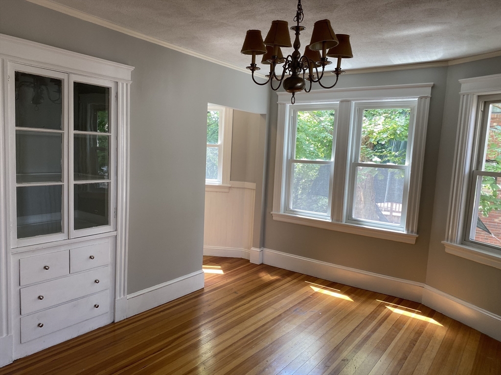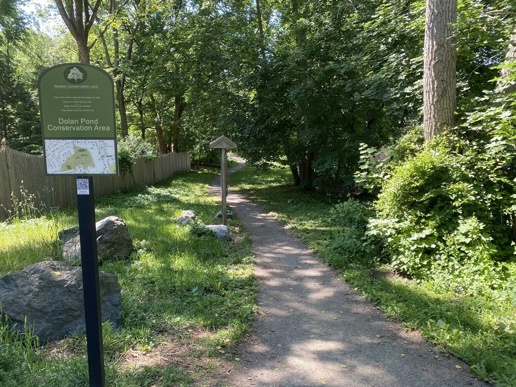 Fabulous West Newton location! Abuts Dolan Pond Conservation area and trails. Spacious two bedroom with modern kitchen and bath- recently painted throughout, Hardwood floors, wood burning fireplace in the living room, custom built-in in dining room, oversized tiled bathroom. Private rear deck. Landlord takes care of plowing driveway in winter months and landscaping. Tenant to share snow removal with other unit for front and rear entrances. Private laundry facilities in the basement plus additional storage if needed. Two parking spots side by side in the rear accessible with two driveway entrances. Backyard leads to the conservation area. Apartment is located one house over from the trail system. Great commuter location- short walk to W Newton train and bus line 553 & 554. Easy access to Mass Pike. Pet friendly but no more than 1 pet and subject to landlord approval.