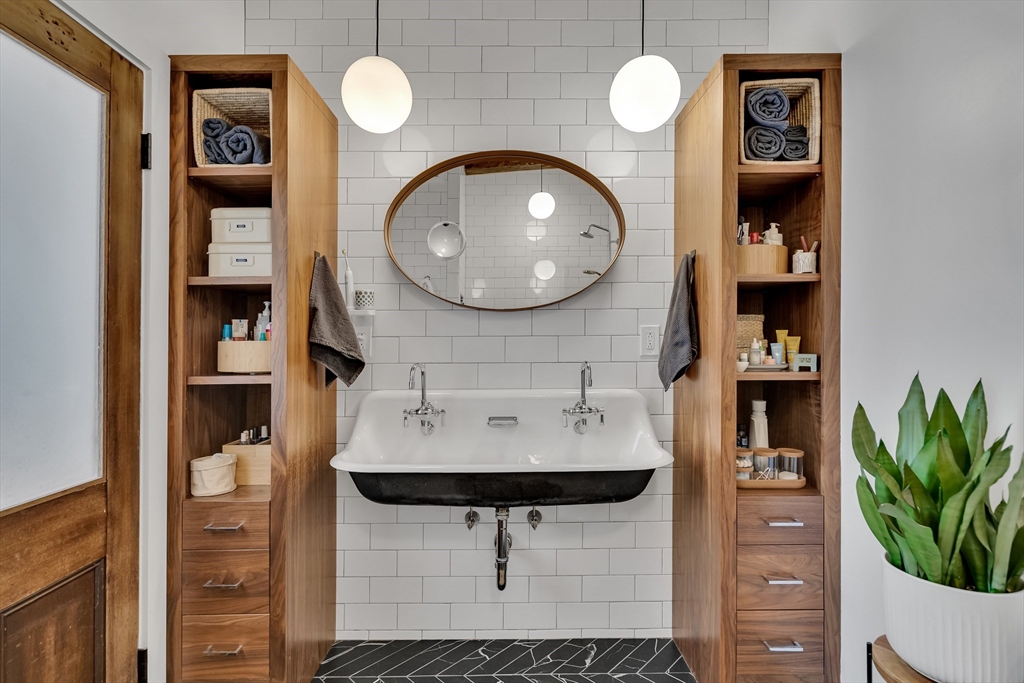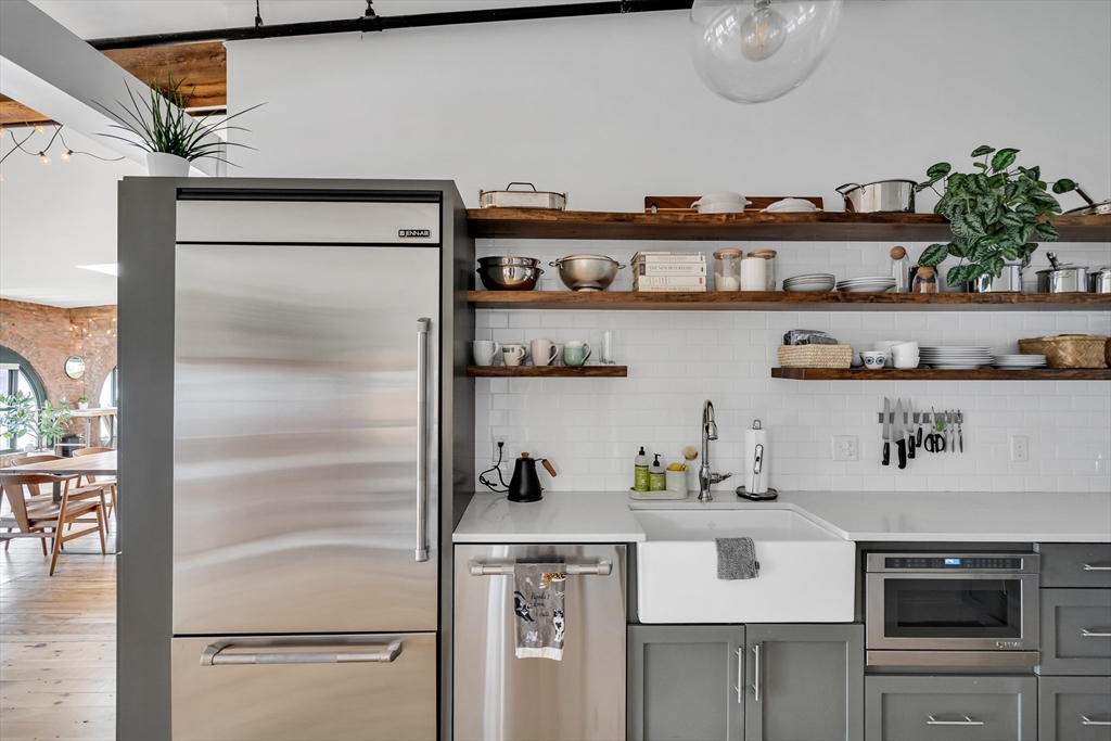 Stunning loft in the c. 1890 Carriage Building on Green Street in Jamaica Plain. This south-facing penthouse unit features exposed brick and heavy timber beams, numerous large arched windows, and original wood floors. Modern, high-end kitchen with white quartz counters, custom cabinetry, tiled backsplash, and Jenn-Air appliances. Designer bathroom with tile and warm wood accents. Fireplaced living room. Alcove bedroom with a deep walk-in closet, and office/seating area. Around the corner from the Southwest Corridor bike path, and the Orange Line at Green Street. Steps to celebrated eateries and cultural amenities on the Centre Street corridor and in Egleston Square. Entrance to Franklin Park two blocks away. Bicycle room, workout room, common patio with a grill, and extra storage in the basement. In-unit laundry. Assigned off-street parking.
