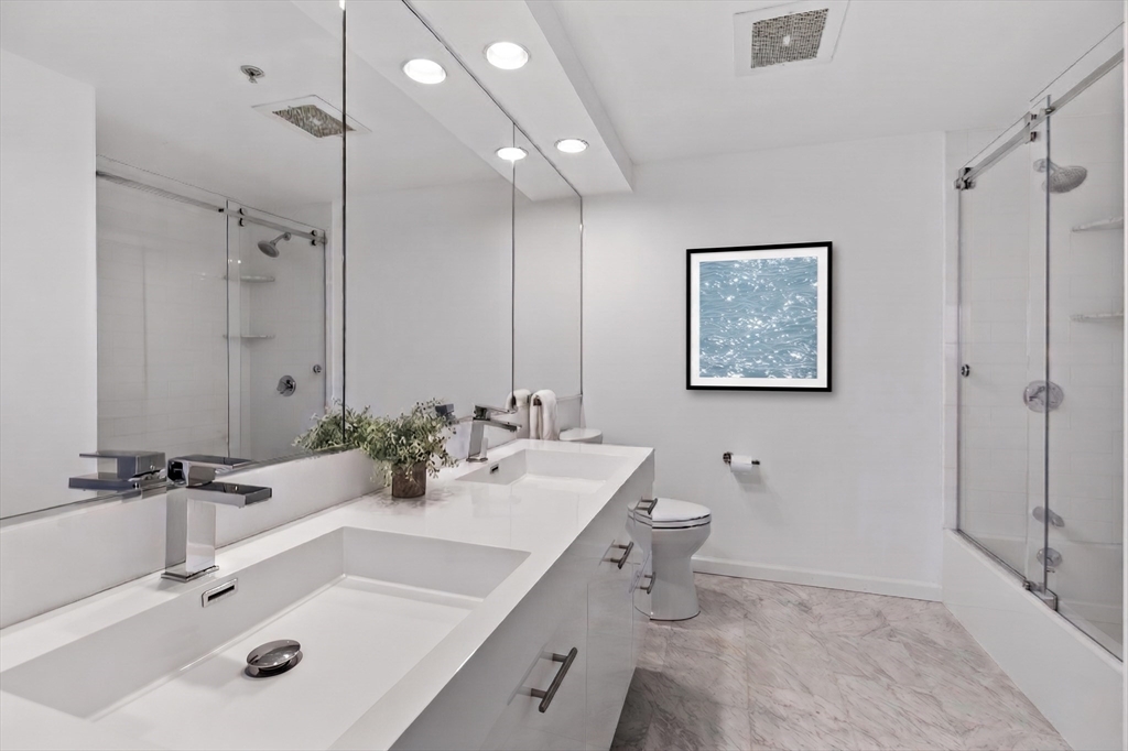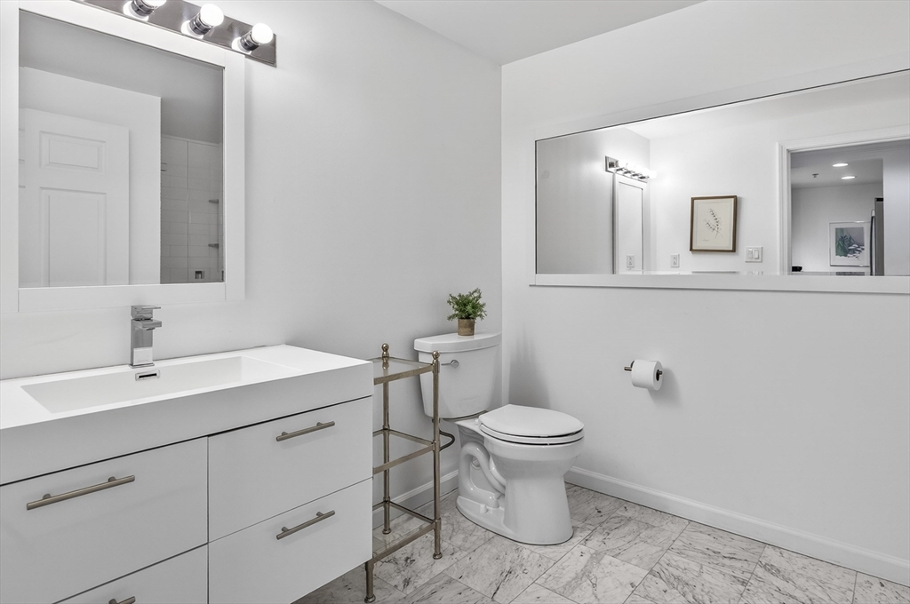 This sun-drenched corner unit has been meticulously updated to offer a modern, move-in-ready experience. Boasting one of The Metropolitan's most coveted floor plans, the layout offers a seamless flow between the spacious living and dining areas, perfectly separating the two bedrooms for maximum privacy & functionality.The home features new wood flooring throughout and a kitchen fully equipped with updated stainless steel appliances. The primary suite offers exceptional organization, outfitted with new built-in storage, custom closets & a private ensuite bath. Both full bathrooms have been elegantly renovated with Carrara marble tile, new toilets & fixtures—including a bathtub/shower combo in the ensuite and a sleek, glass-enclosed shower in the second bath.The spacious second bedroom also features custom-outfitted closets, ensuring ample storage throughout. The home is complete with a brand-new W/D & framed by beautiful downtown Boston views. Professionally managed & onsite garage.