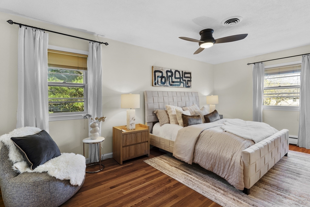 Situated on a coveted South Side Newton street surrounded by multi-million dollar homes, this 1967 split-level offers space, flexibility, and opportunity. Set on a generous 15,000 sq ft lot, the home features 4 bedrooms, 2.5 baths, and an oversized two-car garage leading to a mudroom and updated half bath (2020). The main level boasts a beautiful living and dining room anchored by a stunning stone-flanked fireplace, with French doors opening to a versatile office or additional living space. The kitchen includes an island with bar stools. Upstairs offers four bedrooms, including a primary suite with a large walk-in closet and bath ready for your personal touch, plus an updated full bath (2020). The lower level features a spacious den with direct access to the patio, and a basement ideal for play or additional living space. Prime location close to everything Newton has to offer.