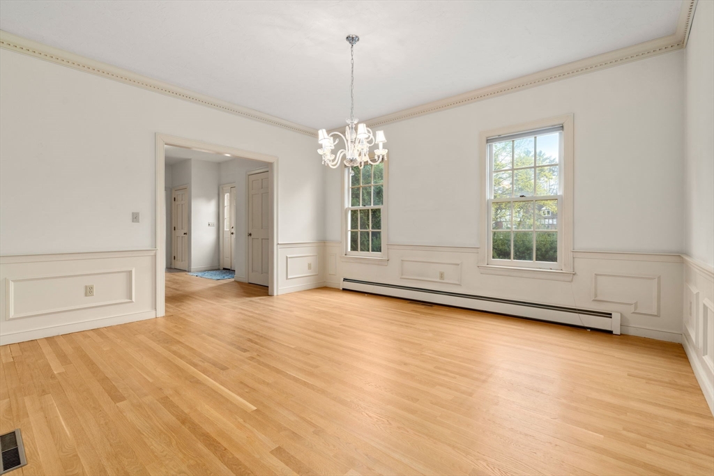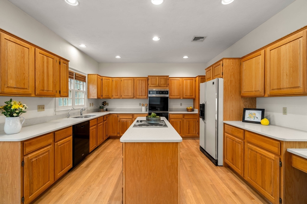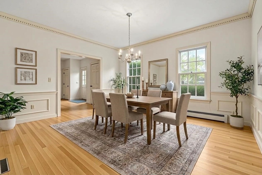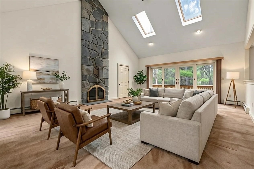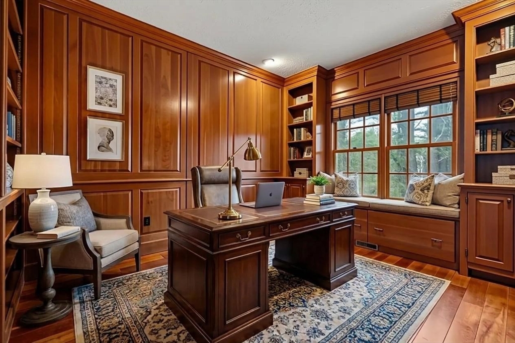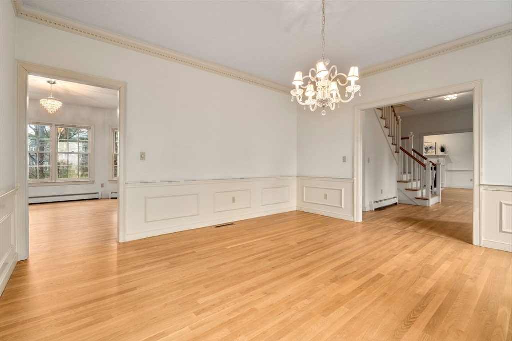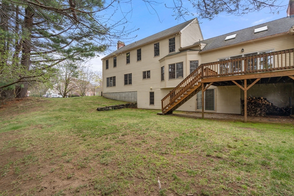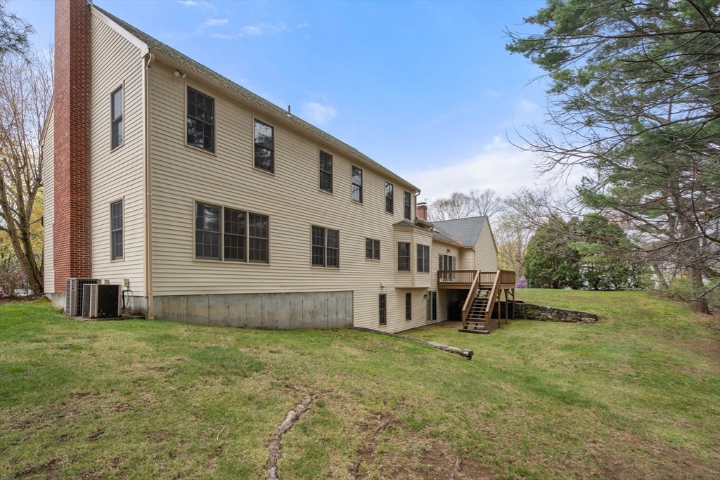 Set in the sought-after Atkinson Farms neighborhood, this elegant residence offers over 3,300 sq ft of refined living space across the main two floors, featuring newly refinished hardwood flooring on the first floor. A dramatic cathedral-ceiling family room with floor-to-ceiling fireplace flows seamlessly to a private deck through French doors and opens to an expansive eat-in kitchen with center island—ideal for both everyday living and entertaining. Formal living and dining rooms are enhanced by detailed crown molding. A private office with custom built-ins provides an exceptional work-from-home experience. First-floor laundry adds convenience. The spacious primary suite includes a private bath, complemented by three additional generously sized bedrooms. Level backyard, three-car garage, gas heat. Ideally located near town fields, playground, and community center