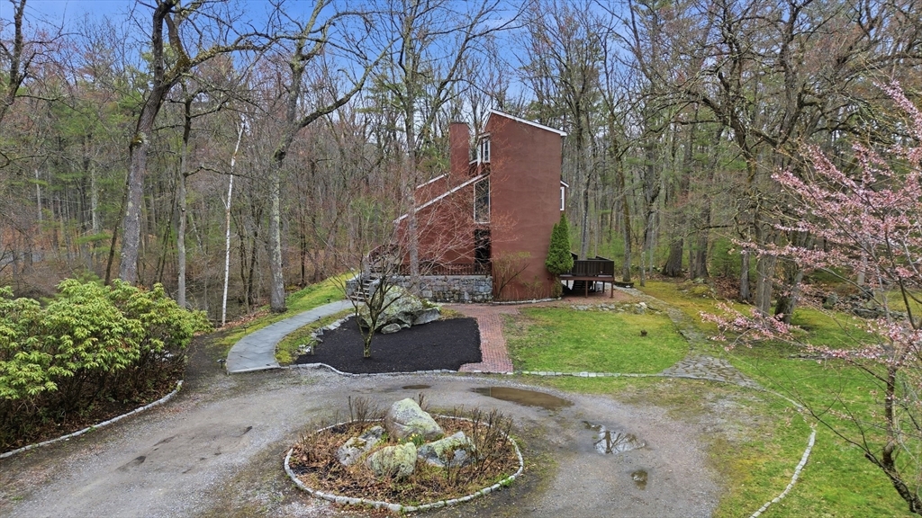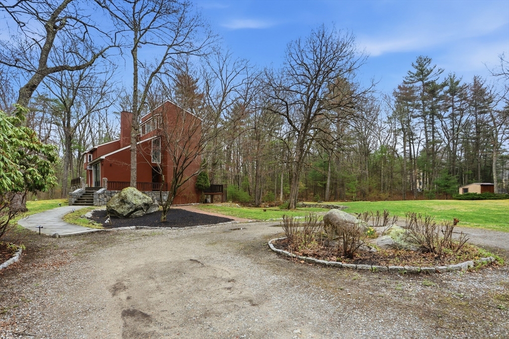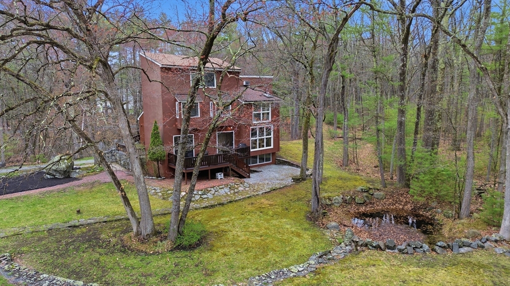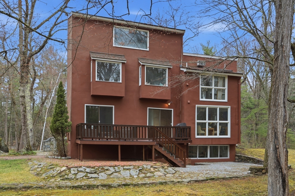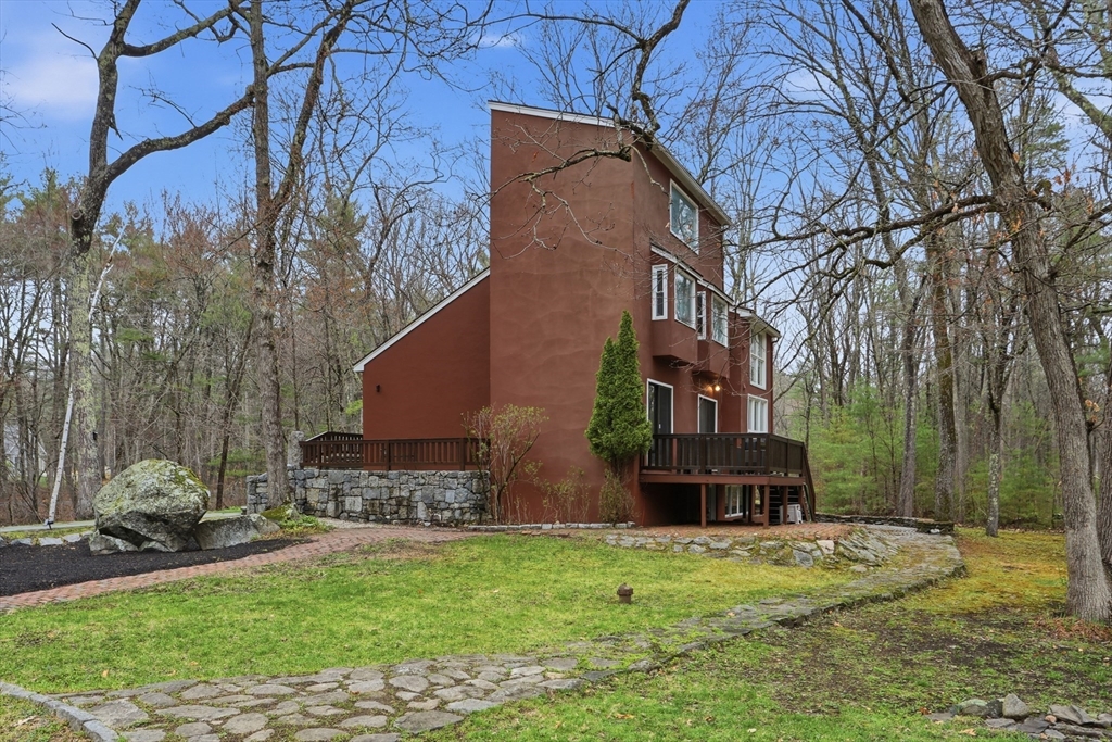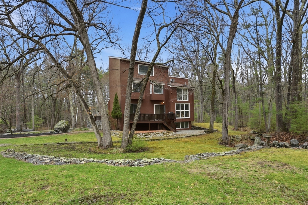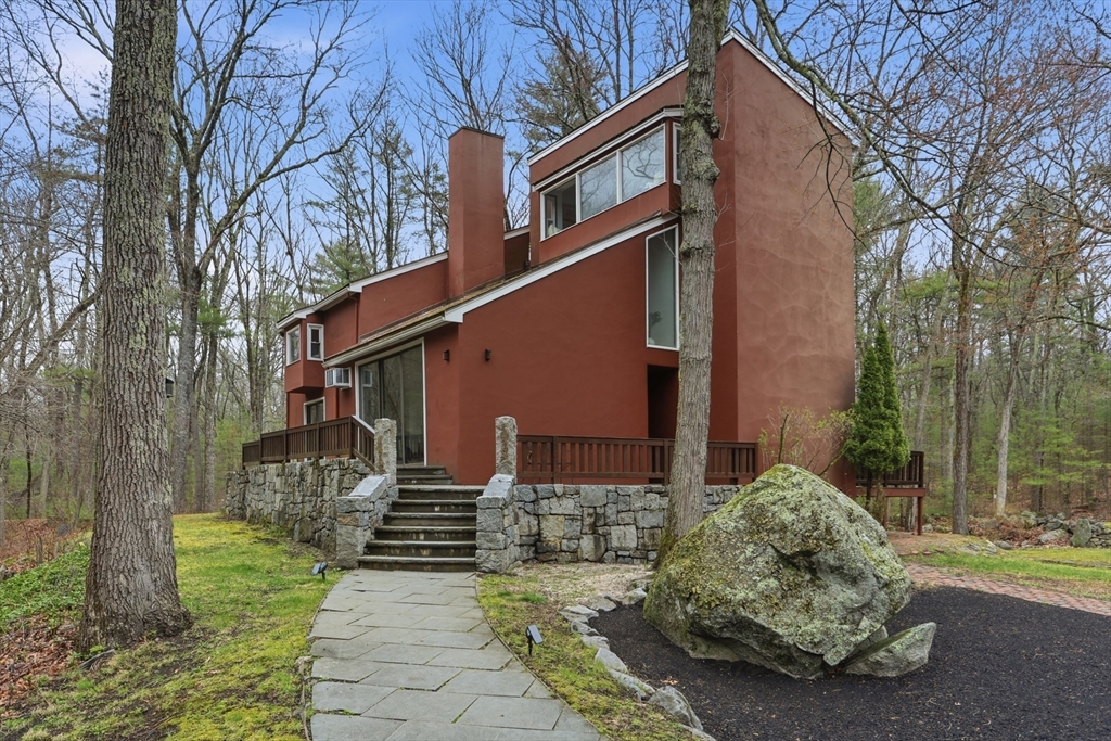 Nestled on a picturesque lot, abutting conservation land & trails, this contemporary home blends modern design & natural beauty. Set back & surrounded by trees, this property provides a peaceful retreat w/a special landscape. A bright layout w/soaring ceilings, expansive windows & seamless flow. A sun-filled LR is anchored by a FP & pellet stove & opens to an oversized deck. Kitchen offers SS appliances & dining w/lovely views. 4 BR’s, including a spacious primary, along w/a versatile bonus rm perfect for office, playroom or studio provide comfort & functionality. Outside enjoy an expansive yard, stonework & natural features, where a seasonal vernal pond enhances the property’s charm & ecological appeal. Relax on the deck, explore the grounds, or host gatherings, this home offers a rare connection to nature. Located in Chestnut Estates, close to local amenities, conservation land & top-rated schools. A truly special offering—where contemporary living meets a peaceful, natural setting.