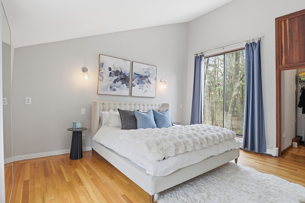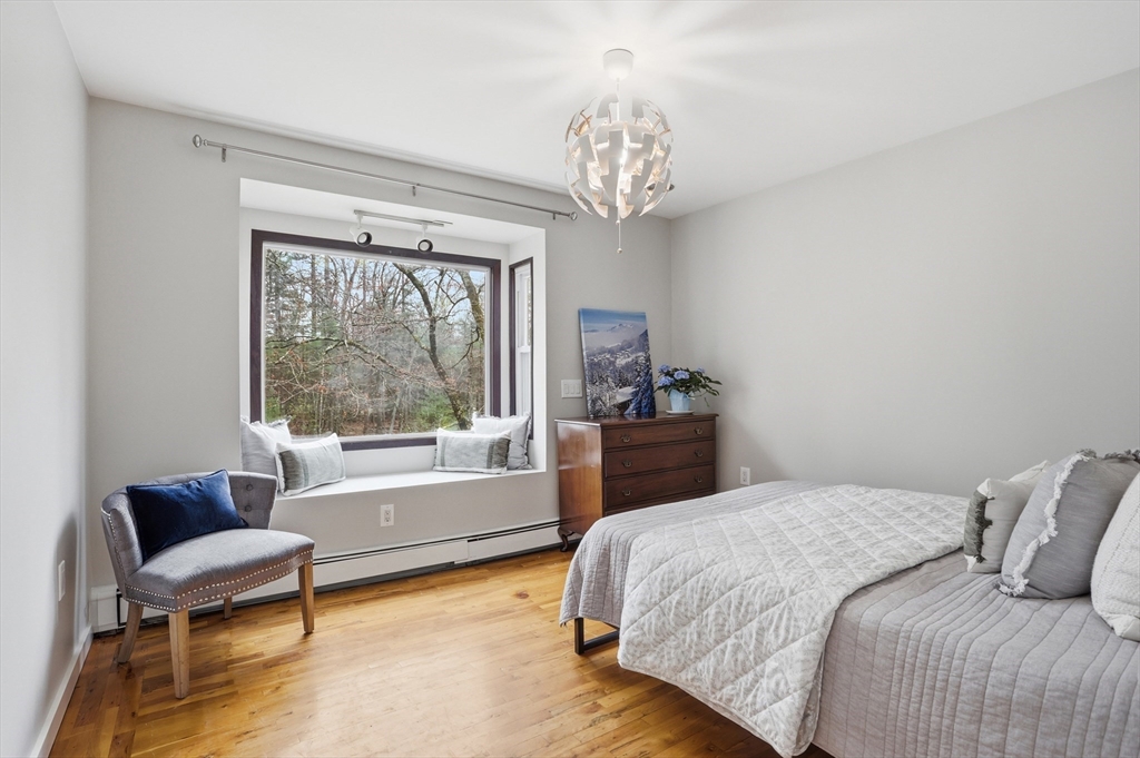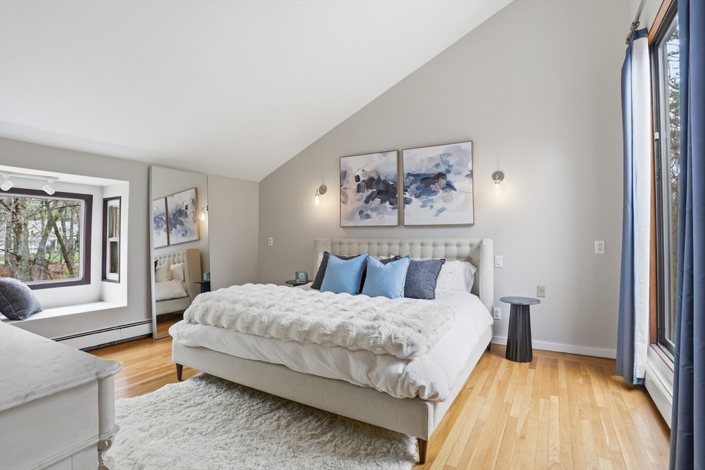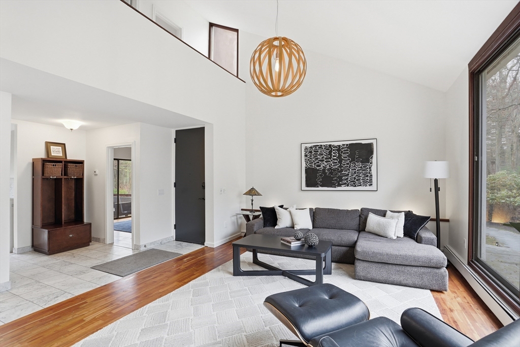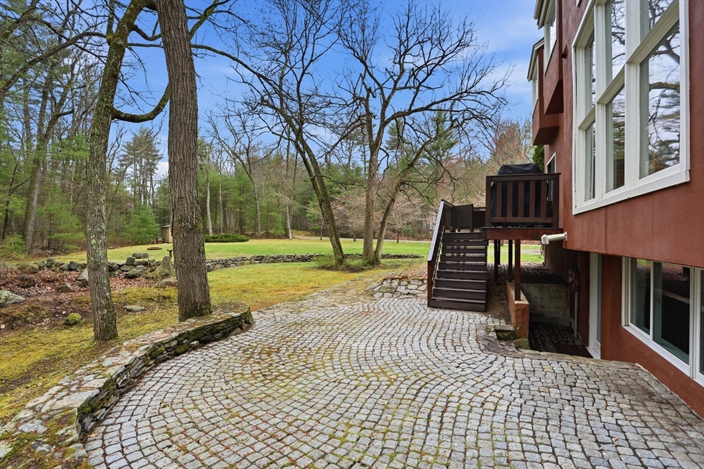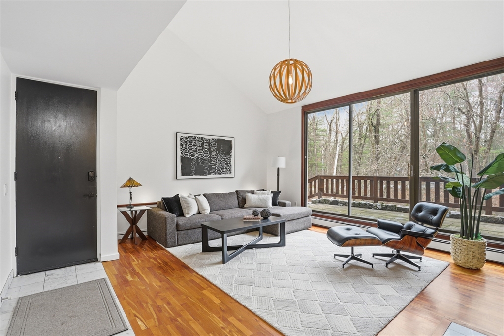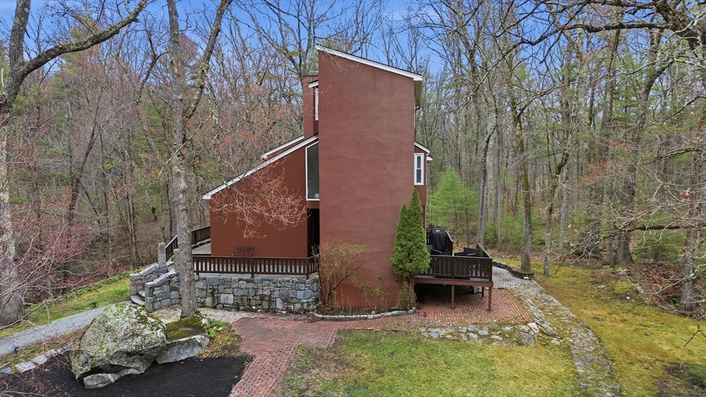 Nestled on a picturesque lot, abutting conservation land & trails, this contemporary home blends modern design & natural beauty. Set back & surrounded by trees, this property provides a peaceful retreat w/a special landscape. A bright layout w/soaring ceilings, expansive windows & seamless flow. A sun-filled LR is anchored by a FP & pellet stove & opens to an oversized deck. Kitchen offers SS appliances & dining w/lovely views. 4 BR’s, including a spacious primary, along w/a versatile bonus rm perfect for office, playroom or studio provide comfort & functionality. Outside enjoy an expansive yard, stonework & natural features, where a seasonal vernal pond enhances the property’s charm & ecological appeal. Relax on the deck, explore the grounds, or host gatherings, this home offers a rare connection to nature. Located in Chestnut Estates, close to local amenities, conservation land & top-rated schools. A truly special offering—where contemporary living meets a peaceful, natural setting.