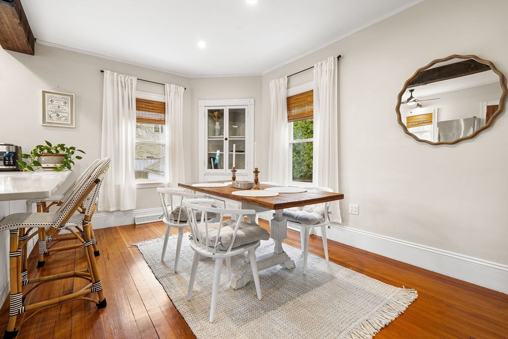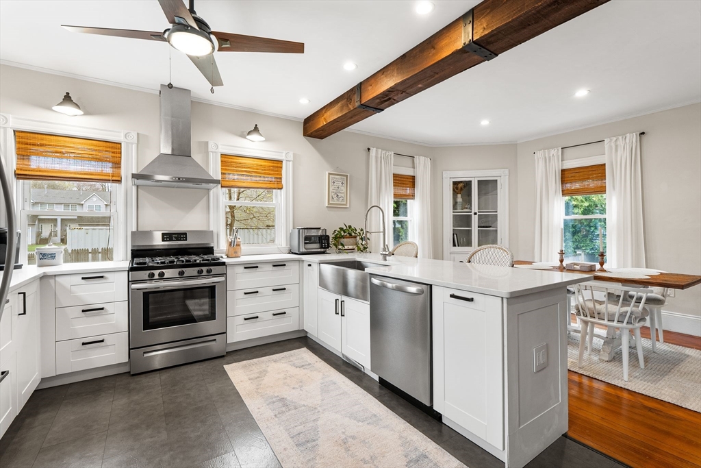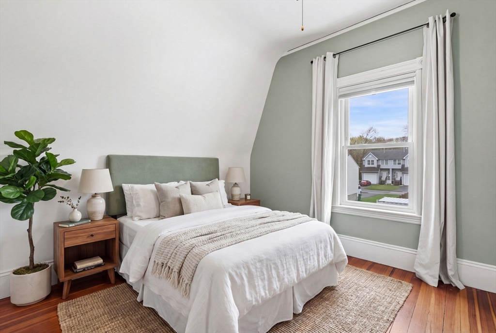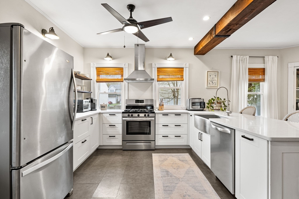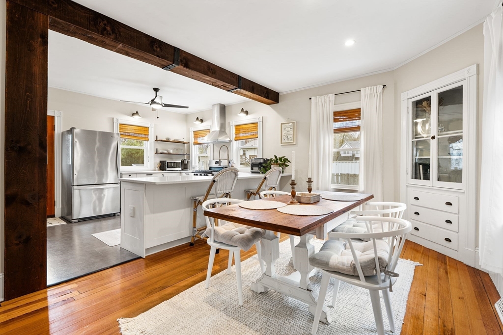 Historic yet modern 3 bedroom Colonial in South Framingham. This recently updated home has features that are not to be missed, including a newer eat-in kitchen featuring quartz countertops, stainless steel appliances, and luxury vinyl tile with brick and beam features. High ceilings and refurbished hardwood floors lay throughout, as well as recessed lighting, and ample natural sunlight. Upstairs are spacious 3 bedrooms with plenty of closet space. Heat pump and central air installed in 2024, Fully enclosed oversized backyard, and thermal windows complete this house. Located on a quiet side street, steps from all that Framingham/Ashland have to offer, including steps from Market Basket, and the commuter rail.