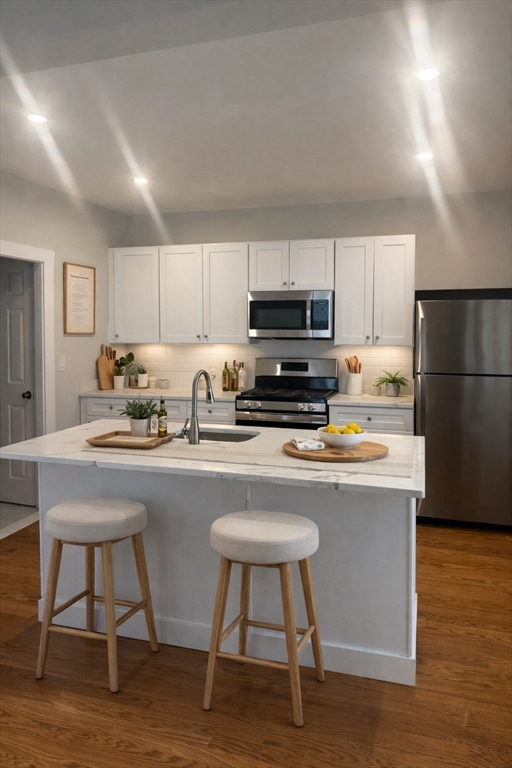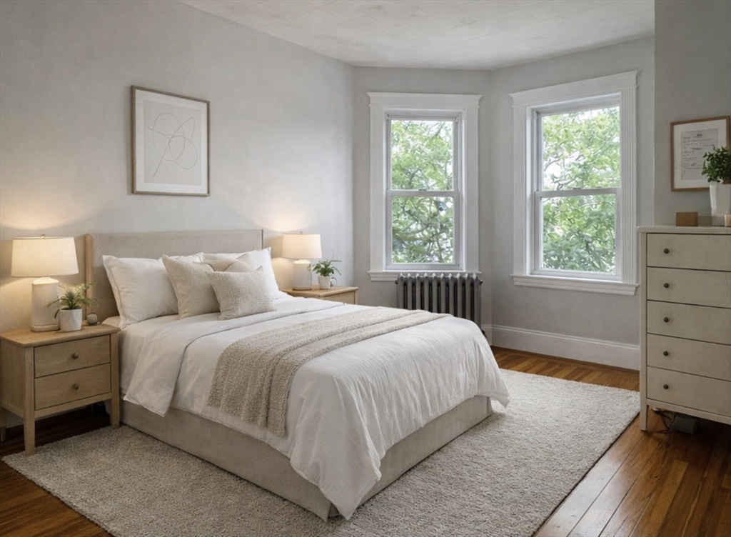 This recently updated 3-bedroom, 1-bathroom residence at 30 Monmouth Street in East Boston's Eagle Hill features a modern white kitchen with stainless steel appliances, a central kitchen island, and the convenience of in-unit laundry. The interior is finished with classic hardwood floors and window air conditioning, while a private porch provides a perfect dedicated space for outdoor entertaining. Located just Miles from Maverick and Airport Blue Line stations, the property offers an exceptional 8.2/10 transit score with immediate access to several local bus lines. Residents are steps away from a diverse culinary scene, including local favorites like D'Parma, Angela's Cafe, and the legendary Santarpio's Pizza, along with upscale waterfront dining at MIDA.