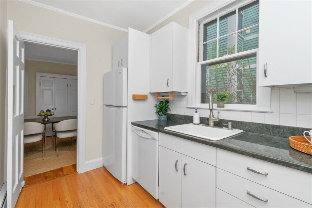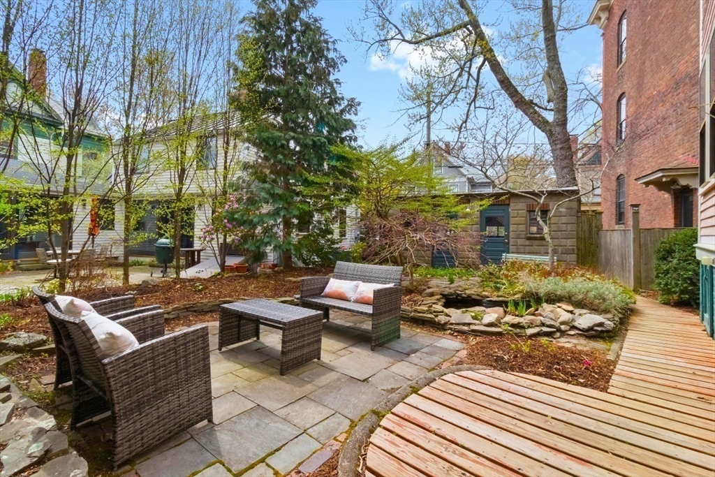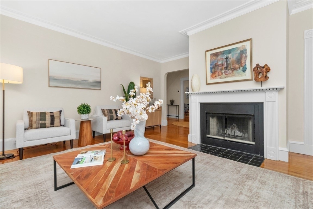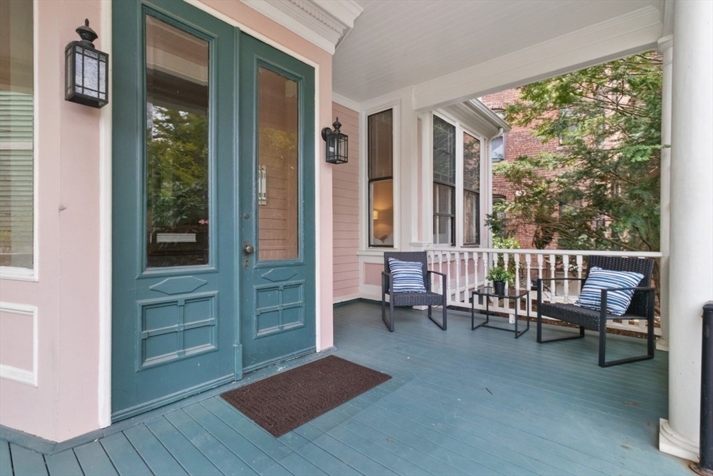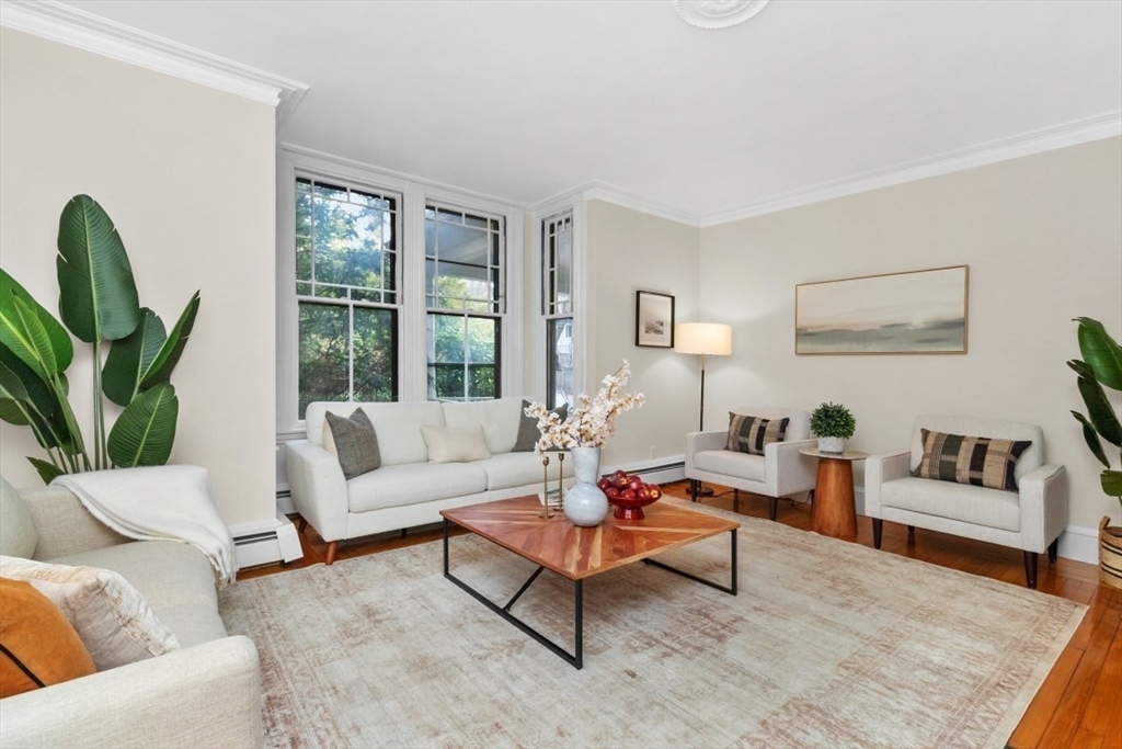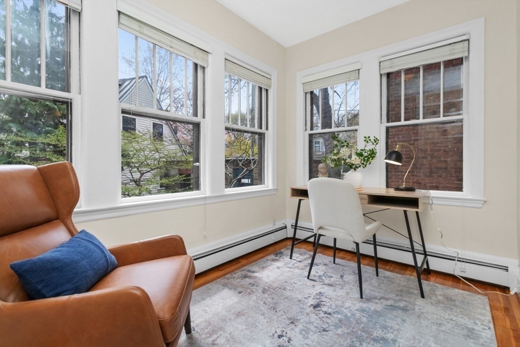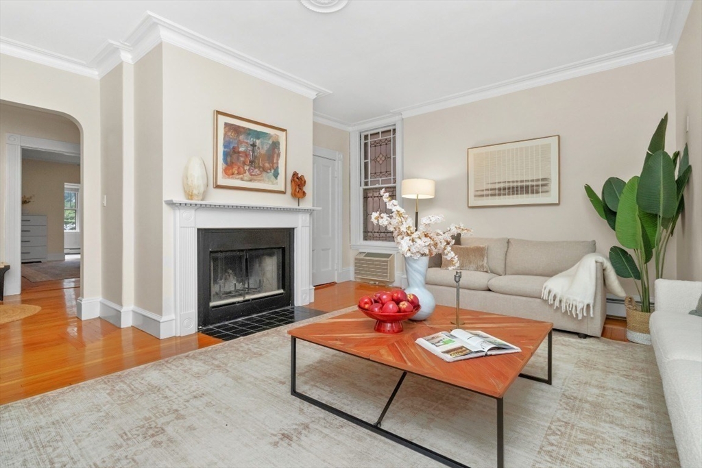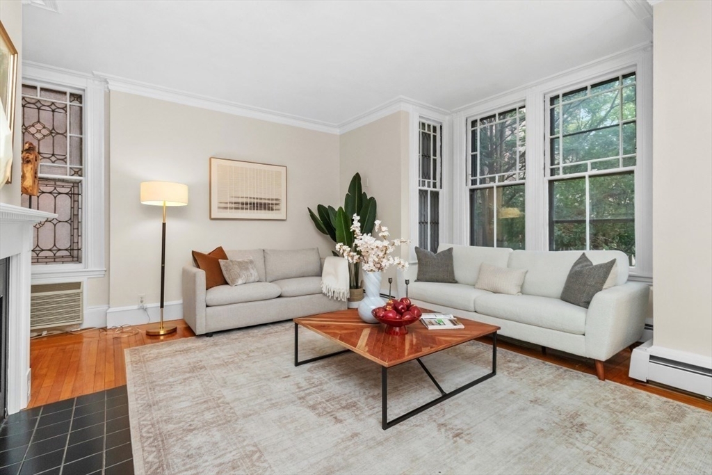 Charming 1+ bed with office, private patio, and EV-capable GARAGE PARKING in a beautiful 1880 Queen Anne–style 3-unit building between Harvard & Porter Sq’s. Enter through a welcoming front veranda into a foyer and a home rich with classic detail—high ceilings, intricate moldings, and newly refinished hardwood floors. The open center hall offers space for a desk or reading nook. Spacious fireplaced living room with two bay windows, plus a separate dining room with built-in hutch and custom pantry. The galley kitchen features ample cabinetry and counter space with direct access to a private patio and garden. Generous bedroom with two oversized closets, plus a bright office/den with built-ins and great natural light. Additional features include garage parking, basement laundry, and storage. Tucked on a private cul-de-sac off Linnaean St near Mass Ave, close to shops, dining, Harvard Law/Yard, and walk to either Red Line T stops. Pets allowed!