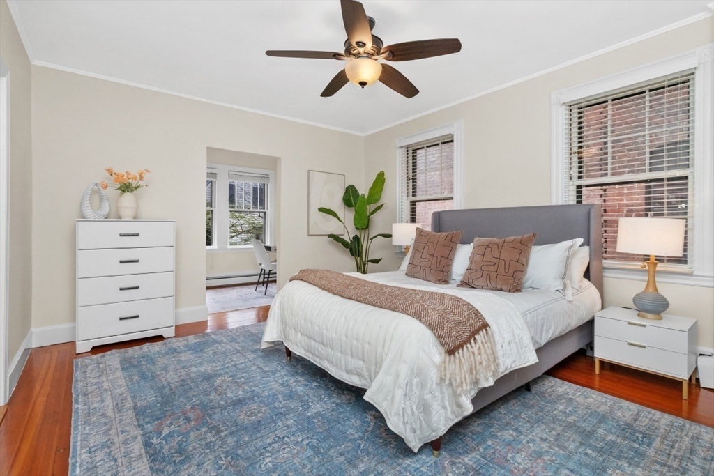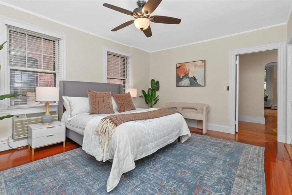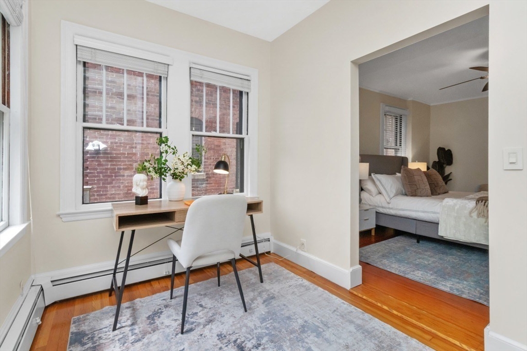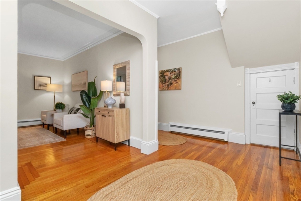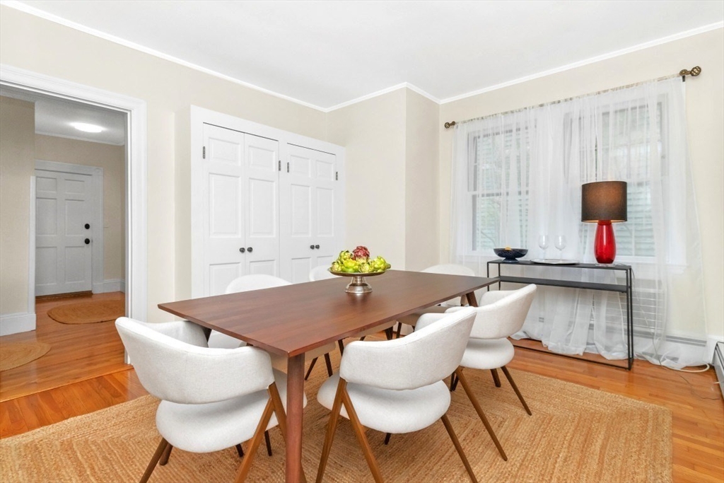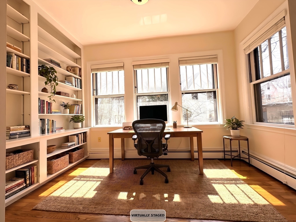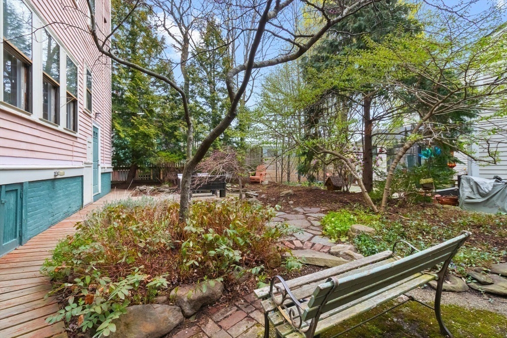Charming 1+ bed with office, private patio, and EV-capable GARAGE PARKING in a beautiful 1880 Queen Anne–style 3-unit building between Harvard & Porter Sq’s. Enter through a welcoming front veranda into a foyer and a home rich with classic detail—high ceilings, intricate moldings, and newly refinished hardwood floors. The open center hall offers space for a desk or reading nook. Spacious fireplaced living room with two bay windows, plus a separate dining room with built-in hutch and custom pantry. The galley kitchen features ample cabinetry and counter space with direct access to a private patio and garden. Generous bedroom with two oversized closets, plus a bright office/den with built-ins and great natural light. Additional features include garage parking, basement laundry, and storage. Tucked on a private cul-de-sac off Linnaean St near Mass Ave, close to shops, dining, Harvard Law/Yard, and walk to either Red Line T stops. Pets allowed!