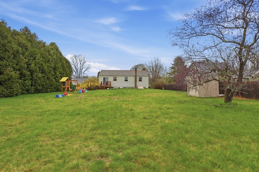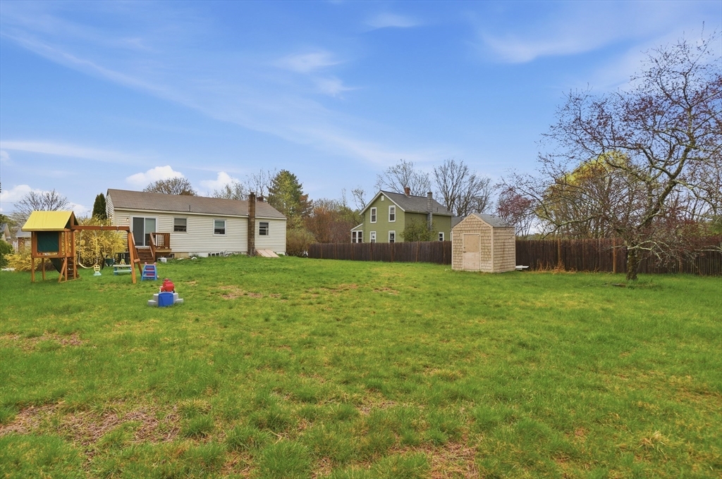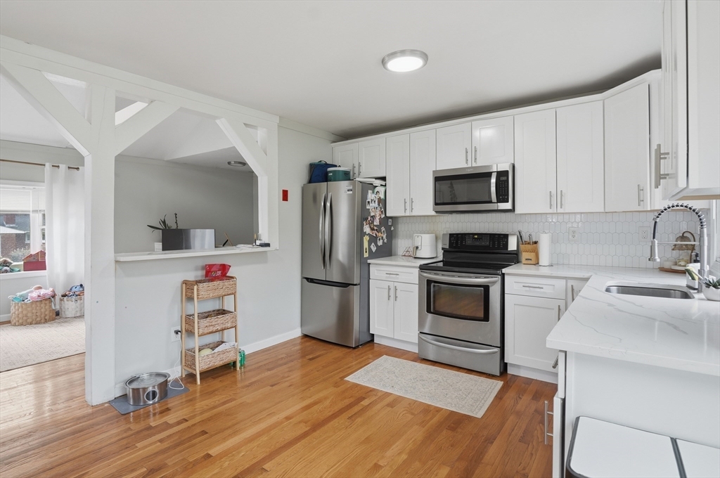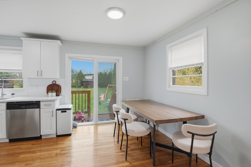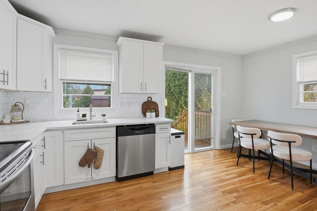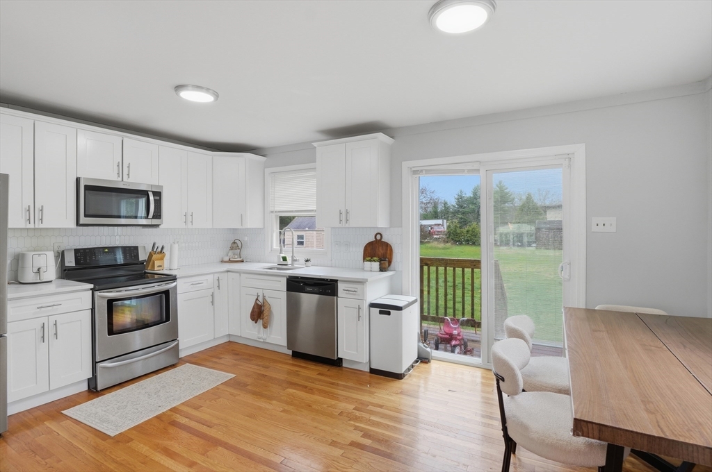 Perfectly situated on a dead-end street, this charming 3-bed, 1-bath split-entry blends comfort, style, and convenience—ideal for first-time buyers or down-sizers. The light-filled open layout features a welcoming living room with a bow window and soaring vaulted ceilings with exposed beams. The eat-in kitchen was updated just 2 years ago with white shaker cabinets, stainless steel appliances, quartz countertops, plus updated electrical and plumbing. A breakfast bar, tiled backsplash, and slider to the back deck enhance functionality and flow. Down the hall are three comfortable bedrooms with hardwood flooring and a full bath with tub and shower. Set on a spacious .37-acre lot, the level backyard offers endless possibilities for entertaining, relaxing, or creating your dream outdoor space. Enjoy the level yard and storage shed, all while being tucked away yet conveniently located near Routes 169 and 131.