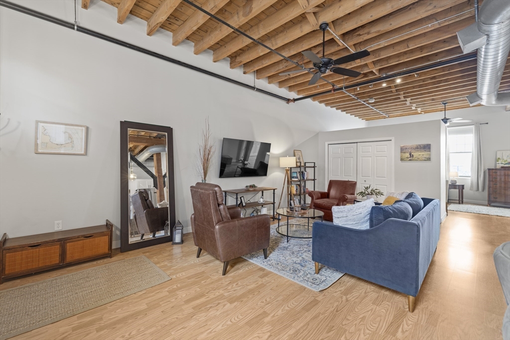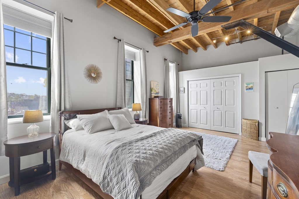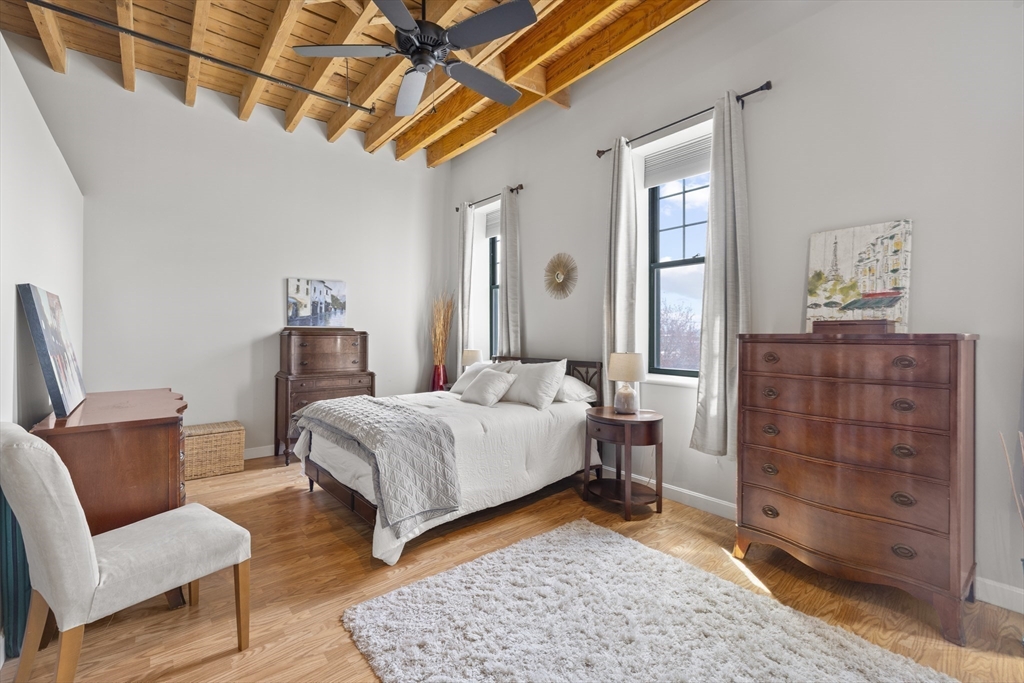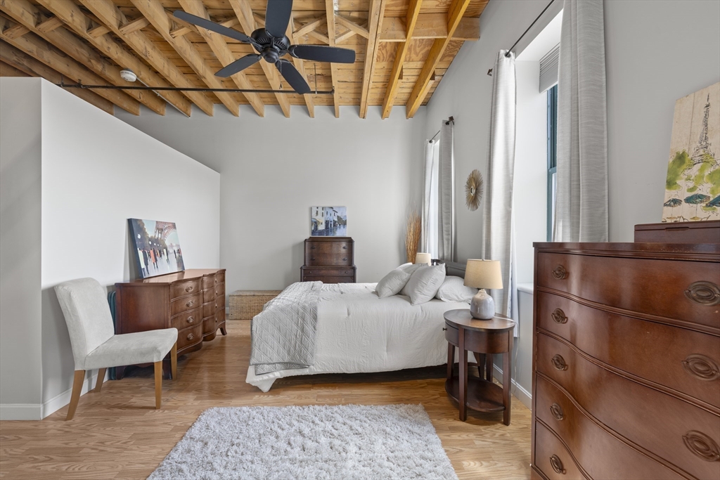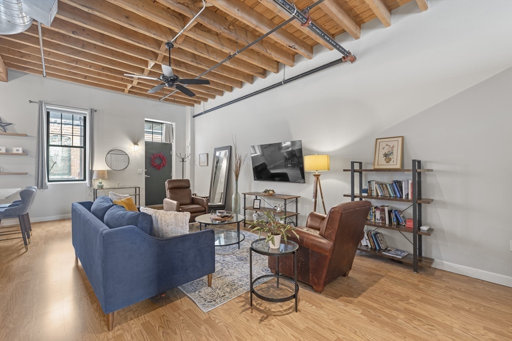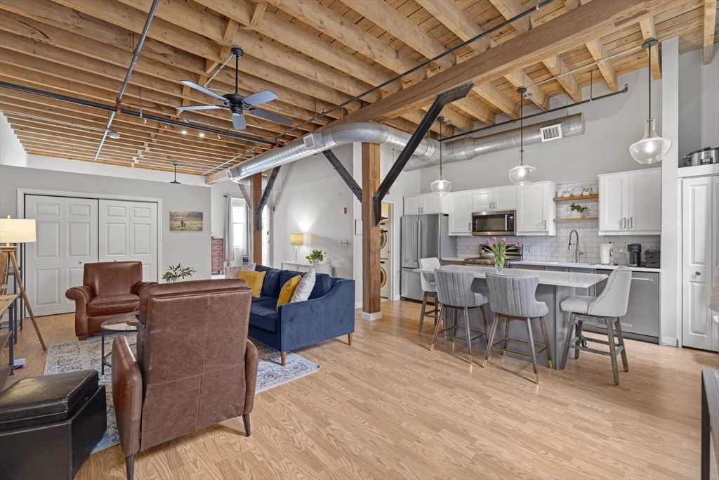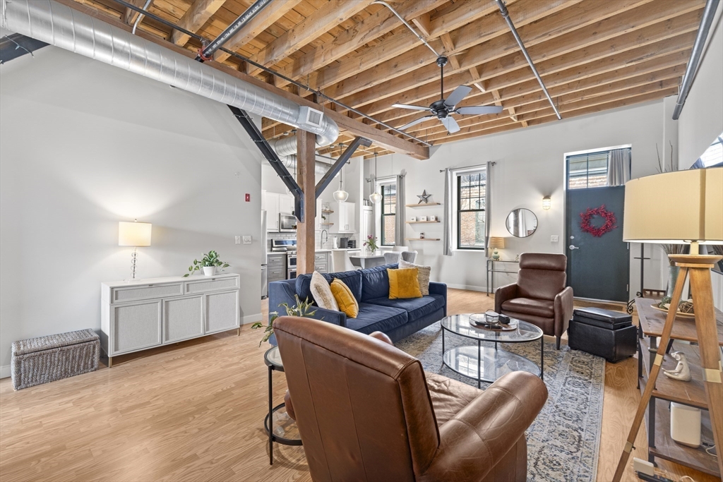 Authentic loft living meets modern style at Spencer Lofts. This second-floor walk-up is filled with character, featuring original milled oak trussed beams, soaring 12-foot ceilings, and an open, airy layout. The newly renovated kitchen stands out with quartz countertops, stainless steel appliances, a gas range, undermount sink, and island dining. A defined sleeping area with rare custom-made closets adds function and comfort. Building amenities include an exercise room and the Spencer Lofts Art Gallery. Easy access to the Silver Line, Commuter Rail, MBTA #111 bus, Logan Airport, the Ted Williams Tunnel, the Mass Pike, and Route 1. Surrounded by local favorites including Ciao, Newbridge Café, Chelsea Station, Starbucks, Market Basket, and CVS. One deeded off-street parking space included.