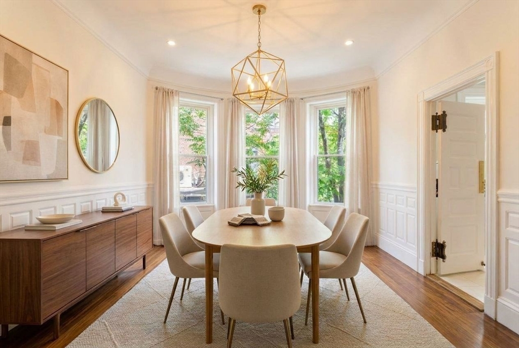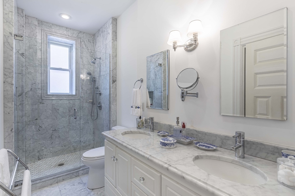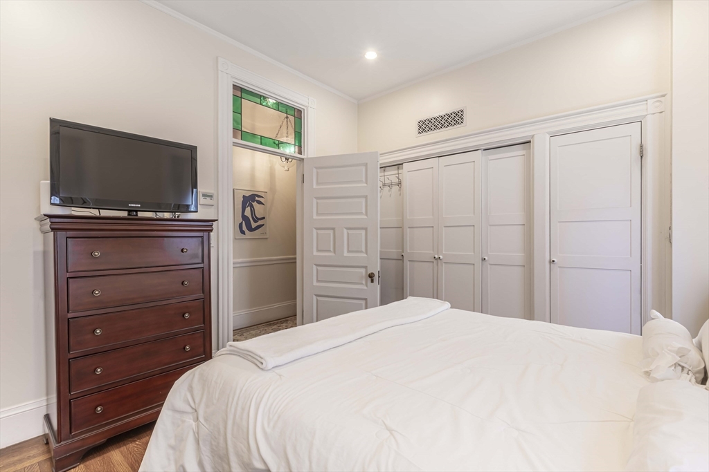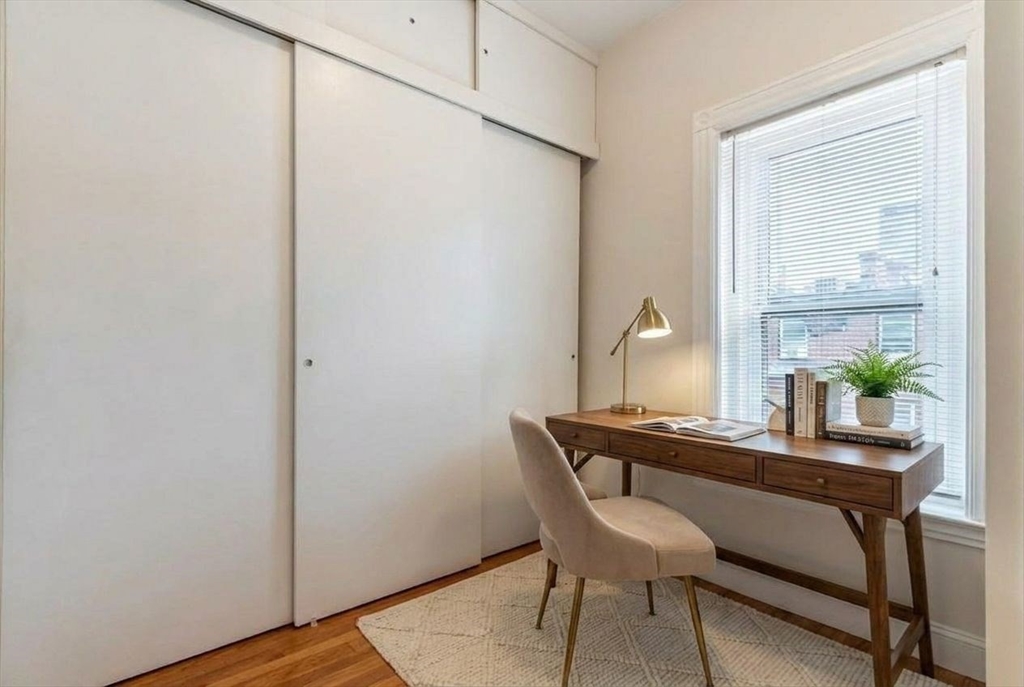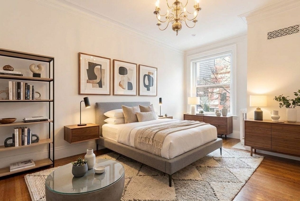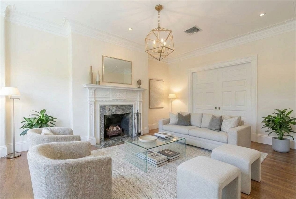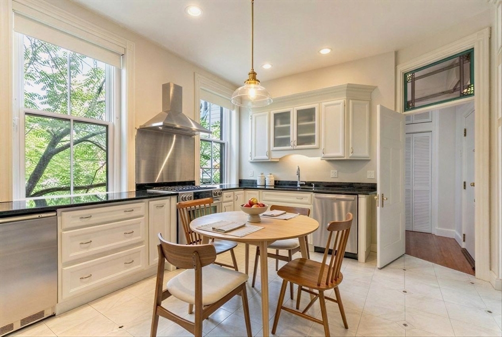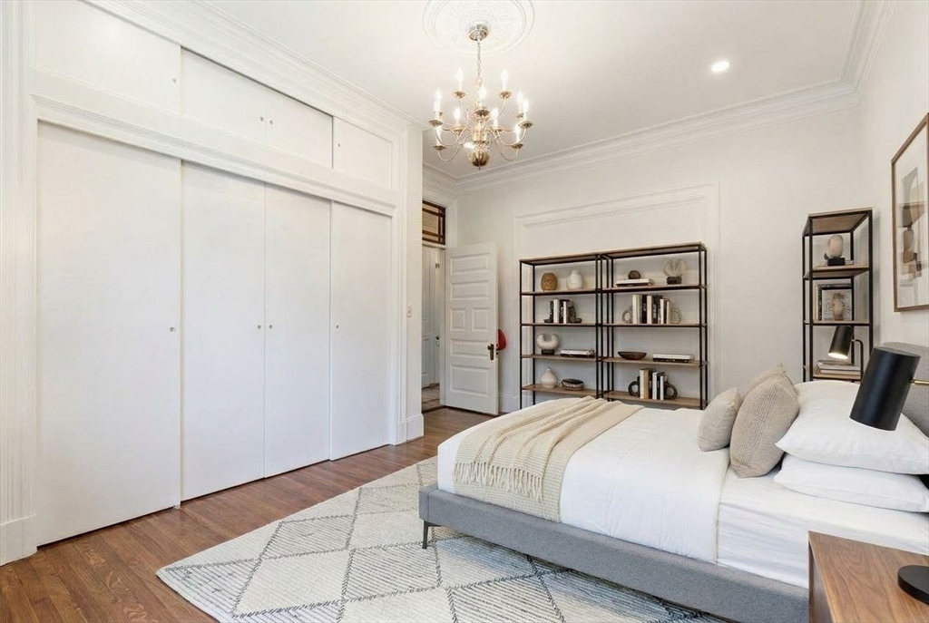 Commonwealth Ave Mall views • 3-bed floor-through with elevator. Sun-filled, 4th flr, 1,940 SF floor-through on a single level, with three exposures overlooking the tree-lined Commonwealth Avenue Mall. Rare Back Bay elevator building. Renovated 3-bedroom plus separate study/home office (ideal as guest room or flexible space), and two spa-like marble baths, one with a jetted tub. Grand living room with 10' ceilings, three floor-to-ceiling bow windows, fireplace with original mantle, crown moldings, and hardwood floors throughout. Eat-in kitchen with stainless steel appliances and gas cooking opens to a formal dining / family room with a second fireplace, wainscoting, and bar area. Central A/C, in-unit washer and dryer, private storage included. Set one block off Newbury Street and near the Public Garden, Copley Place, Prudential Center, Charles River Esplanade, Symphony Hall, and Green Line service at Hynes Convention Center and Copley. Rental parking nearby