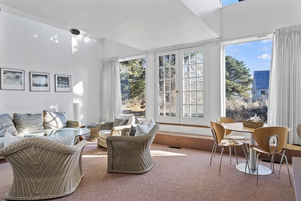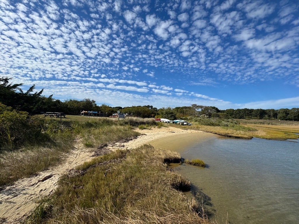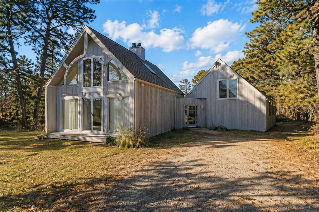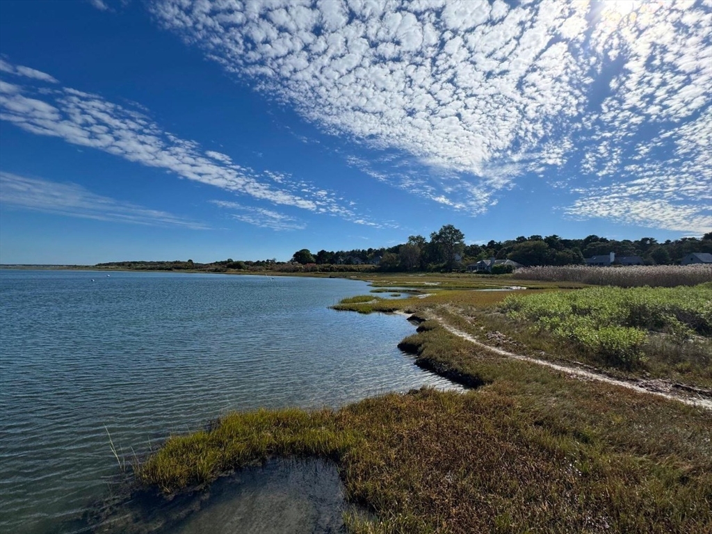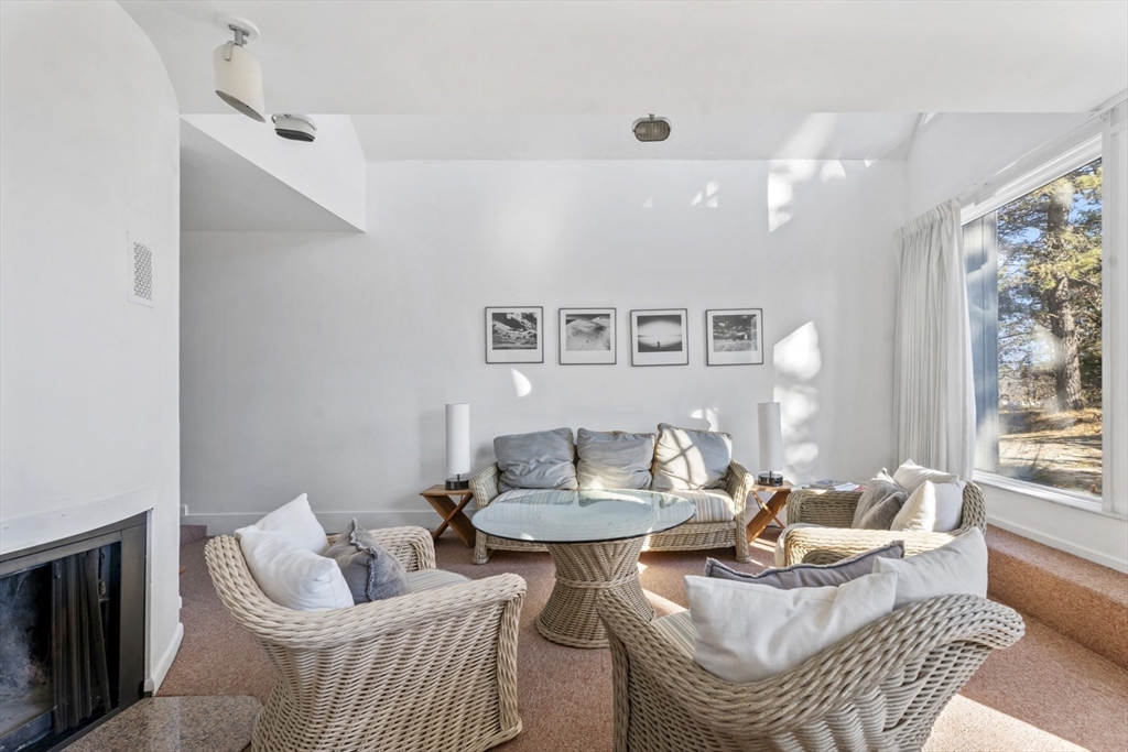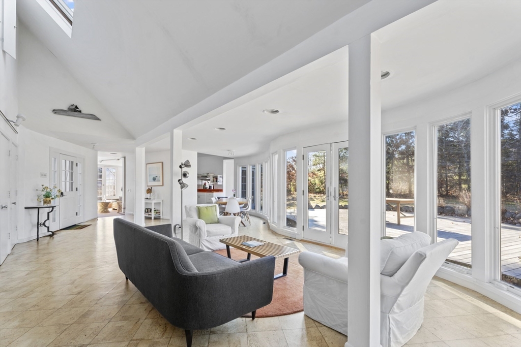 Quintessential Waterview Farm! Built as a year-round home with the charm of the original cottages, this well-loved retreat awaits its next chapter. The sunny, open floor plan offers two bedrooms and a full bath on each level, with generous gathering spaces throughout. A skylit kitchen is tucked into a corner of the main living area, where a curved wall of glass opens to a deck and private yard. The sunken living room features a fireplace and stairs to a loft seating area. Built in 1978, the home is fully winterized with oil forced-air heat and a partial basement. The south facing half-acre lot abuts an 8-acre forever-wild meadow. A nearby path leads across wildflower fields to the association beach. Set between Farm Neck and Felix Neck, Waterview Farm offers 22 acres of common land, a sandy beach, dock, boat storage, and possible mooring—ready to enjoy now and enhance over time.