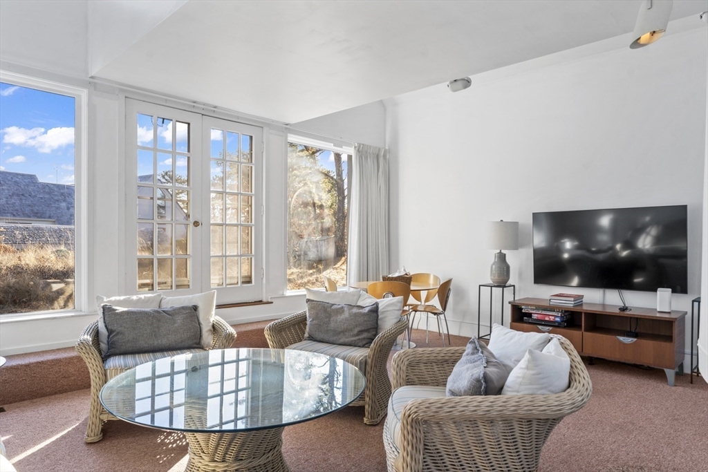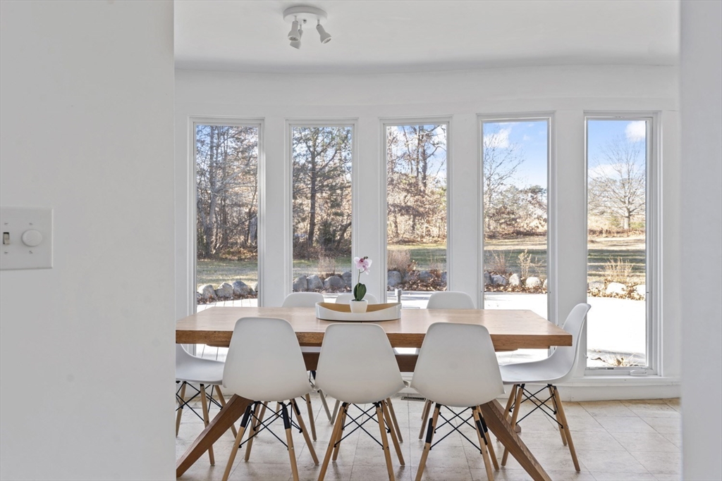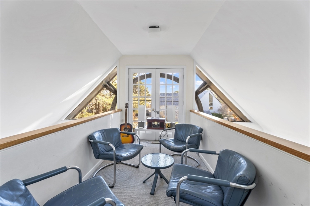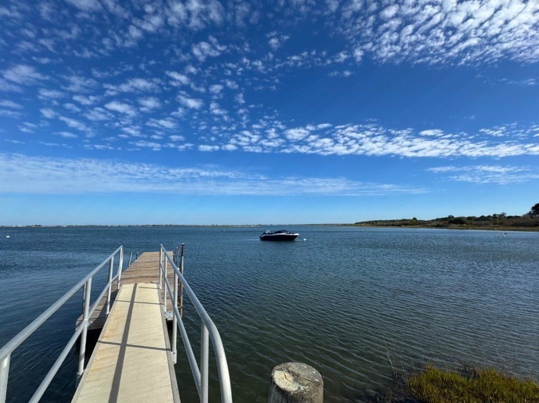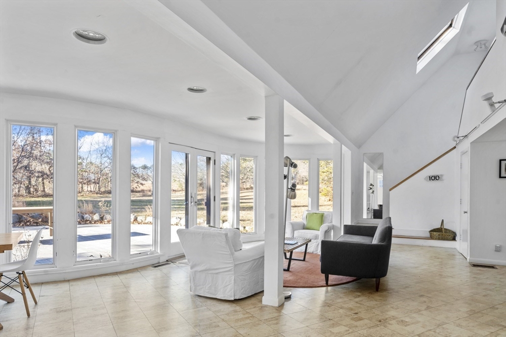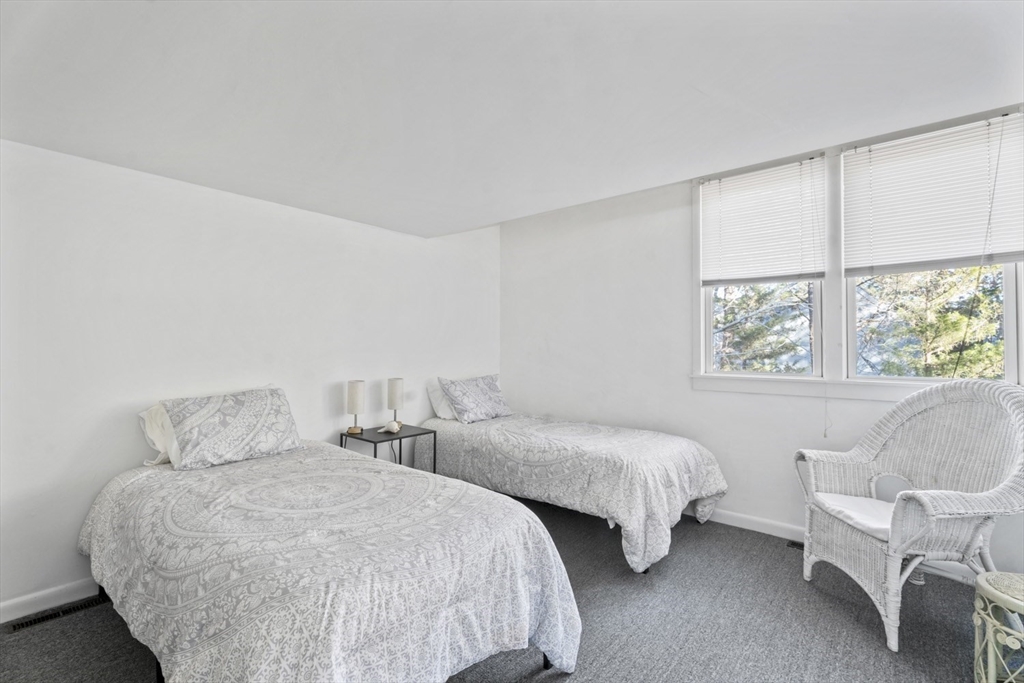 Quintessential Waterview Farm! Built as a year-round home with the charm of the original cottages, this well-loved retreat awaits its next chapter. The sunny, open floor plan offers two bedrooms and a full bath on each level, with generous gathering spaces throughout. A skylit kitchen is tucked into a corner of the main living area, where a curved wall of glass opens to a deck and private yard. The sunken living room features a fireplace and stairs to a loft seating area. Built in 1978, the home is fully winterized with oil forced-air heat and a partial basement. The south facing half-acre lot abuts an 8-acre forever-wild meadow. A nearby path leads across wildflower fields to the association beach. Set between Farm Neck and Felix Neck, Waterview Farm offers 22 acres of common land, a sandy beach, dock, boat storage, and possible mooring—ready to enjoy now and enhance over time.
