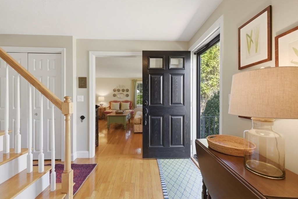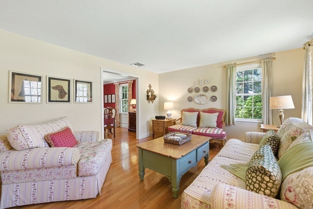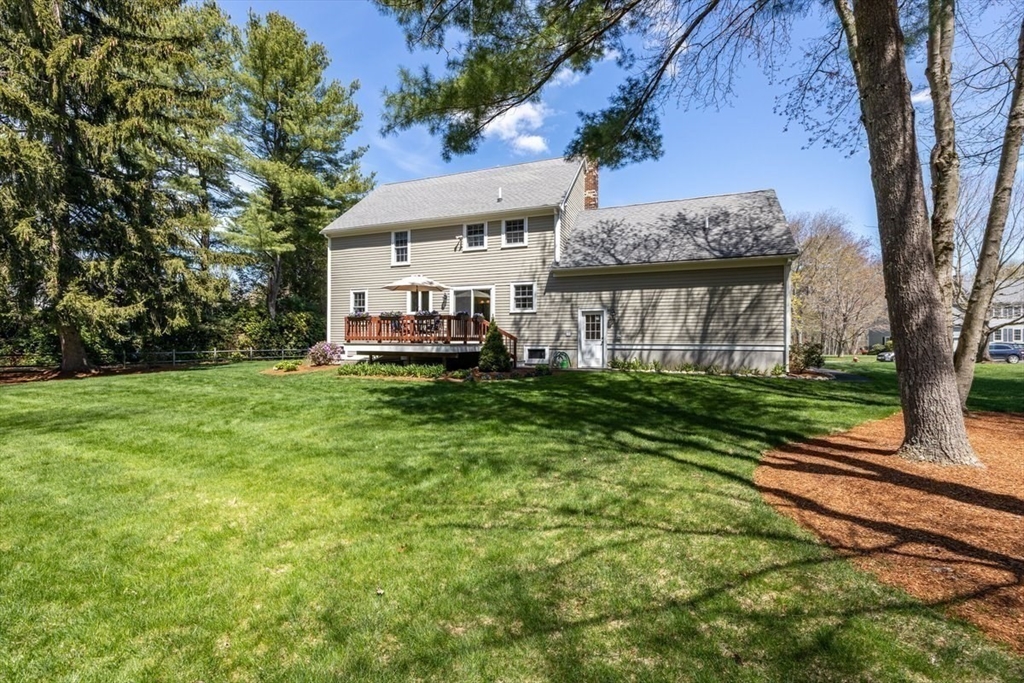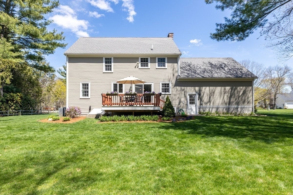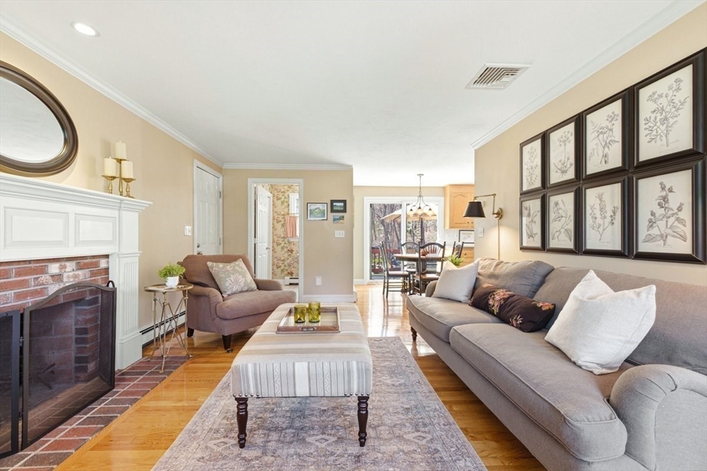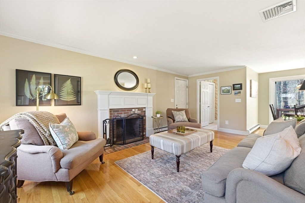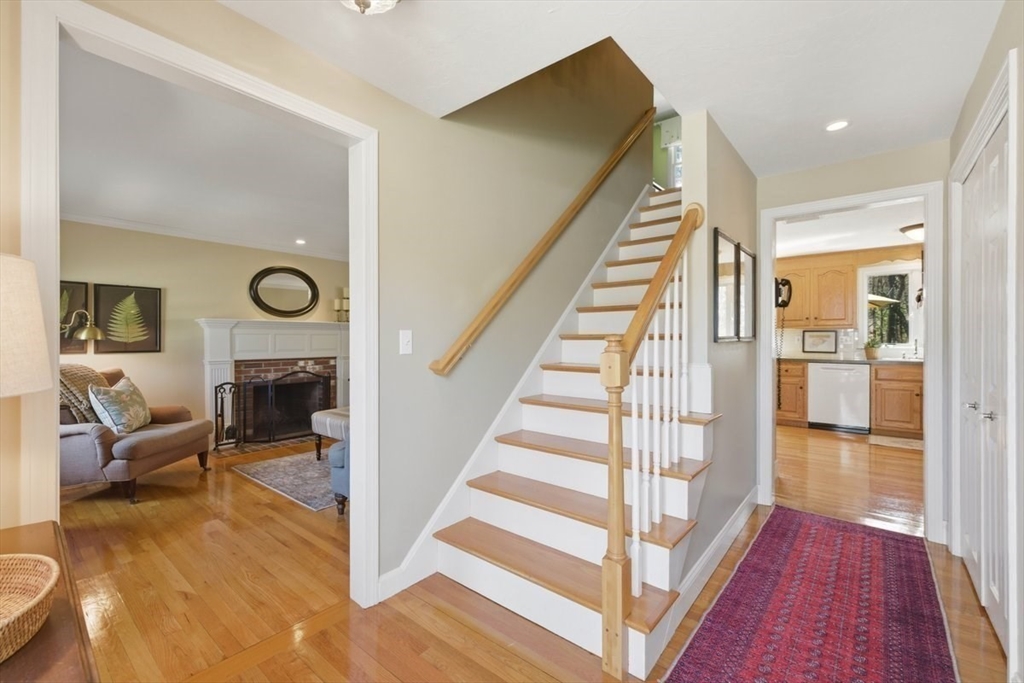 Immaculate 4 bed colonial situated on a cul-de-sac neighborhood in the desirable Old Post Road School district. This beautifully maintained home offers a well-designed and flexible floor plan. The main level includes a cozy living room, formal dining room, eat in kitchen, and a sun filled family room with wood burning fireplace. The second-floor features three generous bedrooms, a family bath, and a primary suite with updated bathroom, office area and an oversized walk-in closet with custom built in shelving. The finished, heated lower level provides additional living space, ideal for a playroom as well as music room or additional home office. Sliding doors from the kitchen open to a private and lush backyard with mature plantings and pond views, creating a peaceful setting for outdoor enjoyment and entertaining. Additional highlights include an attached two car garage, ample storage throughout, and convenient access to the train, shops and restaurants of Walpole Center.