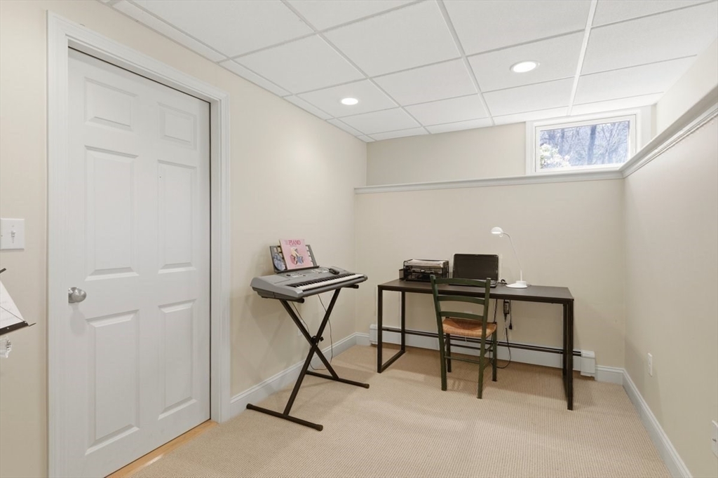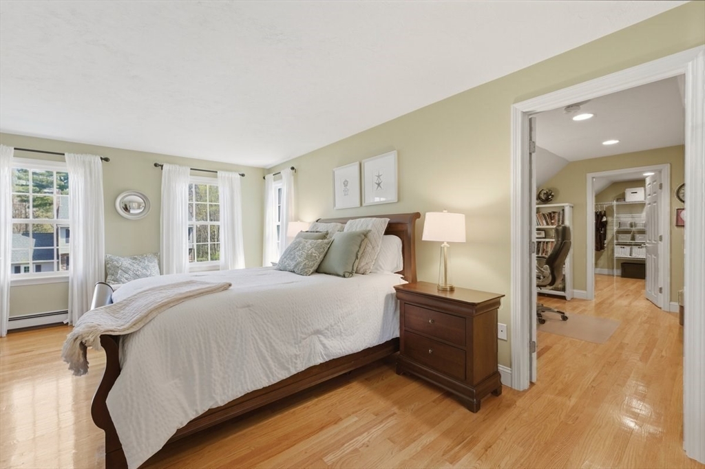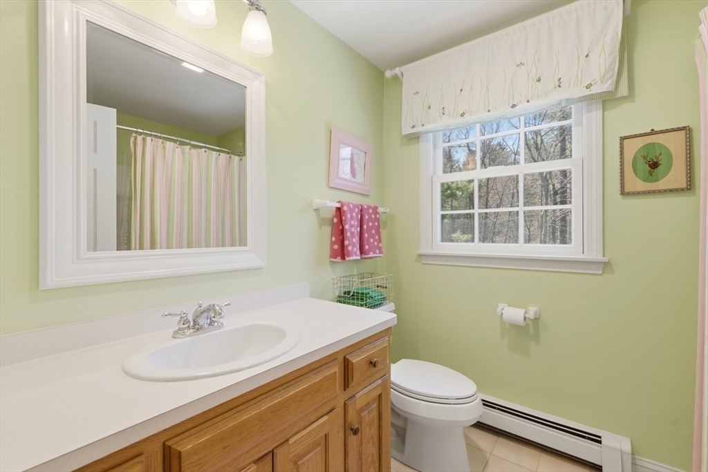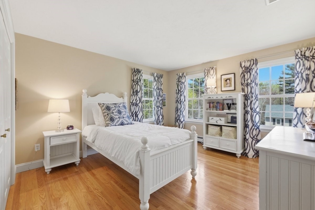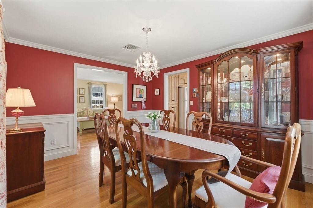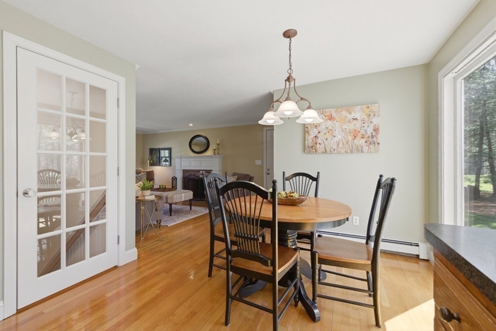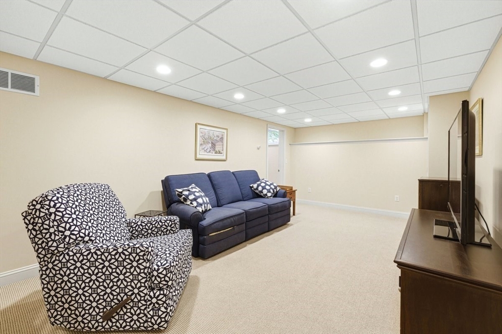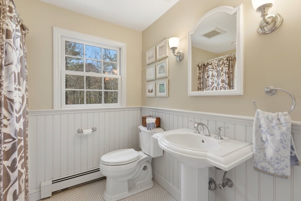 Immaculate 4 bed colonial situated on a cul-de-sac neighborhood in the desirable Old Post Road School district. This beautifully maintained home offers a well-designed and flexible floor plan. The main level includes a cozy living room, formal dining room, eat in kitchen, and a sun filled family room with wood burning fireplace. The second-floor features three generous bedrooms, a family bath, and a primary suite with updated bathroom, office area and an oversized walk-in closet with custom built in shelving. The finished, heated lower level provides additional living space, ideal for a playroom as well as music room or additional home office. Sliding doors from the kitchen open to a private and lush backyard with mature plantings and pond views, creating a peaceful setting for outdoor enjoyment and entertaining. Additional highlights include an attached two car garage, ample storage throughout, and convenient access to the train, shops and restaurants of Walpole Center.