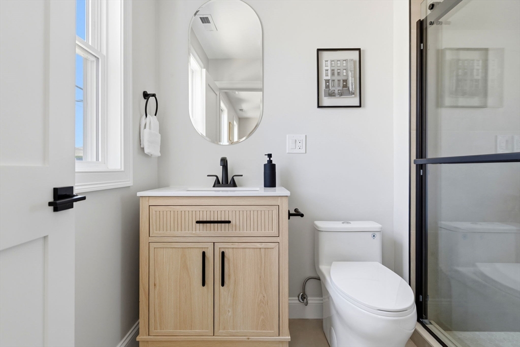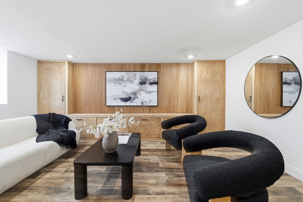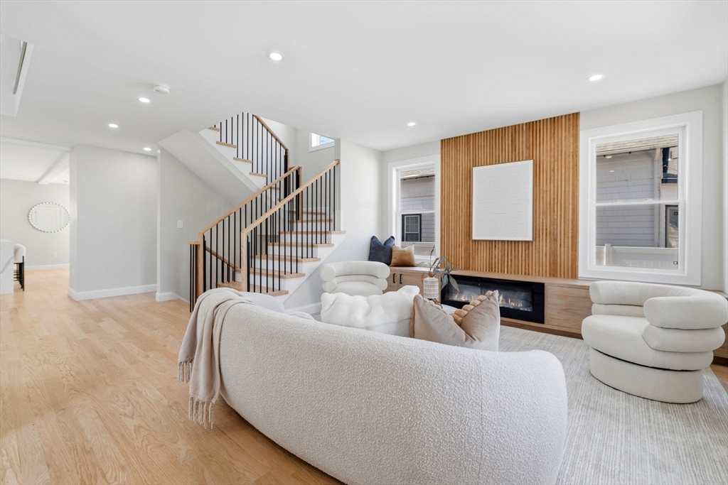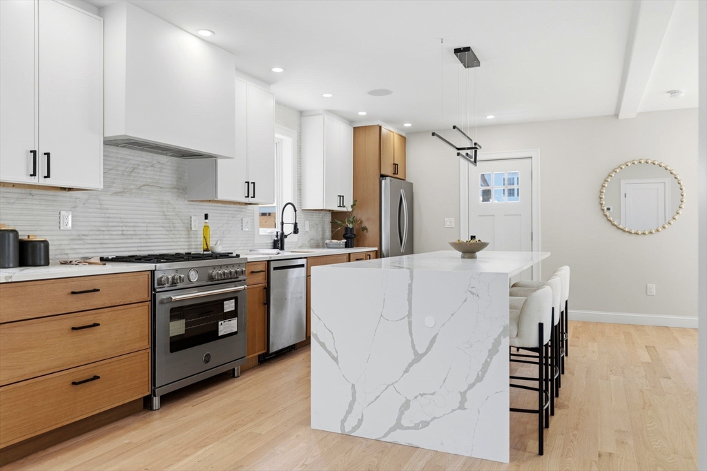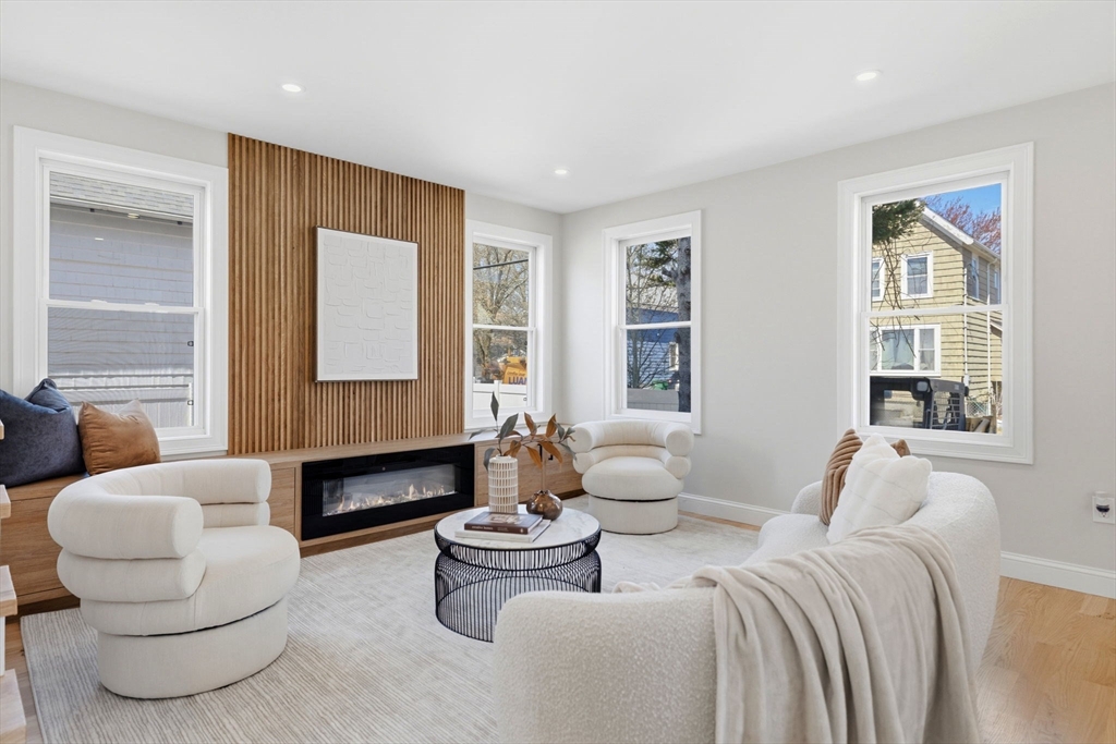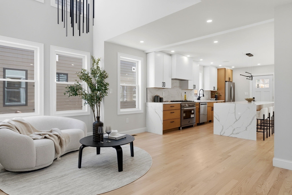 Fully renovated single-family home offering four levels of thoughtfully designed living. The main level opens into a bright living area anchored by a built-in media wall with storage, flowing into an open-concept kitchen with Calacatta quartz countertops, a waterfall island, two-tone cabinetry, & pendant lighting. White oak hardwood floors & recessed lighting run throughout, while a double-height seating area with a statement chandelier brings in natural light & creates a striking focal point. The second level includes a junior suite with a walk-in closet & ensuite bath, along with 2 additional bedrooms, a full bath, and a dedicated laundry room. The top floor offers a private primary suite with an office, walk-in closet, ensuite bath, & deck. The lower level features a family room with a dry bar & built-in bench. A private backyard, one garage spot, & off-street parking complete this home. Located with access to I-93, Route 28, Assembly Row, and Wellington Station for easy commuting.