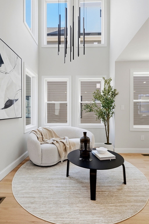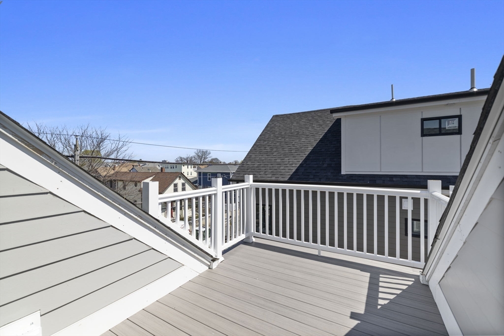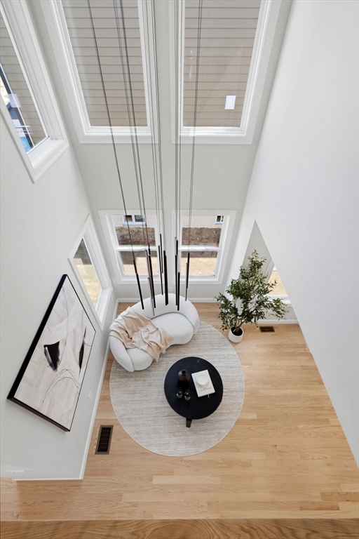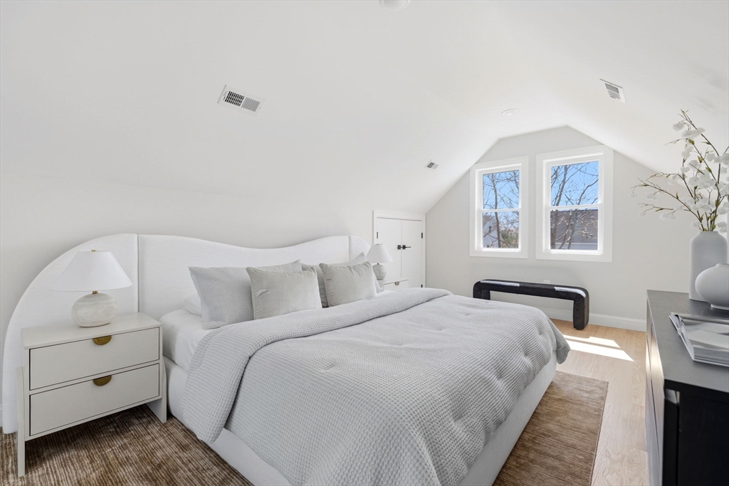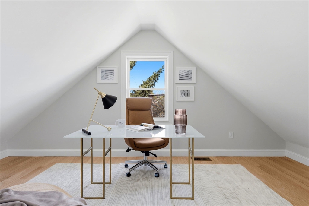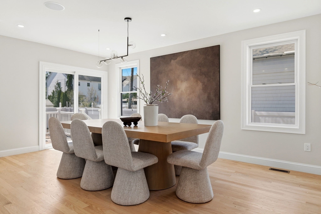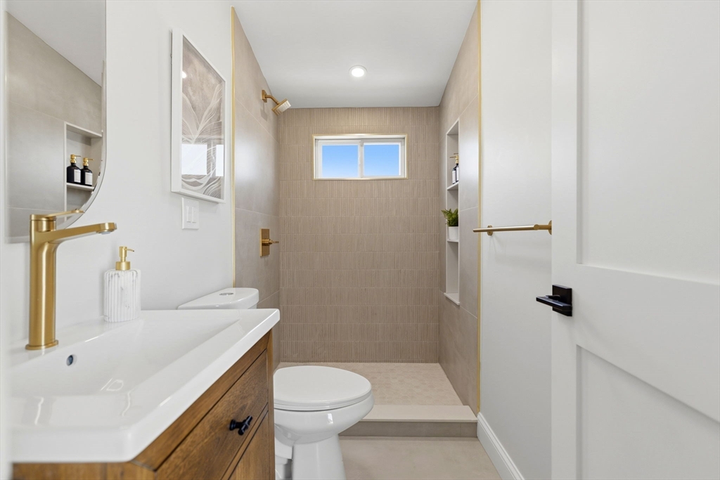 Fully renovated single-family home offering four levels of thoughtfully designed living. The main level opens into a bright living area anchored by a built-in media wall with storage, flowing into an open-concept kitchen with Calacatta quartz countertops, a waterfall island, two-tone cabinetry, & pendant lighting. White oak hardwood floors & recessed lighting run throughout, while a double-height seating area with a statement chandelier brings in natural light & creates a striking focal point. The second level includes a junior suite with a walk-in closet & ensuite bath, along with 2 additional bedrooms, a full bath, and a dedicated laundry room. The top floor offers a private primary suite with an office, walk-in closet, ensuite bath, & deck. The lower level features a family room with a dry bar & built-in bench. A private backyard, one garage spot, & off-street parking complete this home. Located with access to I-93, Route 28, Assembly Row, and Wellington Station for easy commuting.