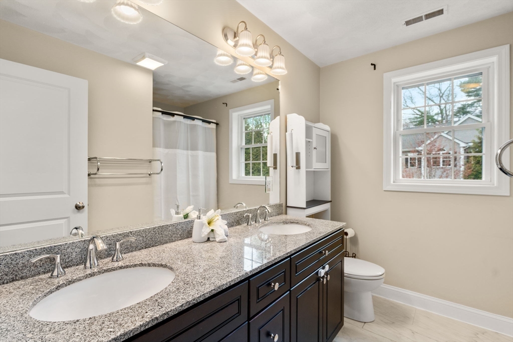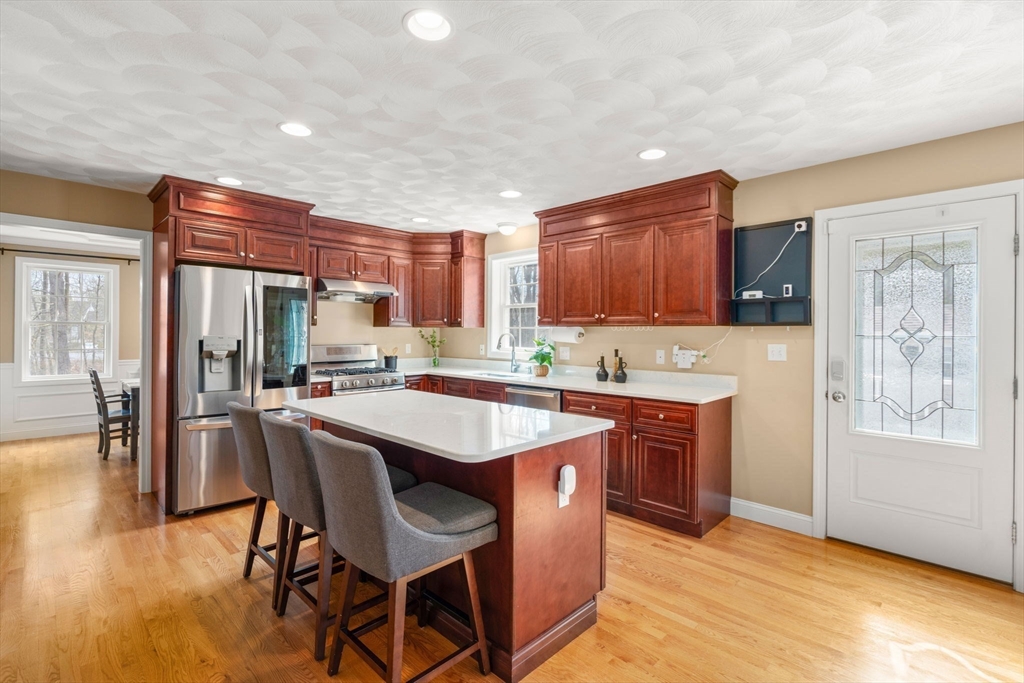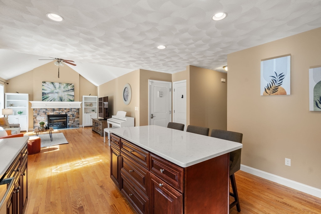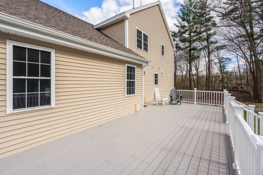 This well-maintained home offers a functional layout and comfortable living. The main level features a kitchen with stainless steel appliances, stone countertops, a spacious island, opening to a family room with a vaulted ceiling, creating a bright and open gathering space. The kitchen and/or family room provides access to a generously sized deck, extending the living area outdoors. Additional first-floor rooms include a living room or home office and a formal dining room, offering flexibility for a variety of uses. The second floor offers four bedrooms, including a primary bedroom with a full bathroom, along with three additional bedrooms and the second full bathroom. A large unfinished basement provides excellent storage and potential. Conveniently located with easy access to I-93 and I-95, this home supports both commuting and everyday convenience.