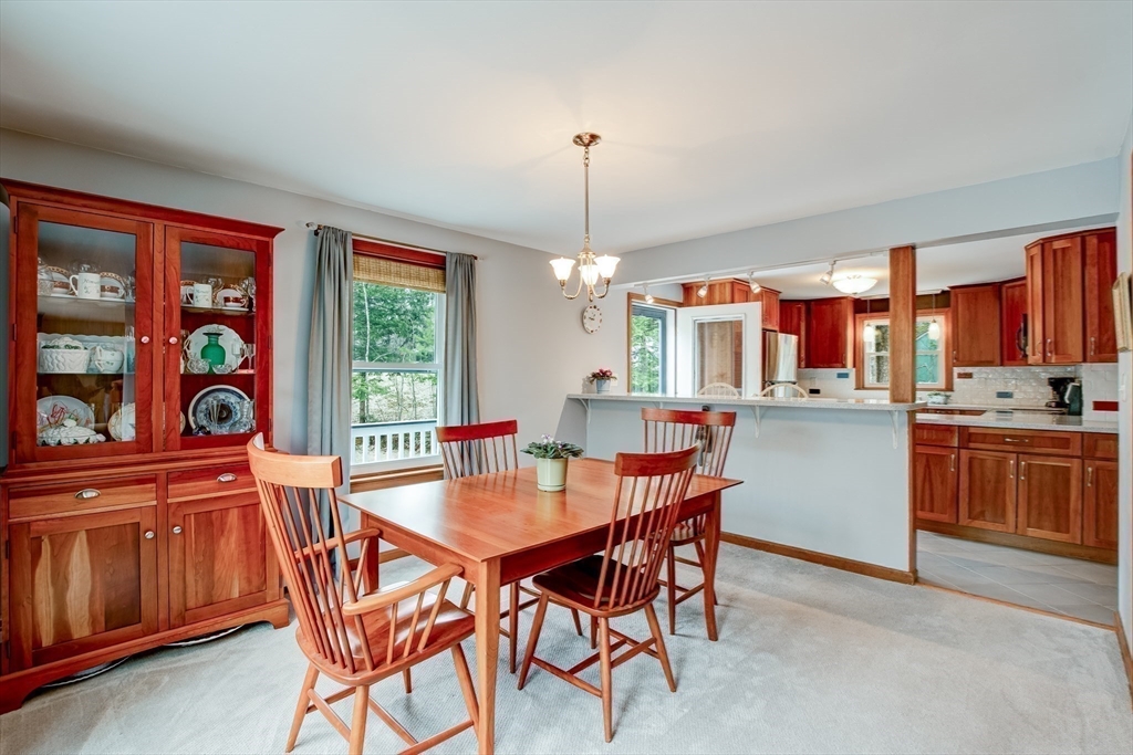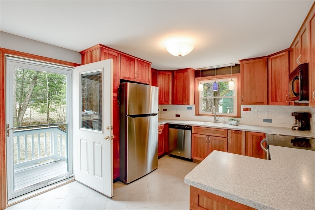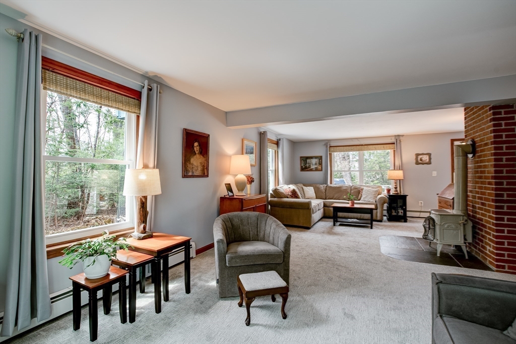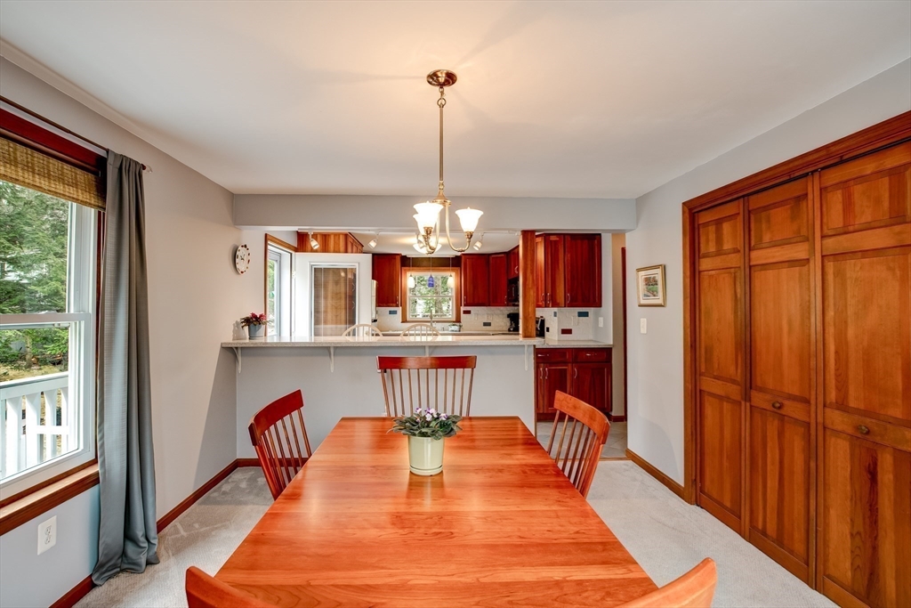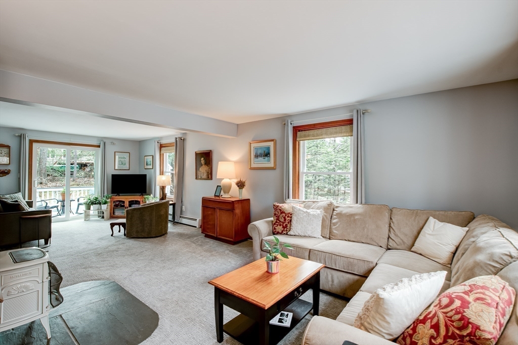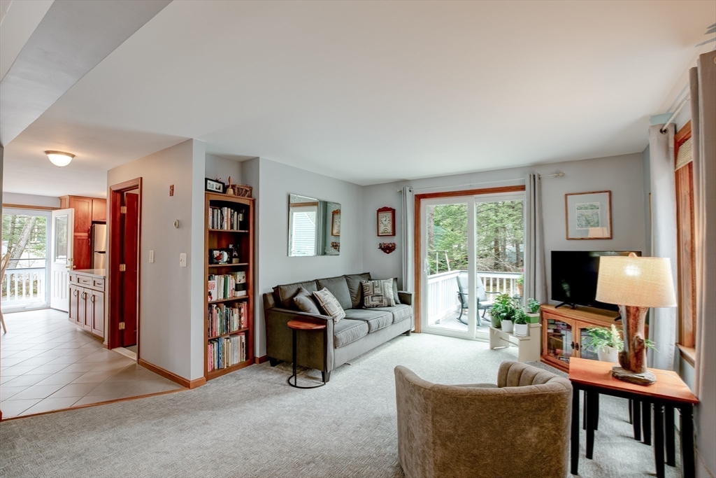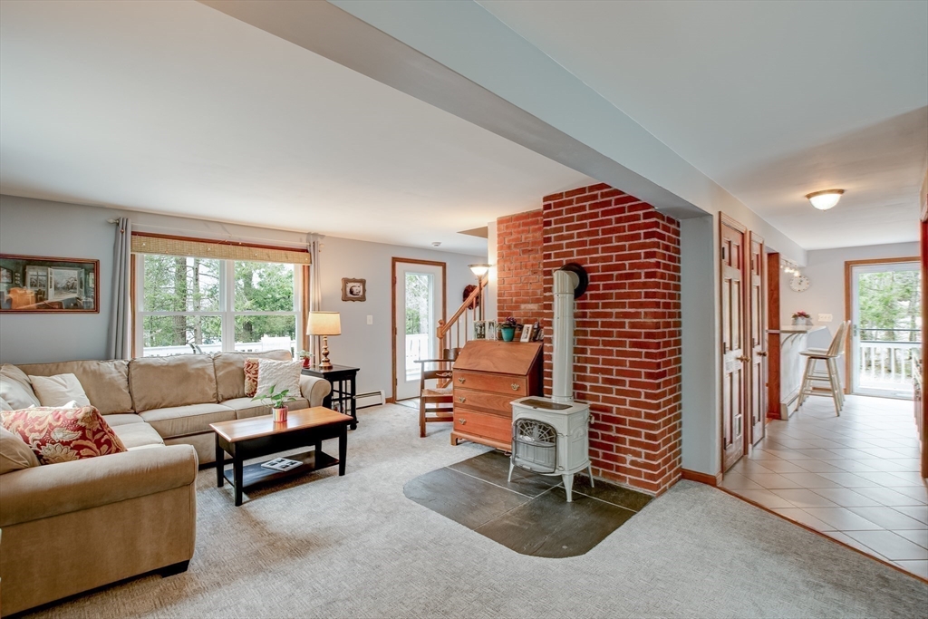Paradise in the Sunset Lake area with water access just across the street and stunning sunsets! Located in the desirable Far Hills community, this 3-bedroom, 2 full bath Saltbox offers privacy and tranquility. Features include a 30x12 wraparound deck plus a 5x7 deck off the front-to-back primary bedroom. Spacious front-to-back living room with wood stove and rear deck access—ideal for entertaining. Dining room with countertop bar opens to kitchen with cherry cabinets, solid surface counters, tile backsplash, and ceramic tile flooring. Skylit bedroom adds natural light and charm. Recent updates: roof, oil tank, and storm doors (2025), plus 2-year-old electric panel with generator hookup. Set on nearly ½ acre with access to boating, kayaking, swimming, fishing, and more. Year-round living or getaway, minutes to beach, boat ramps, playground, and clubhouse.