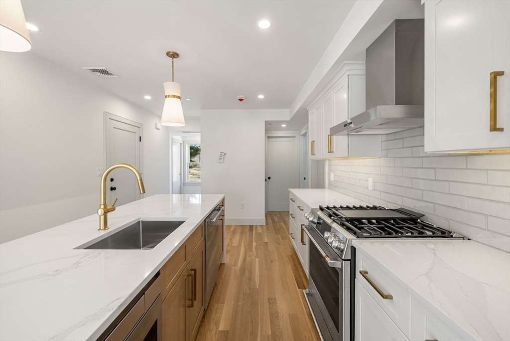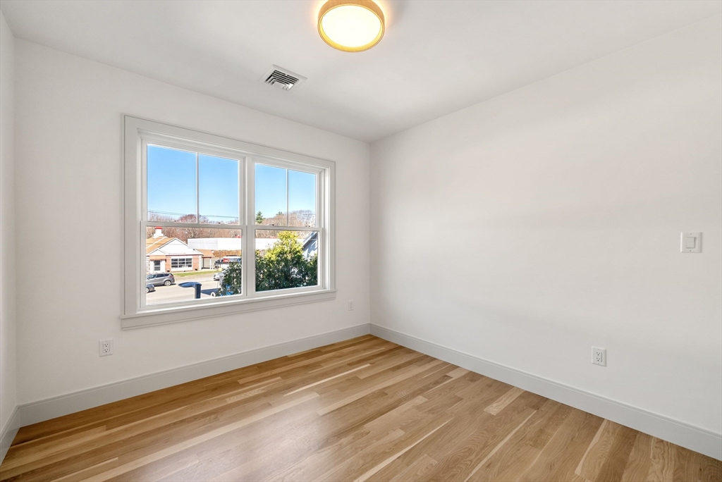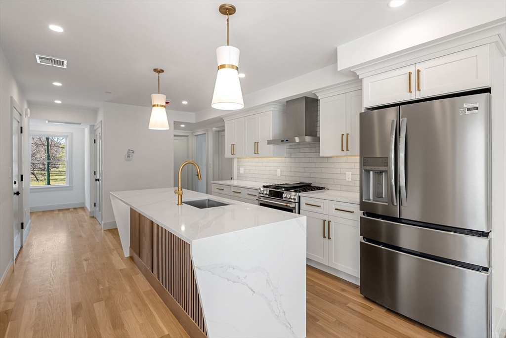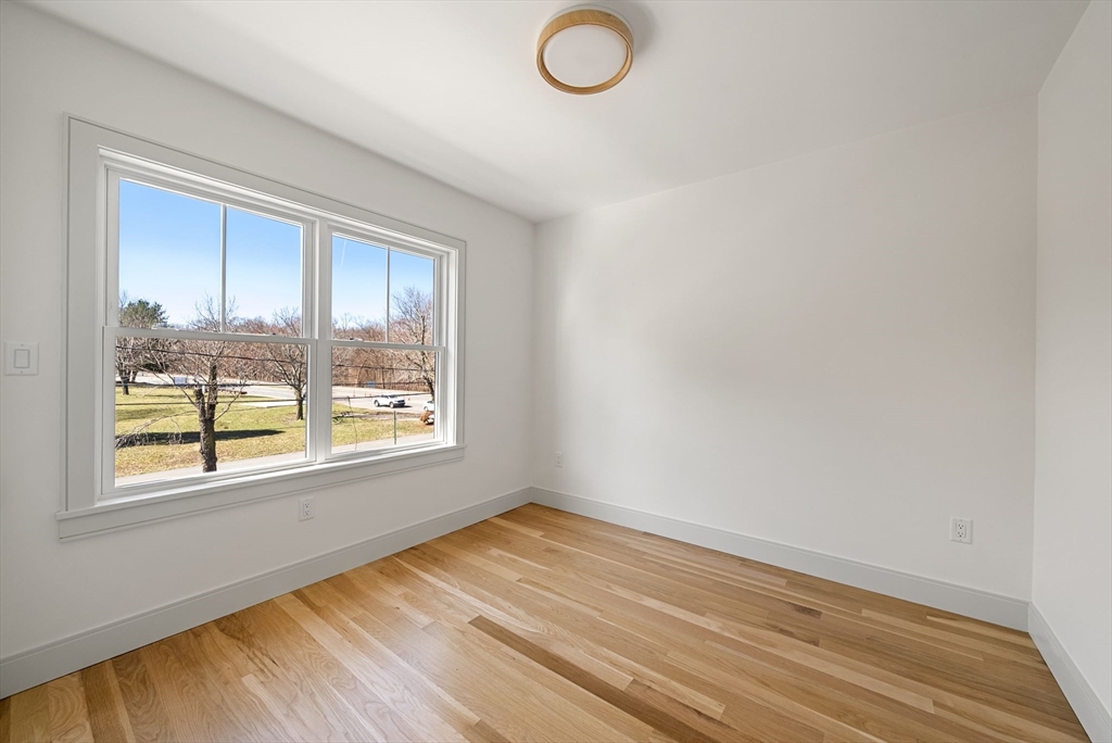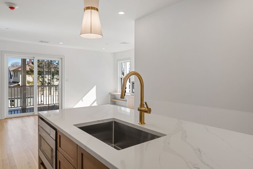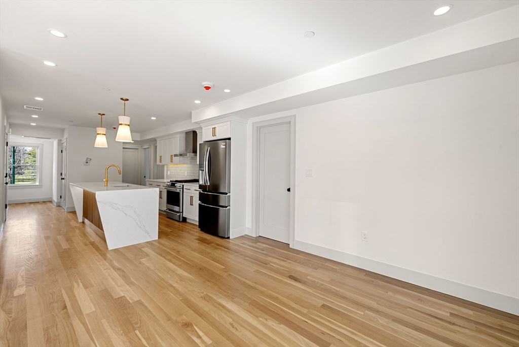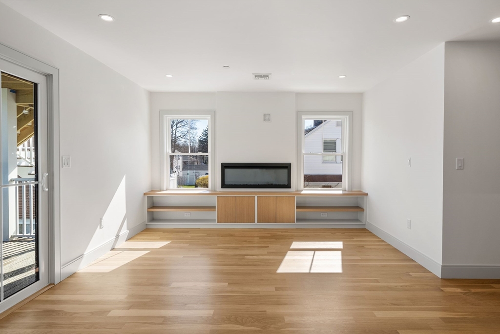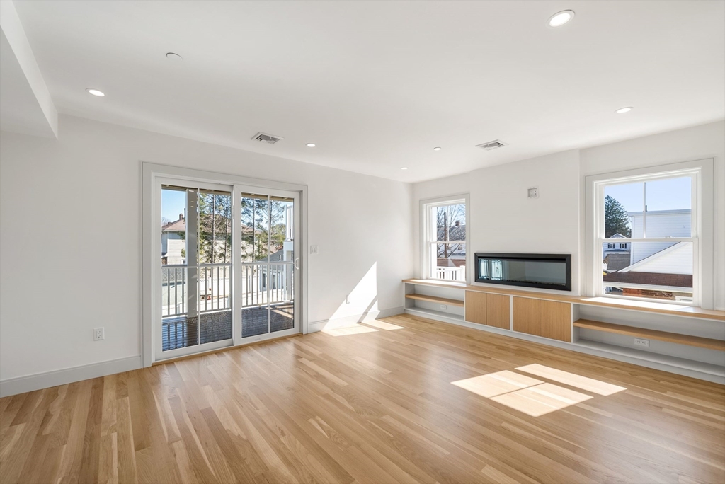 Perfectly positioned across from Spot Pond, this newly constructed 3-bedroom, 2-bath luxury residence offers a refined blend of elevated design and natural beauty. This direct-entry first-floor home is thoughtfully crafted with custom finishes throughout, showcasing white oak flooring, bespoke cabinetry, and elegant quartz surfaces in both the kitchen and baths. The open-concept layout is designed for modern living and effortless entertaining, highlighted by stunning custom-designed living room built-ins anchored by a sleek, modern fireplace. A private ~200 sq ft deck extends the living space outdoors, while select rooms capture partial pond views, bringing a serene backdrop indoors. Ideally located just moments from the trails of Middlesex Fells Reservation and Stone Zoo, with convenient access to Interstate 93, this residence offers an exceptional lifestyle of both tranquility and connectivity complete with two off-street parking spaces and dedicated storage.