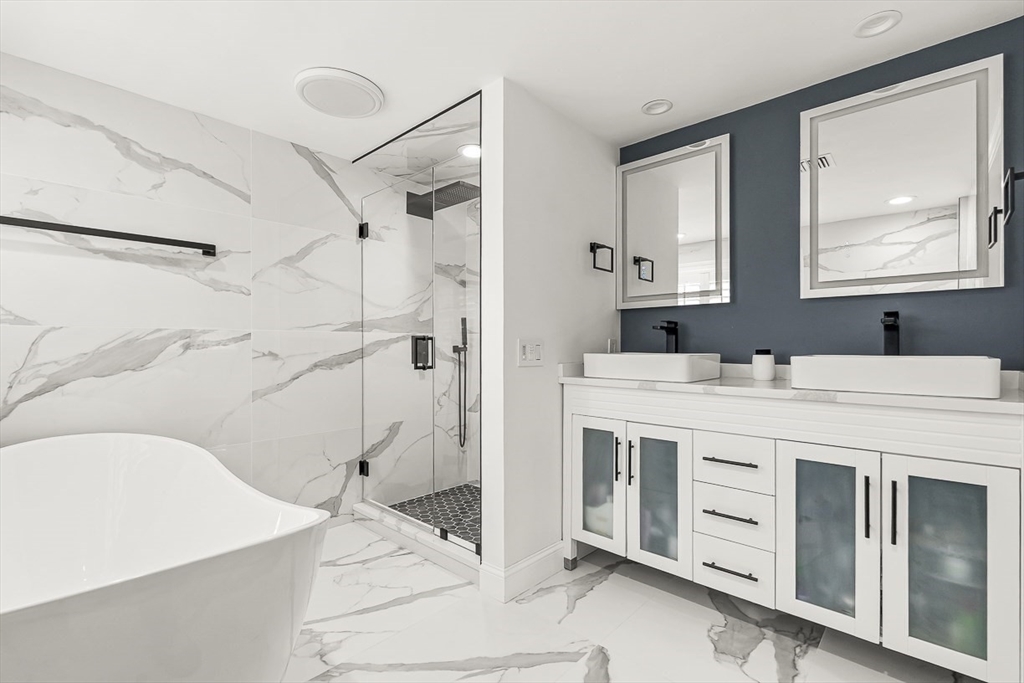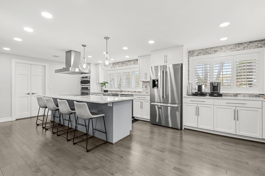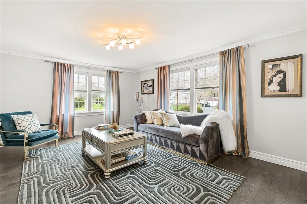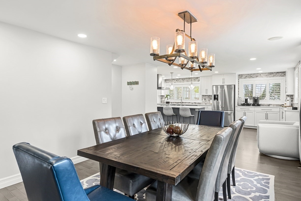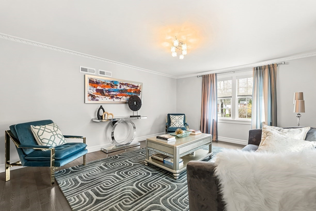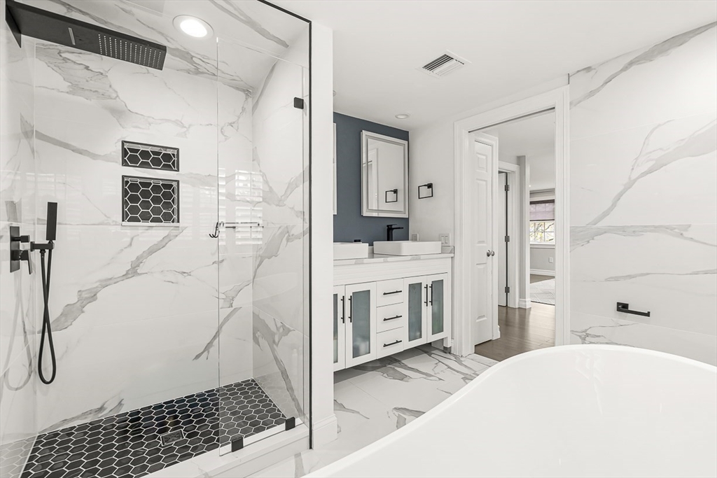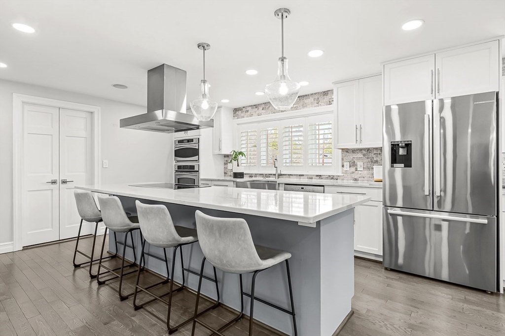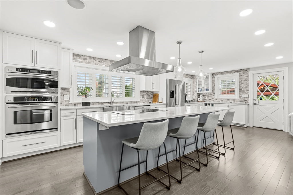 This beautifully updated and stylish colonial, set in a prime Lexington neighborhood, masterfully combines sophisticated living spaces with exceptional outdoor living. The open-concept main level flows seamlessly into a dramatic living room with soaring cathedral ceiling, fireplace, and abundant natural light from oversized windows. The gourmet kitchen features a large center island, premium appliances, and generous cabinetry, while opening to both the dining area and the outdoors. The highlight is the expansive composite deck with covered pavilions — ideal for year-round entertaining, al fresco dining, summer movie nights, and tranquil evenings in the private, maturely landscaped backyard. Upstairs, the luxurious primary suite offers a serene retreat with ample closets and a spa-like bathroom featuring a frameless glass shower and freestanding soaking tub. Finished lower level adds versatility with a large rec room, gym, and half bath. Style, space & function! Ready for Quick Close!