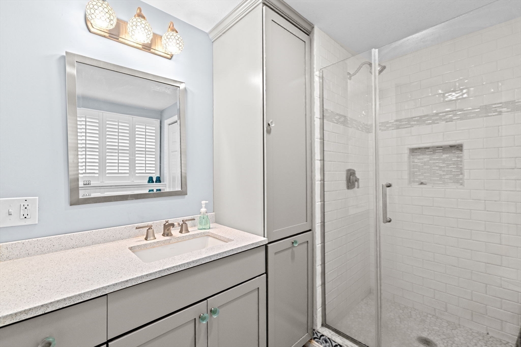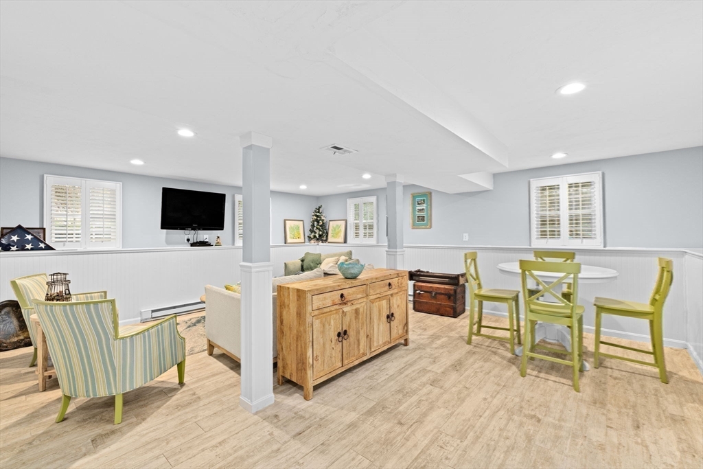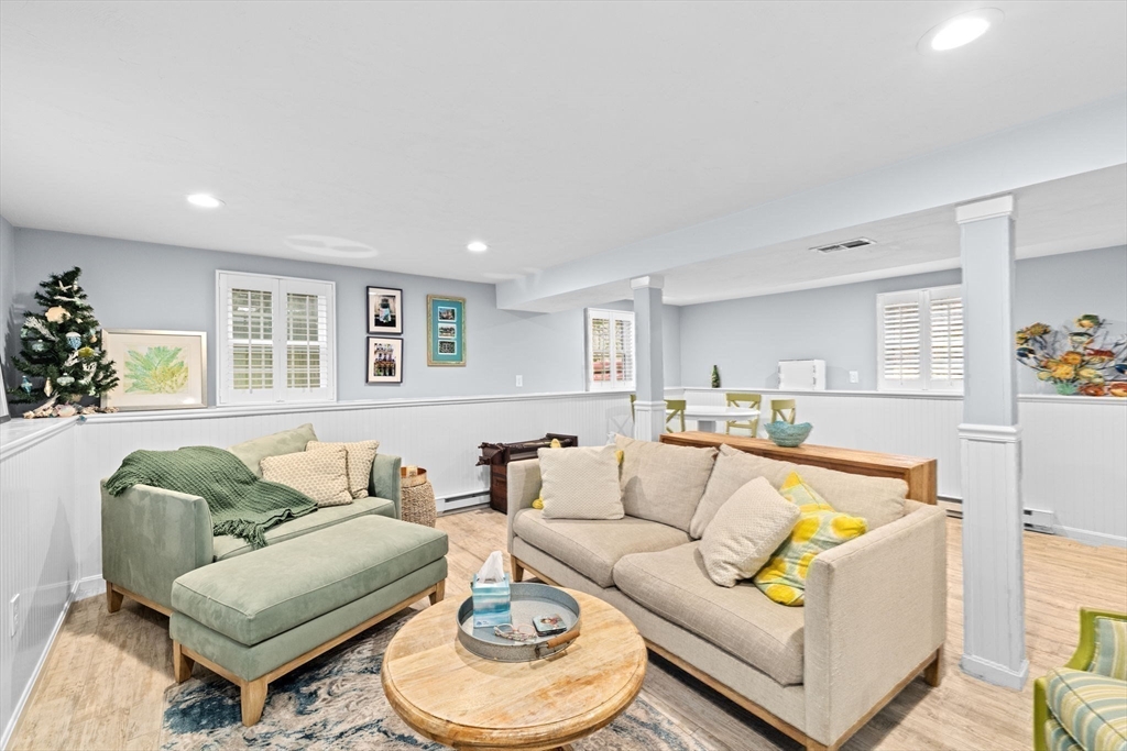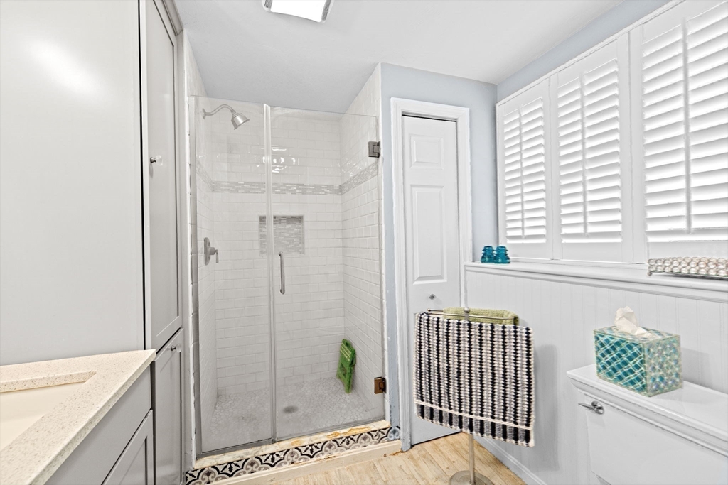 Lovingly cared for& thoughtfully upgraded, South Plymouth neighborhood home offers a perfect blend of comfort & style. The kitchen features upgraded cabinetry, quartz counters, tile backsplash, tile flooring, and stainless steel appliances. Hardwood flooring on most of the main level. The living room provides an inviting space with a wood-burning fireplace and an elegant tile surround. Three spacious bedrooms and an upgraded full bath complete the main level. Fully finished lower level adds exceptional living space with tile flooring, walk-in tile shower, and a convenient washer/dryer area, offering flexibility for guests or additional living needs. Additional highlights include a portable generator, vinyl siding, an oversized composite deck with vinyl railings, a flat backyard, a shed w/lofts for extra storage & abuts conservation land.. A new septic system will be installed by the seller. Location offers nearby Fresh Pond/park & Tidmarsh Wildlife Sanctuary