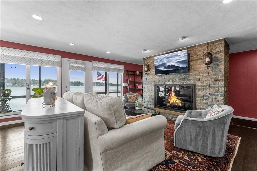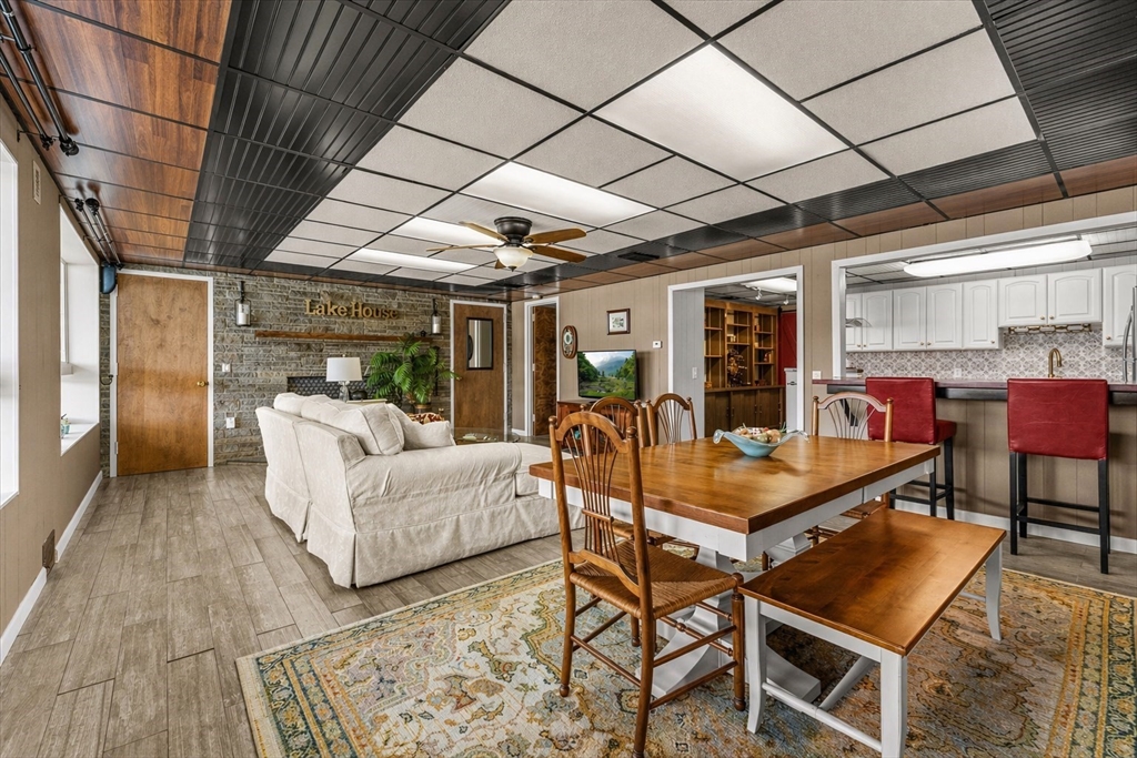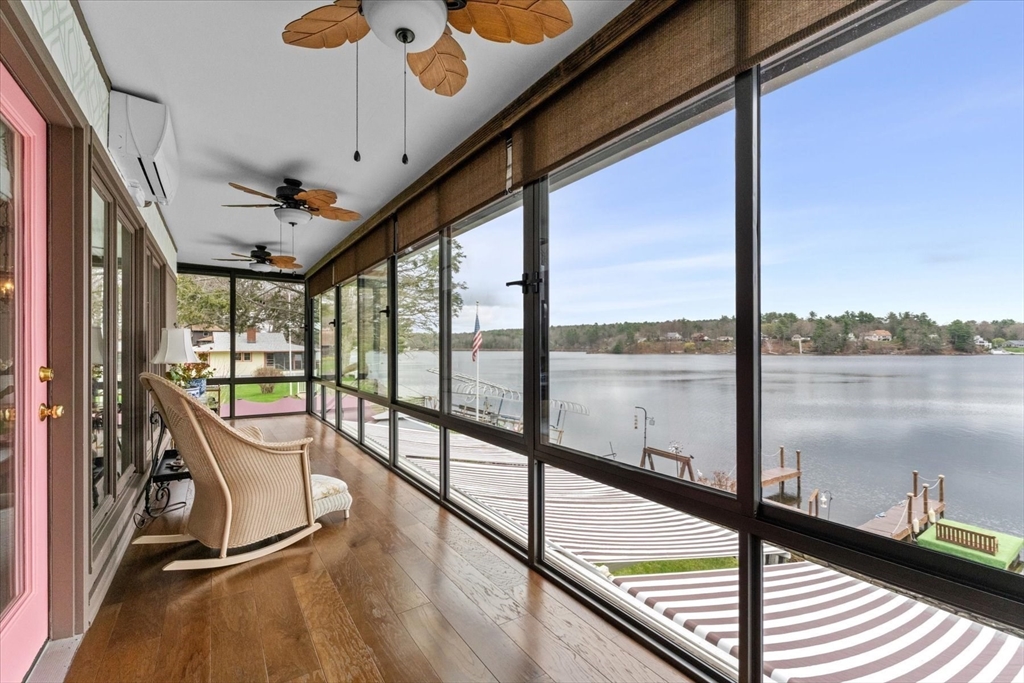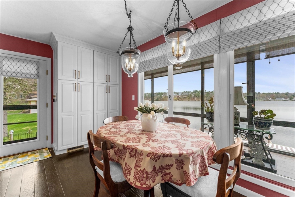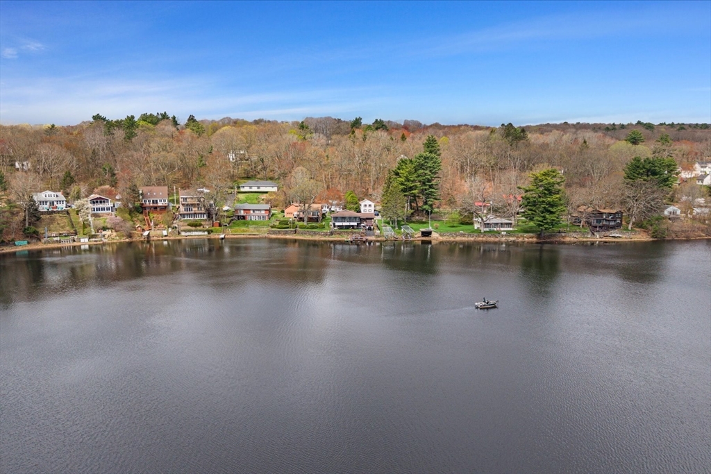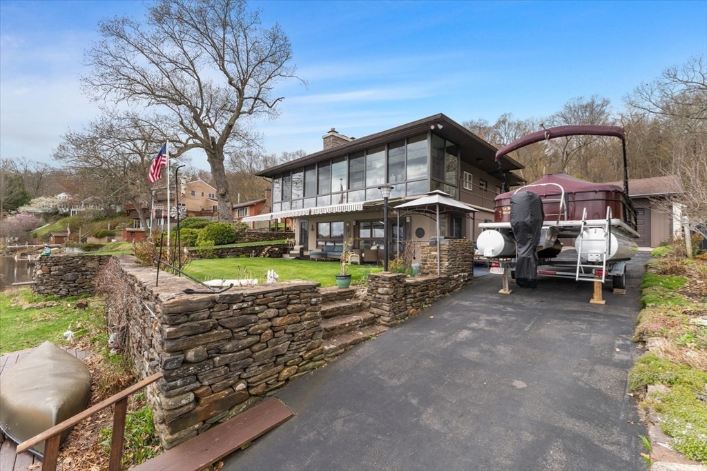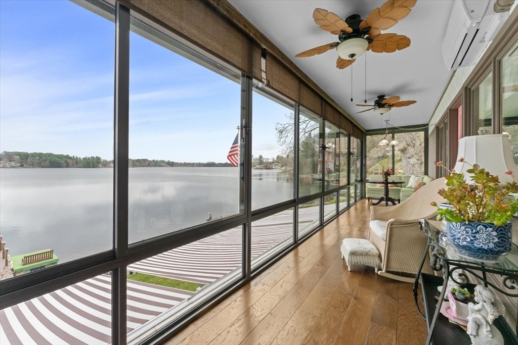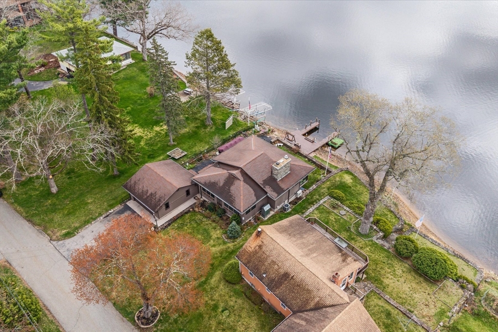 Unique opportunity to own a lakefront retreat on Lake Wickaboag. This residence offers direct water access, multiple docks and private boat ramp for effortless lakeside living. The main level welcomes you w/ lake views and rich wood flooring. An open-concept layout showcases an updated kitchen w/ s/s appliances, granite countertops, and a center island, flowing into the dining/living areas. A climate-controlled sunroom w/ expansive windows captures panoramic water views. Two spacious beds and a remodeled bath complete this level. The walkout LL offers versatility w/ a second kitchen featuring s/s appliances and a breakfast bar. The open living/dining area is enhanced by tile flooring and a wood stove. This level also includes an add’l bed, a renovated bath and laundry. Set on a thoughtfully designed lot featuring a patio w/ awning and a detached garage w/ dual-sided access for convenient use of the boat ramp. This property is an exceptional setting for relaxing and entertaining.