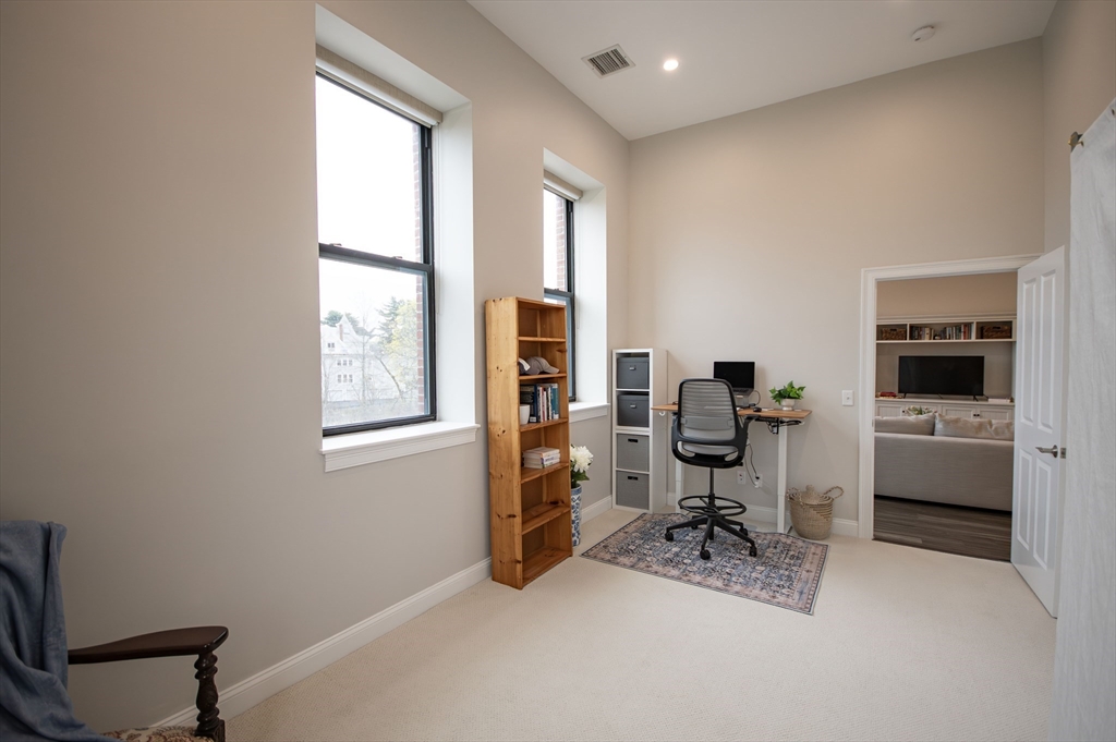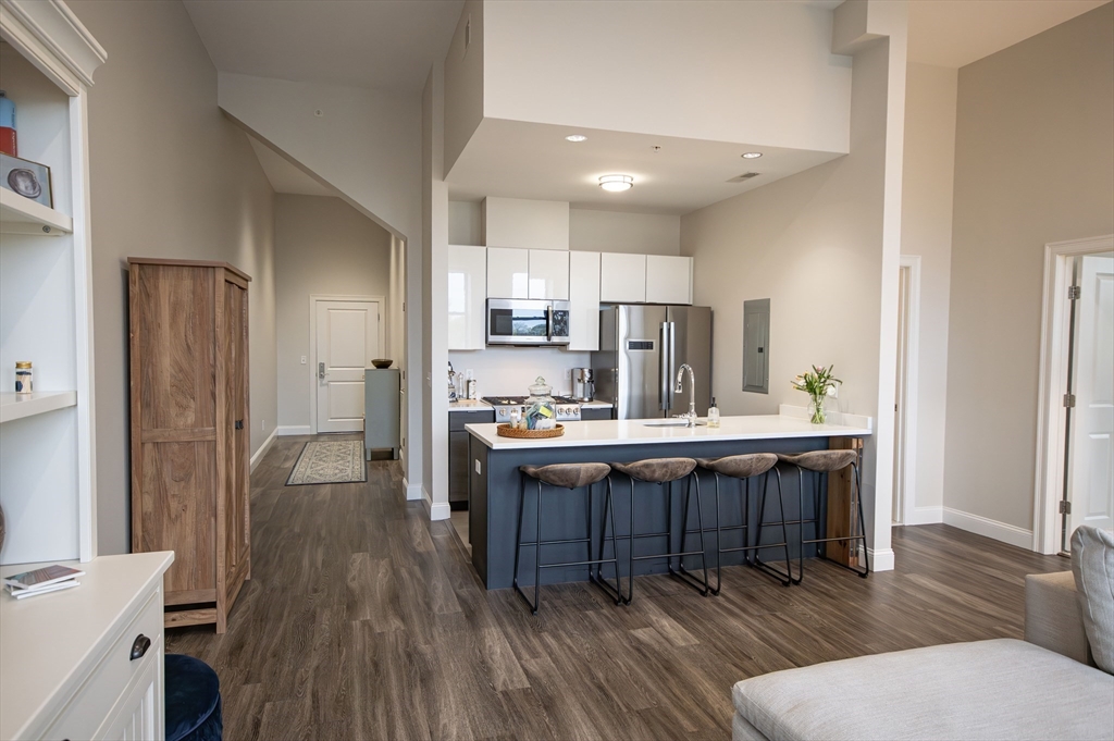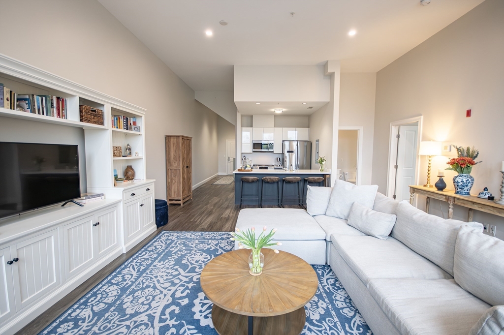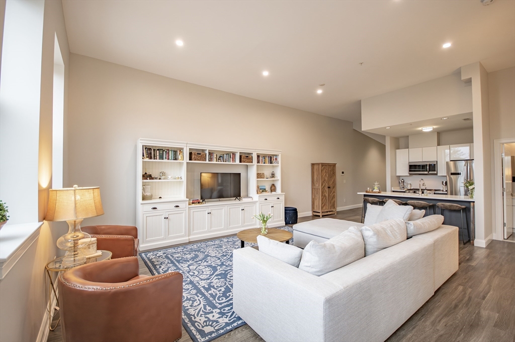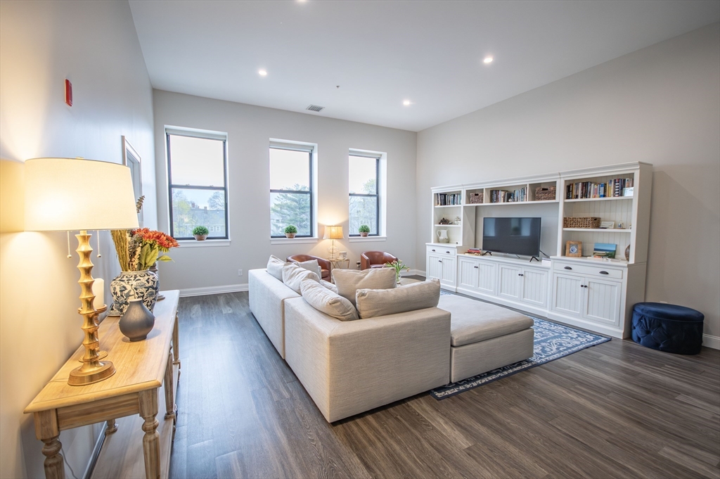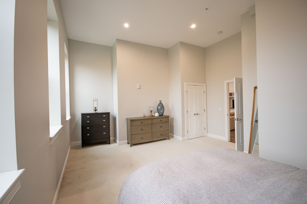 The best of both worlds - modern bright condo with charm and history. Huge windows and soaring 12' ceilings instantly draw you into this stunning residence. Modern kitchen with gas cooking, BOSCH appliances, and quartz countertops. 2 spacious bedrooms with generous closet space. Porcelanosa tiled bathroom. In unit laundry. Enjoy direct views of Butler's Pond and Dorothy Quincy Homestead - this corner unit affords the best views in the building and lends itself to a feeling of privacy. Exceptional morning light. 5 minute walk to Quincy Center T (Red Line & Commuter Rail), restaurants, & shops. Professionally managed elevator building, common deck, exercise room, and assigned parking. Don't miss this rare offering!