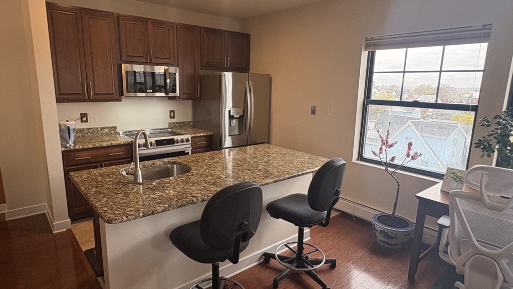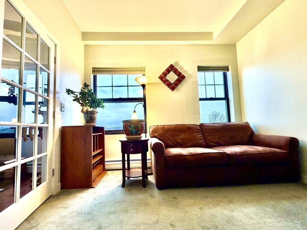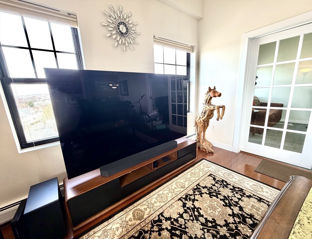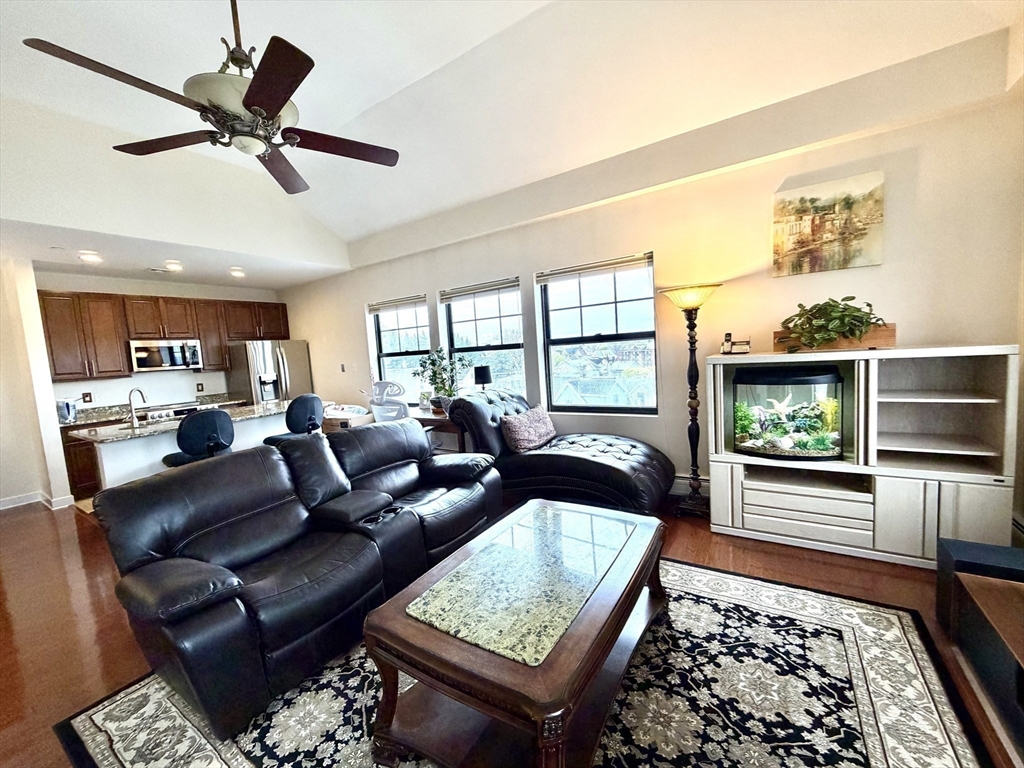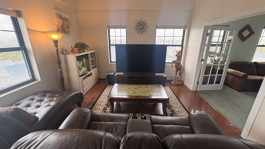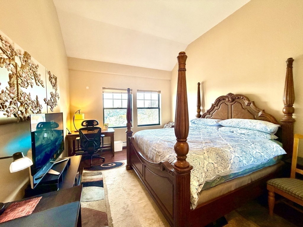 Available May 1st. Bright and spacious penthouse corner unit at Belmont Lofts featuring 12’ ceilings, hardwood floors, and a wall of windows with expansive city views. Open-concept layout with modern kitchen offering granite countertops and large island.Primary suite includes private bath and custom closet, plus additional walk-in closet suitable for office use. Second bedroom with French doors.Unit can be rented furnished or unfurnished, with all furniture shown in photos available upon request.In-unit washer/dryer, central A/C, extra storage, and 2 deeded tandem parking spaces. Conveniently located near downtown Malden with easy access to the MBTA Orange Line and major routes to Boston.