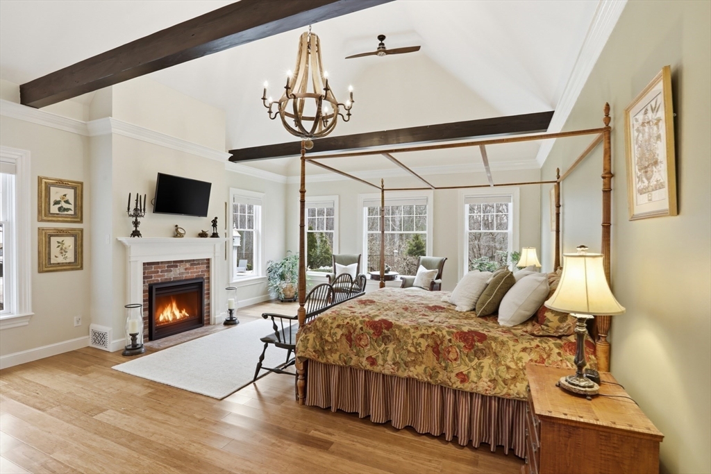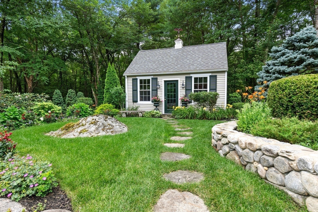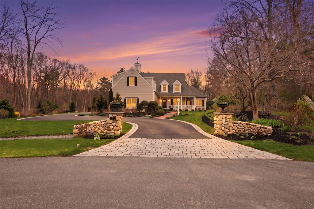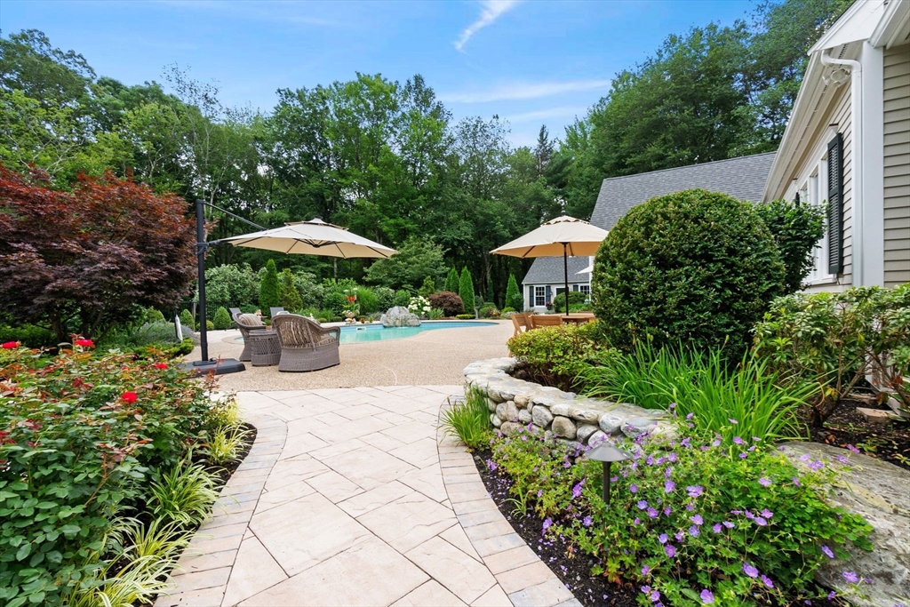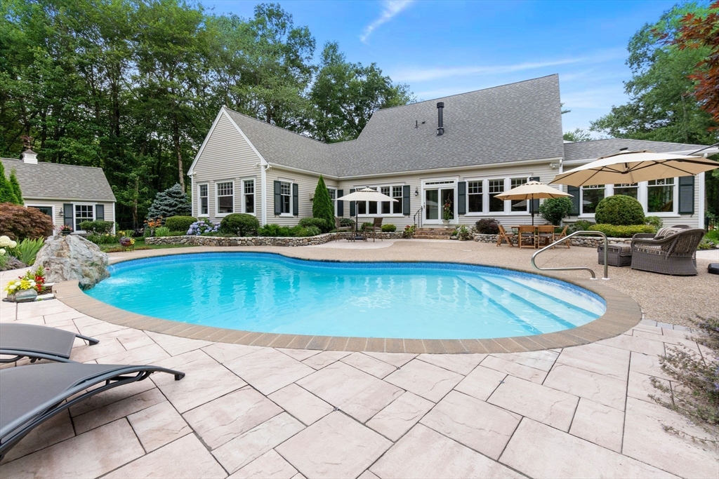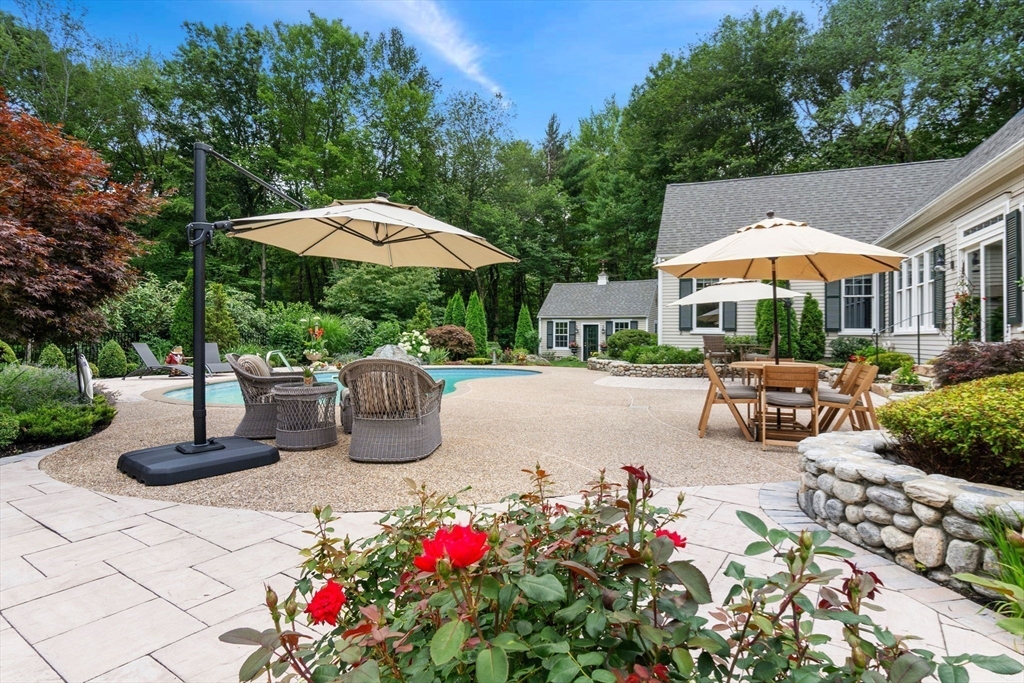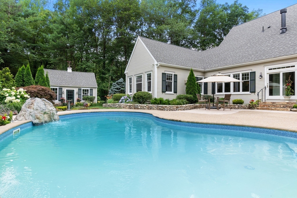 At the end of a quaint Newbury drive sits this exquisite Cape in a private, estate-like setting on just over three acres abutting conservation land. The beautifully designed grounds were created by one of Newburyport’s notable landscape designers, and the home was thoughtfully designed and crafted with exceptional attention to detail. The main level features an office or den, an expansive living room with a wood-burning fireplace, vaulted ceilings, exposed beams, and a wall of windows overlooking the gunite pool and terrace. A gracious dining room leads to a sunroom and a chef’s kitchen with custom white cabinetry, quartz counters, tile backsplash, and Thermador appliances. The first-floor primary suite offers a gas fireplace, soaring ceilings, walk-in closet, and spa-like bath. Upstairs are a second primary suite and two additional en-suite bedrooms. Three-bay garage, home gym, and ample storage. Ten minutes to downtown Newburyport, Plum Island beaches and under five minutes to Rt 95.