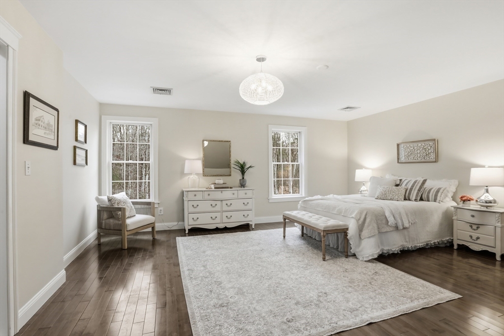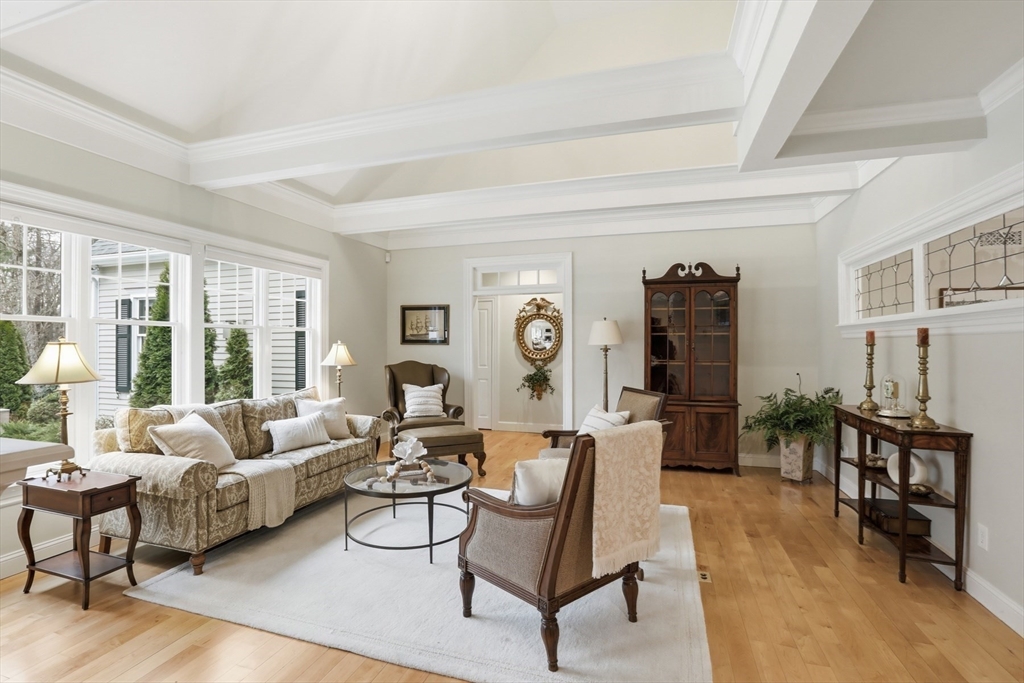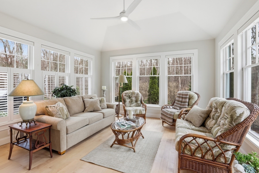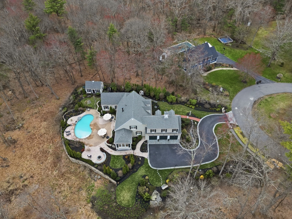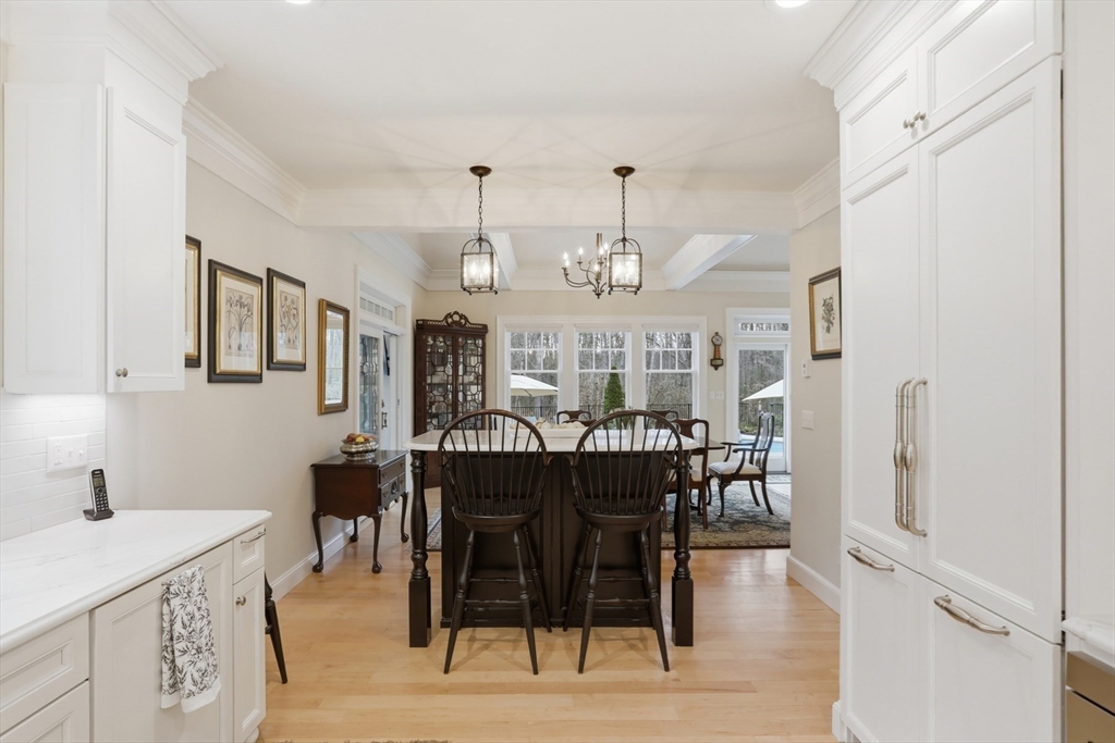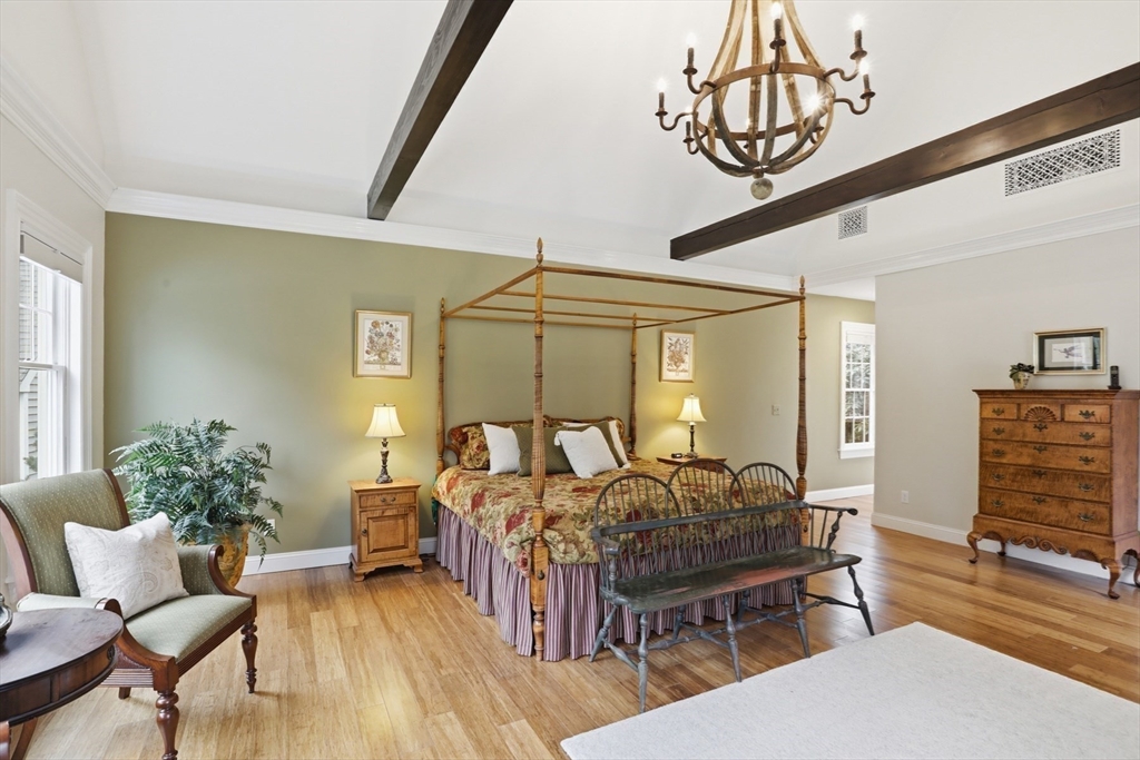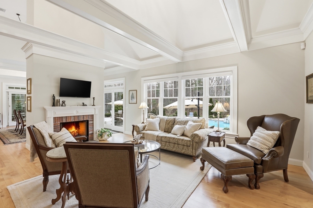At the end of a quaint Newbury drive sits this exquisite Cape in a private, estate-like setting on just over three acres abutting conservation land. The beautifully designed grounds were created by one of Newburyport’s notable landscape designers, and the home was thoughtfully designed and crafted with exceptional attention to detail. The main level features an office or den, an expansive living room with a wood-burning fireplace, vaulted ceilings, exposed beams, and a wall of windows overlooking the gunite pool and terrace. A gracious dining room leads to a sunroom and a chef’s kitchen with custom white cabinetry, quartz counters, tile backsplash, and Thermador appliances. The first-floor primary suite offers a gas fireplace, soaring ceilings, walk-in closet, and spa-like bath. Upstairs are a second primary suite and two additional en-suite bedrooms. Three-bay garage, home gym, and ample storage. Ten minutes to downtown Newburyport, Plum Island beaches and under five minutes to Rt 95.